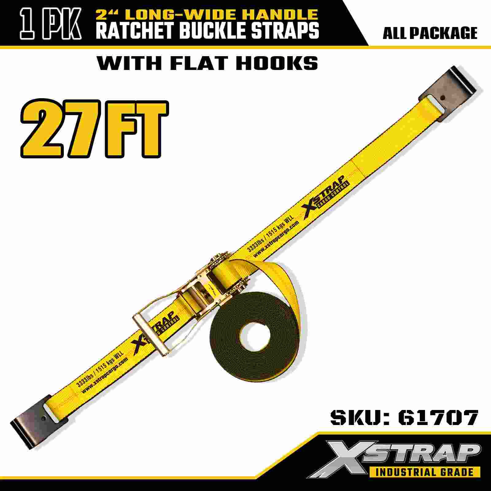 Xstrap 61707 Long Wide Handle Ratchet Straps 2" x 27ft (1-Pack) - Flat Hooks, 10,000 lbs Break Strength, Heavy Duty Tie Down Strap for Secure Transport