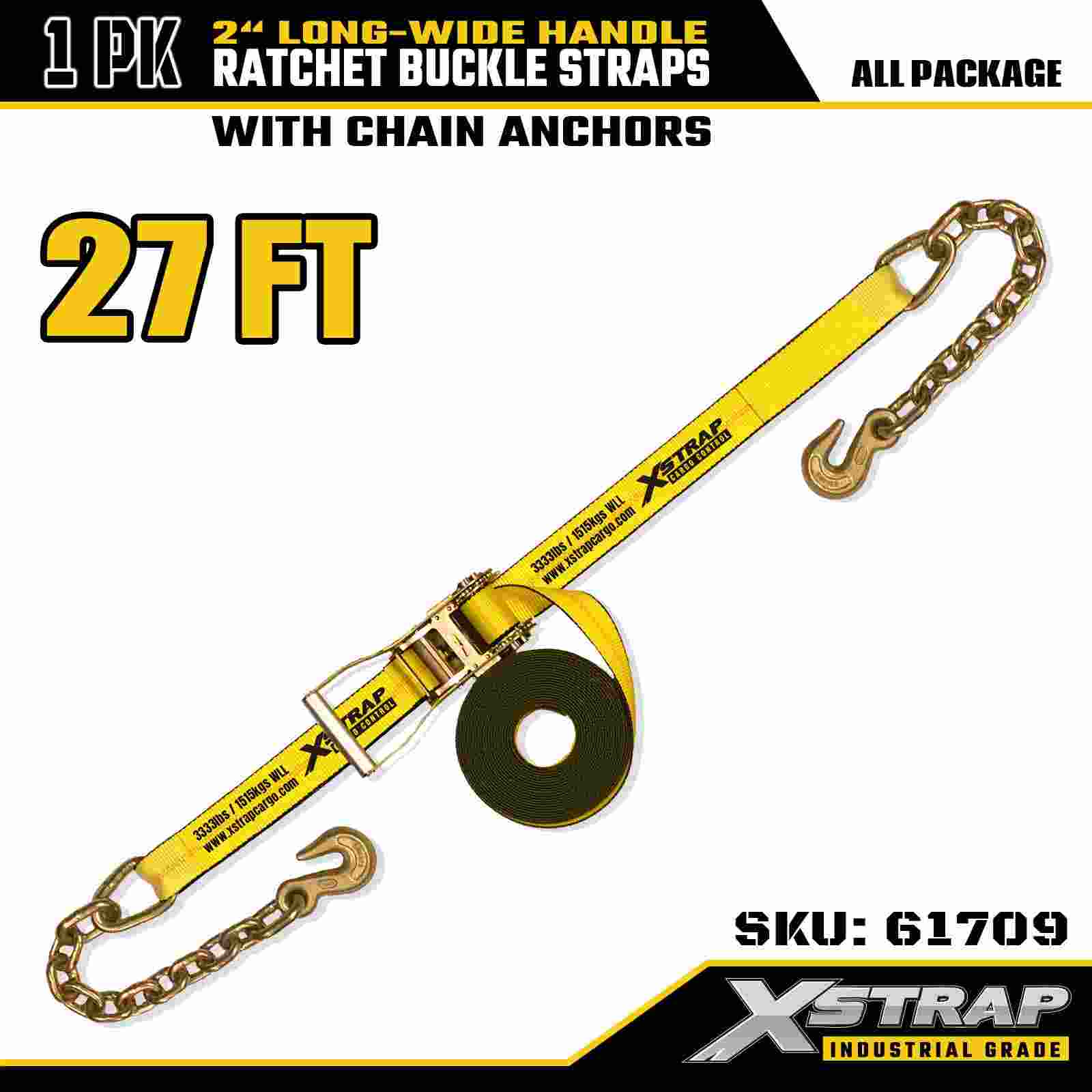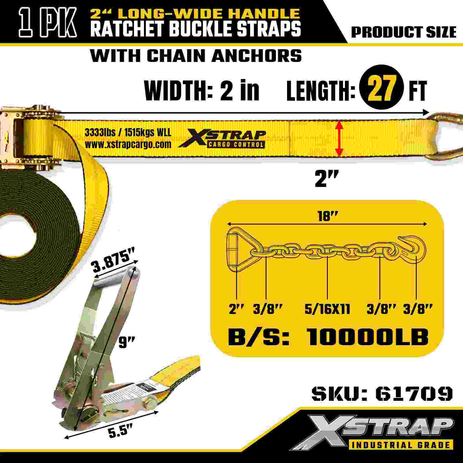 Xstrap 61709 Long Wide Handle Ratchet Buckle Straps 2" x 27ft (1-Pack) with Chain Hooks, 10,000 lbs Break Strength, Heavy Duty Tie Down Strap for Secure Transport
