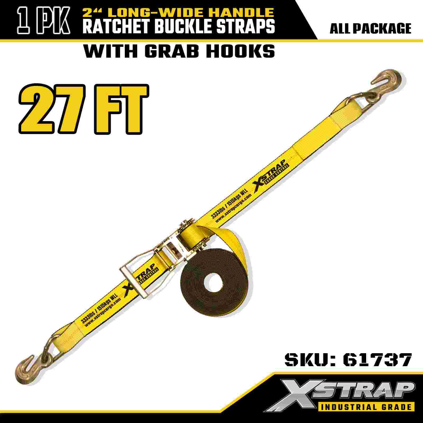Xstrap 61737 Heavy Duty 2" x 27' 1PK Ratchet Strap with Grab Hooks Yellow, WLL 3,333 lbs, Long Wide Handle Ratchet Tie Down Strap for Machinery & Equipment