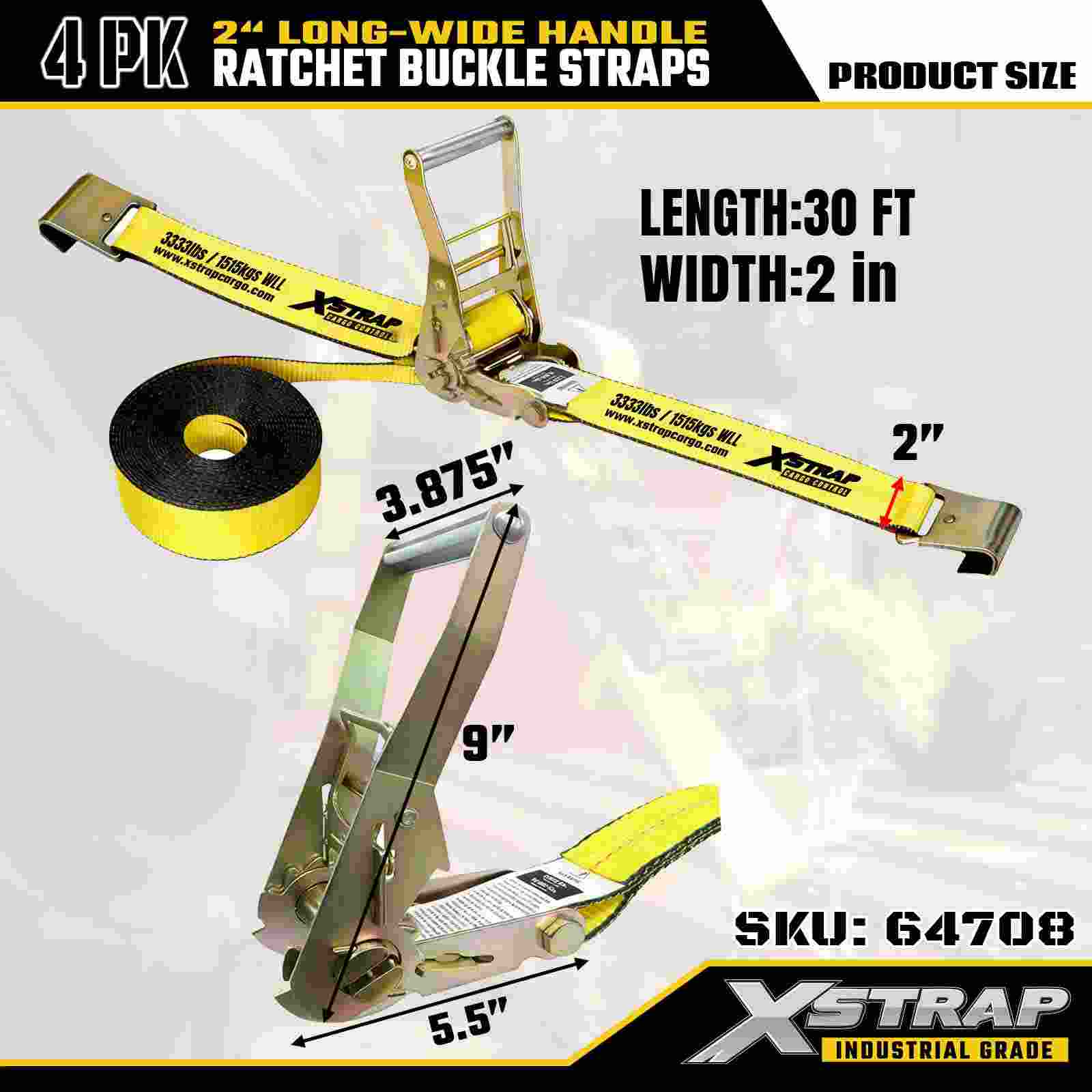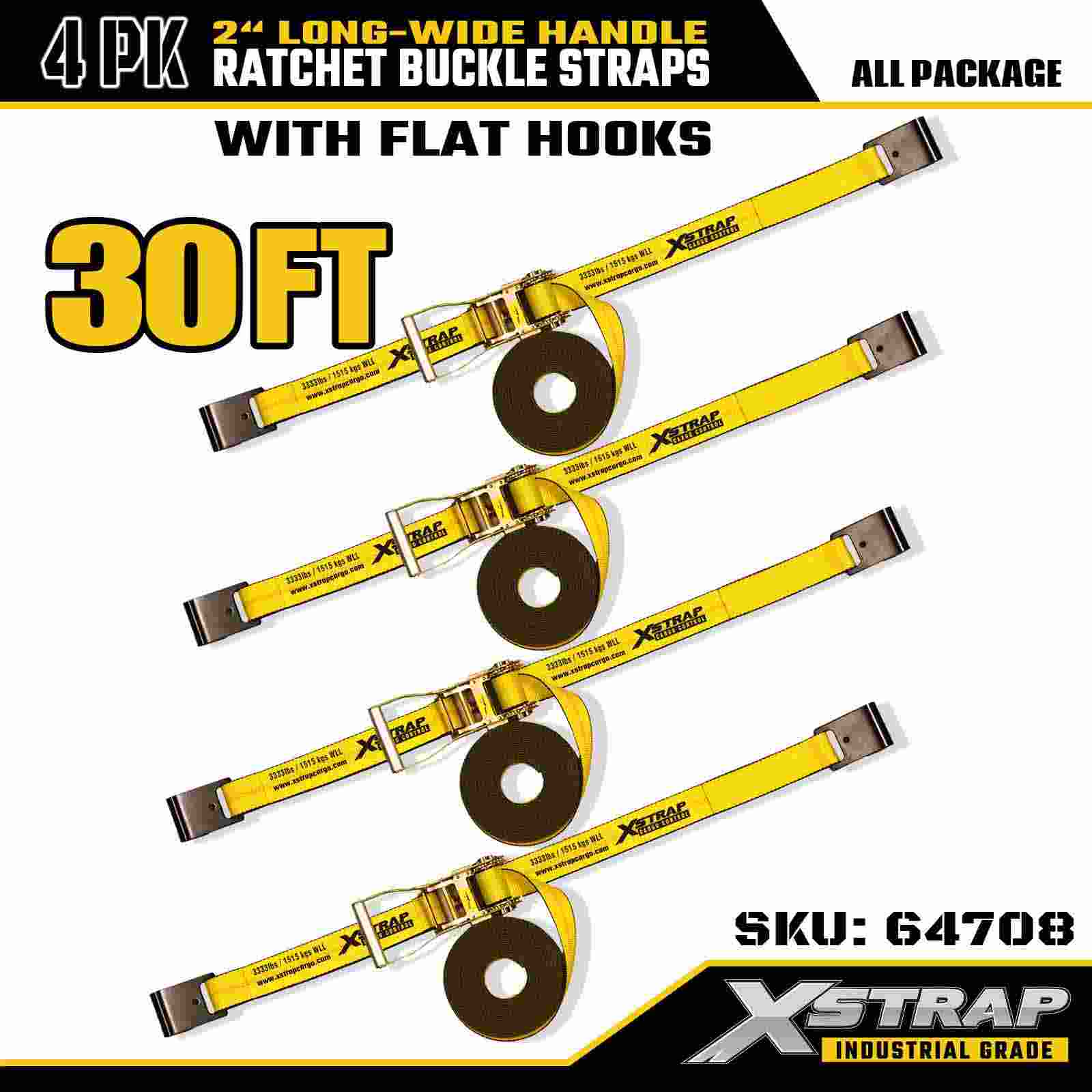 Xstrap 64708 2" x 30ft Extended Handle Ratchet Buckle Straps (4-Pack) – Flat Hooks, 10,000 lbs Rated Strength, Industrial Cargo Control Solution