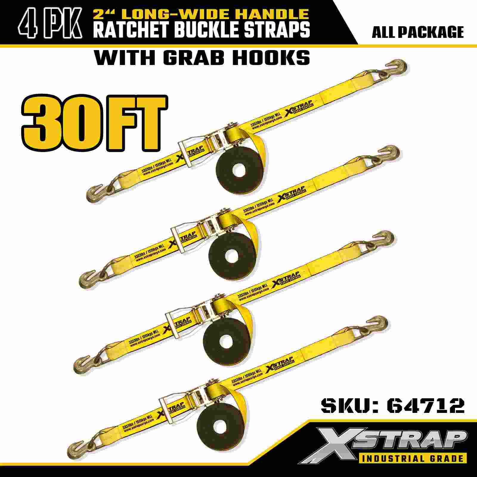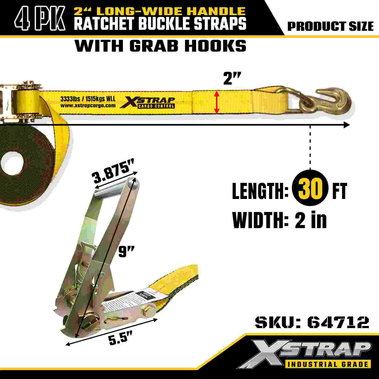 Xstrap 64712 2" x 30ft Long Wide Handle Ratchet Buckle Straps (4-Pack) – Grab Hooks, 10,000 lbs Capacity, Heavy Duty Tie Down for Large Equipment Transport