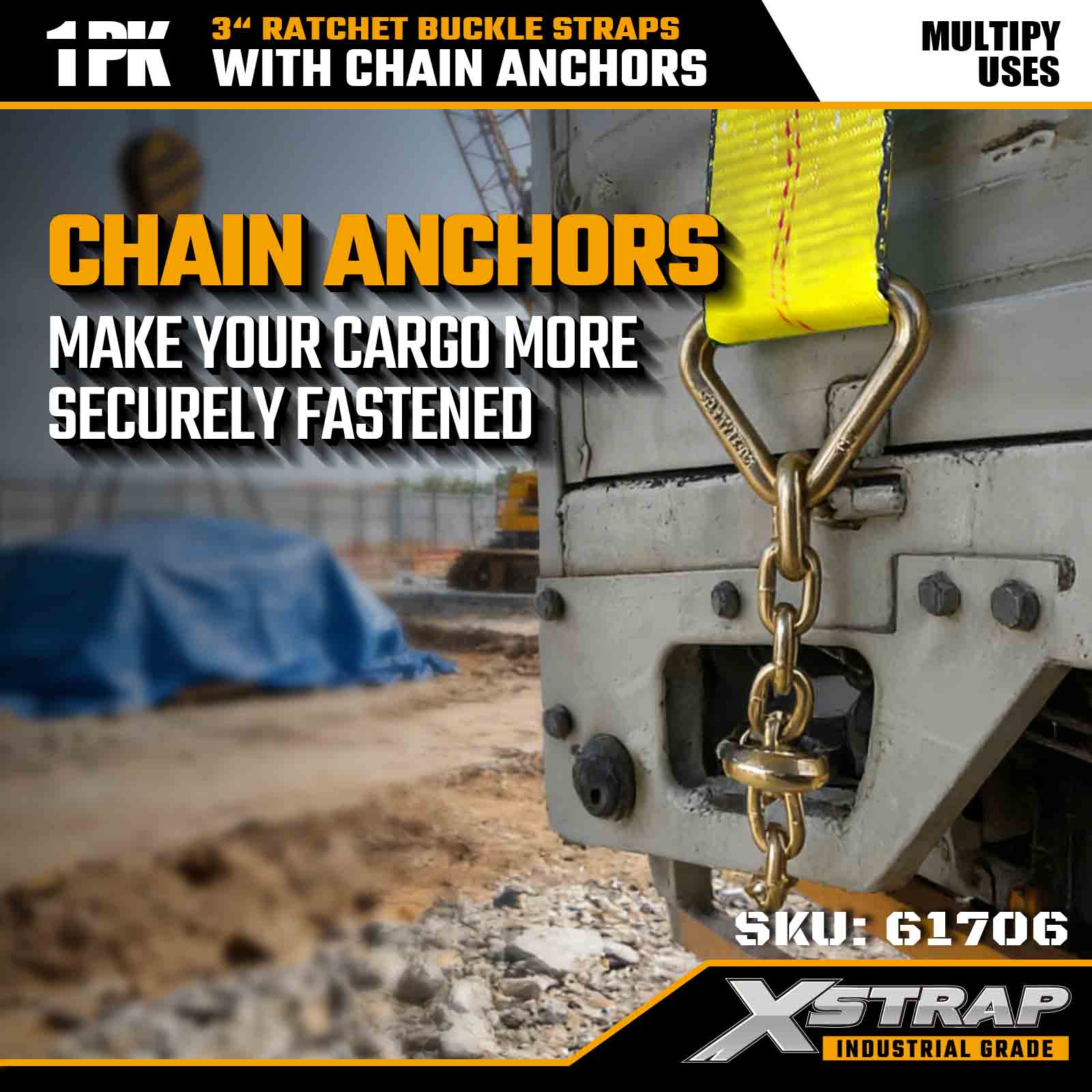- Forged Chain Anchor Ends for Maximum Grip:Designed with industrial-grade chain anchors that lock firmly into trailer rails and stake pockets, providing superior stability for heavy or shifting loads.