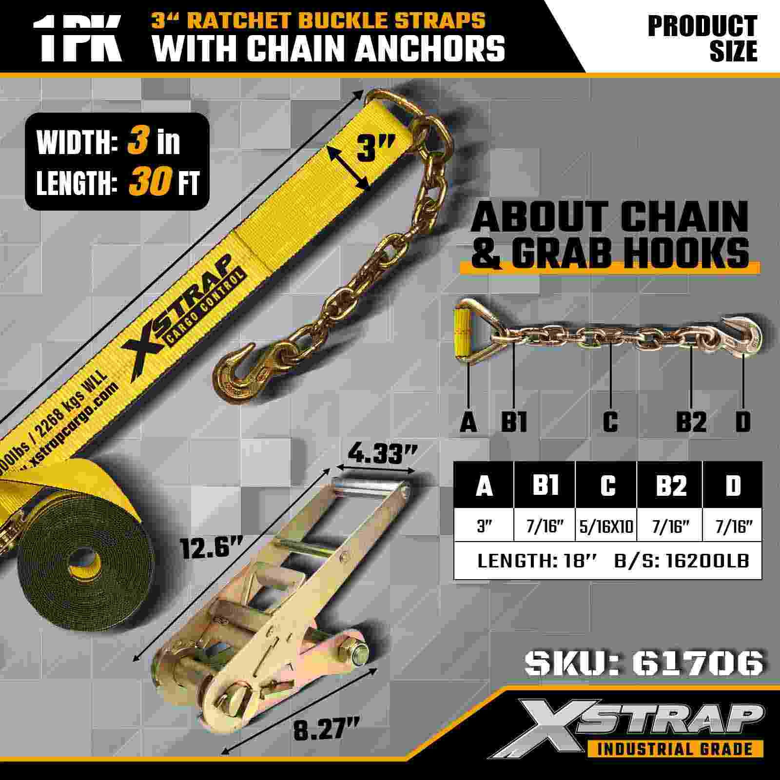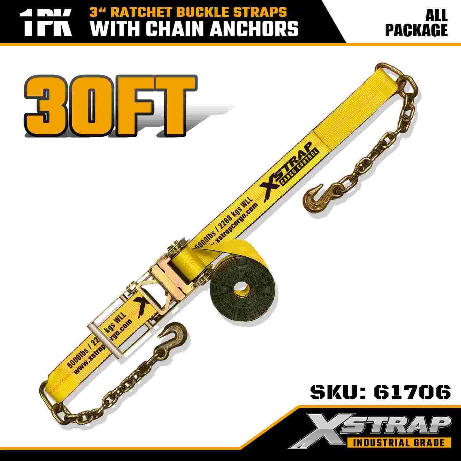 The Xstrap 61706 3" × 30ft Ratchet Buckle Strap (1-Pack) is engineered for heavy-duty cargo securement, featuring forged chain anchors and a high-tension ratchet system. With a 5,000 lbs WLL and 15,000 lbs break strength, it delivers reliable performance for flatbeds, machinery transport, and industrial hauling.