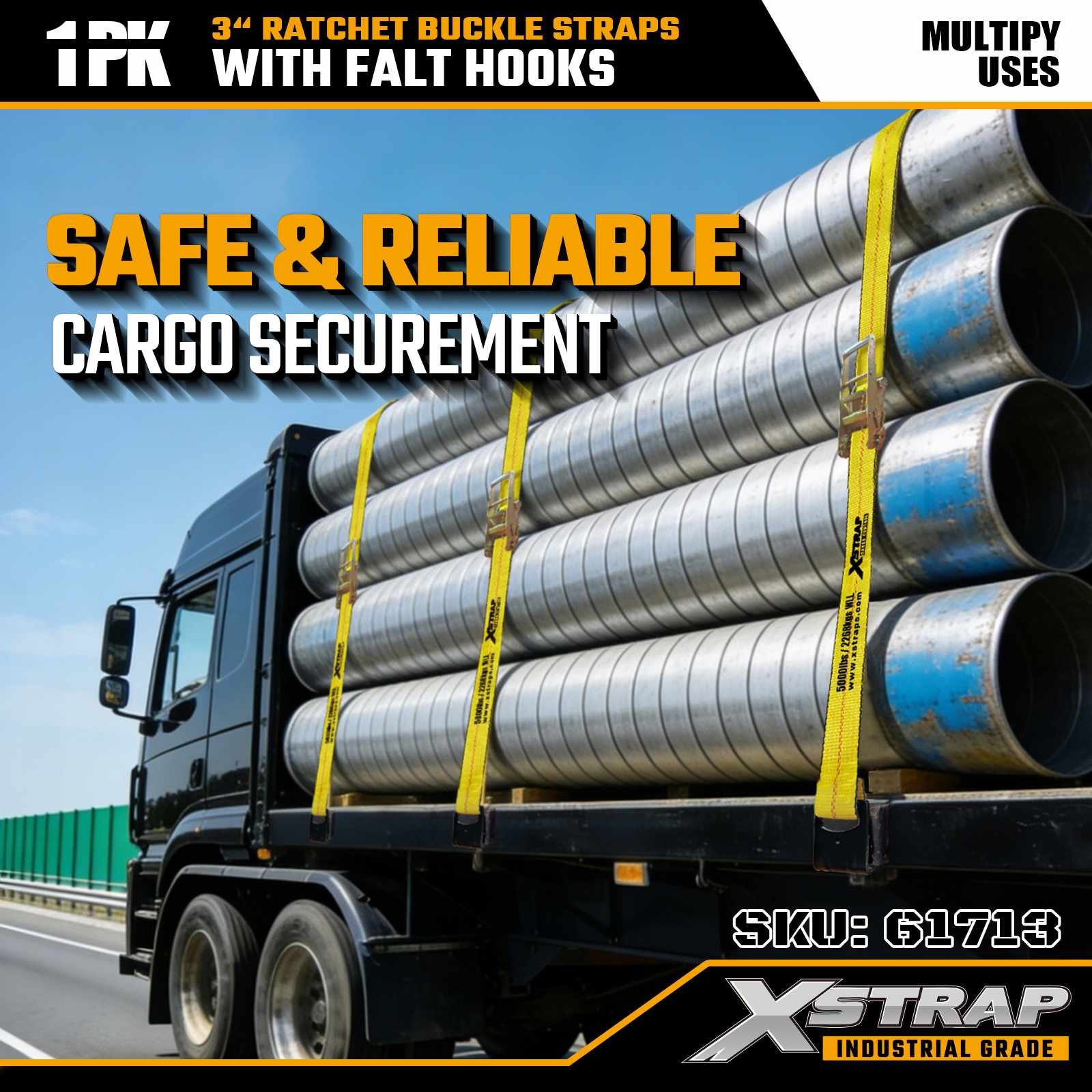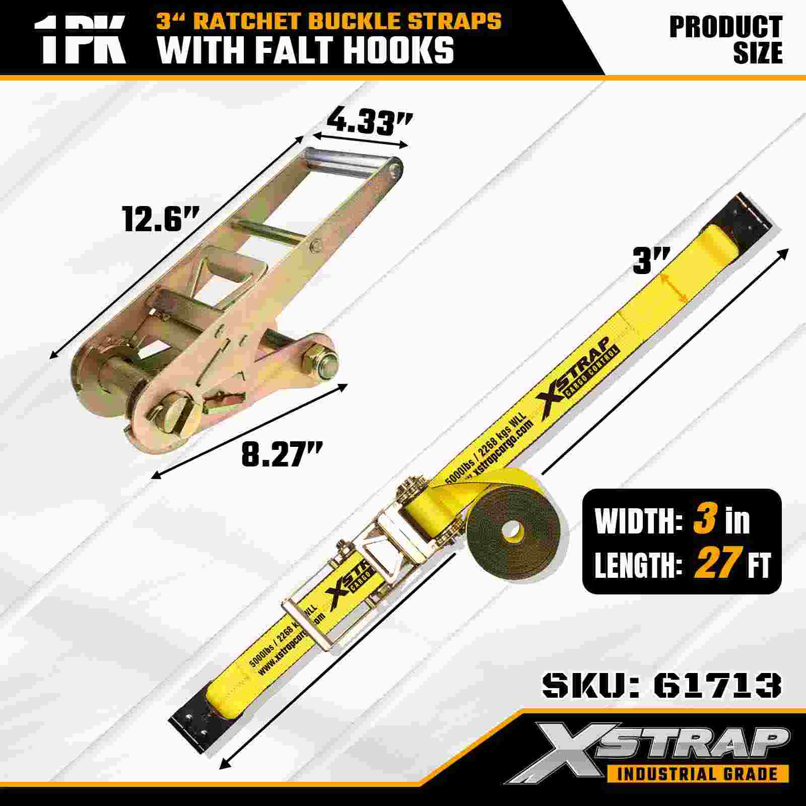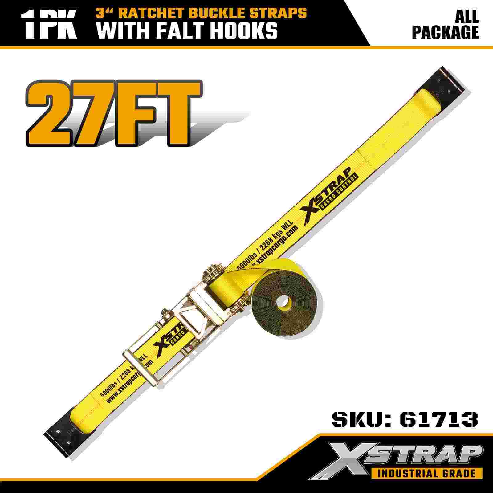 Xstrap 61713 3" x 27ft Ratchet Buckle Straps (1-Pack) Flat Hooks, 5,000lbs Load Capacity 15,000 lbs Break Strength, Heavy Duty Tie Down for Trucks, Trailers, and Industrial Cargo Transport.