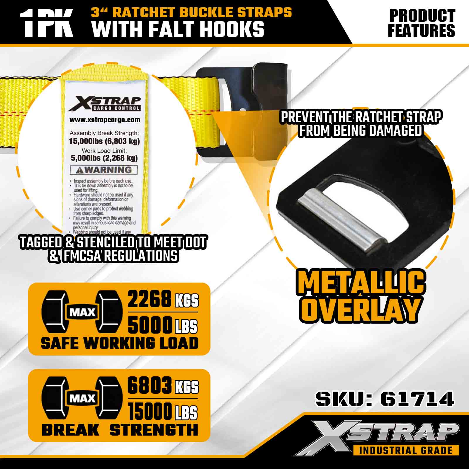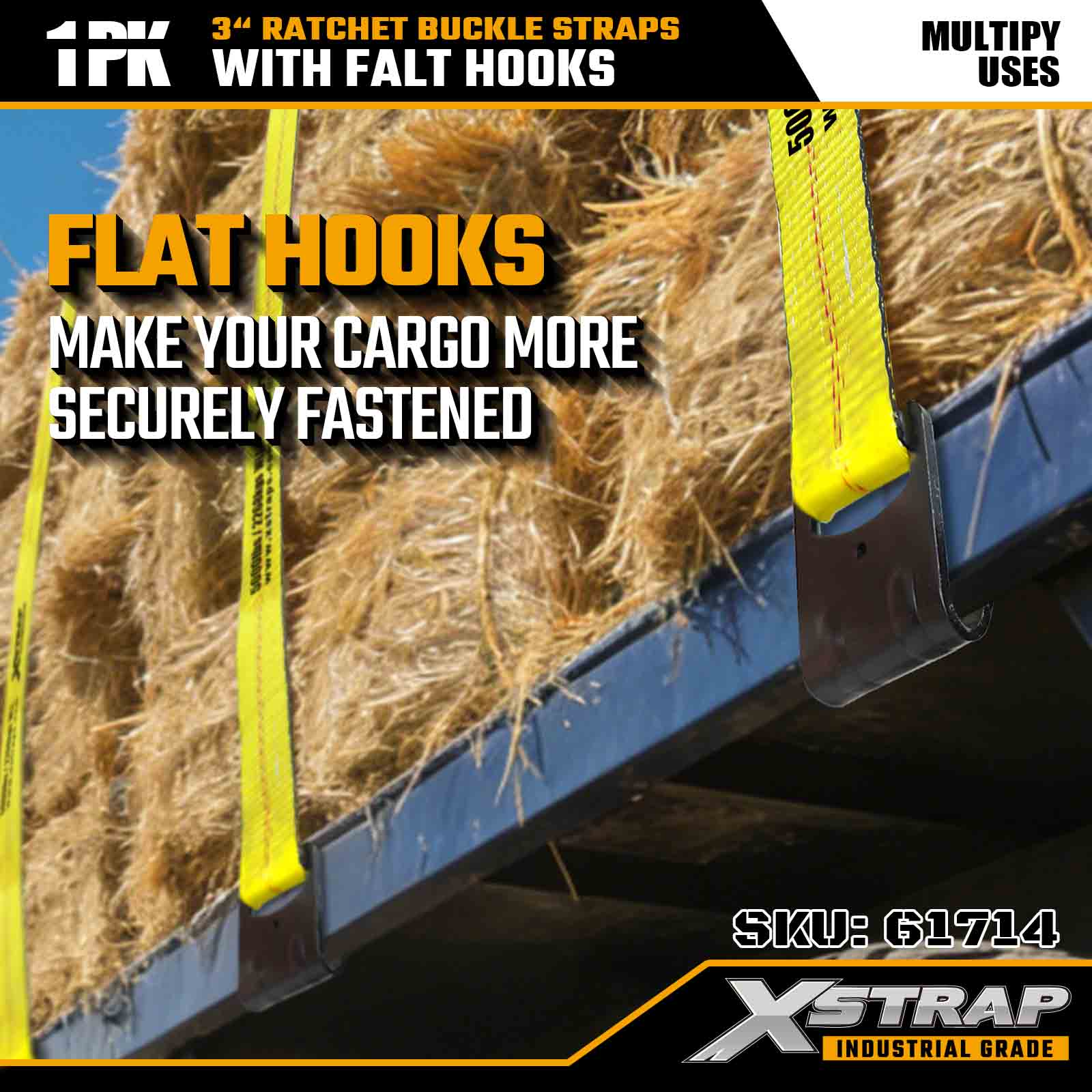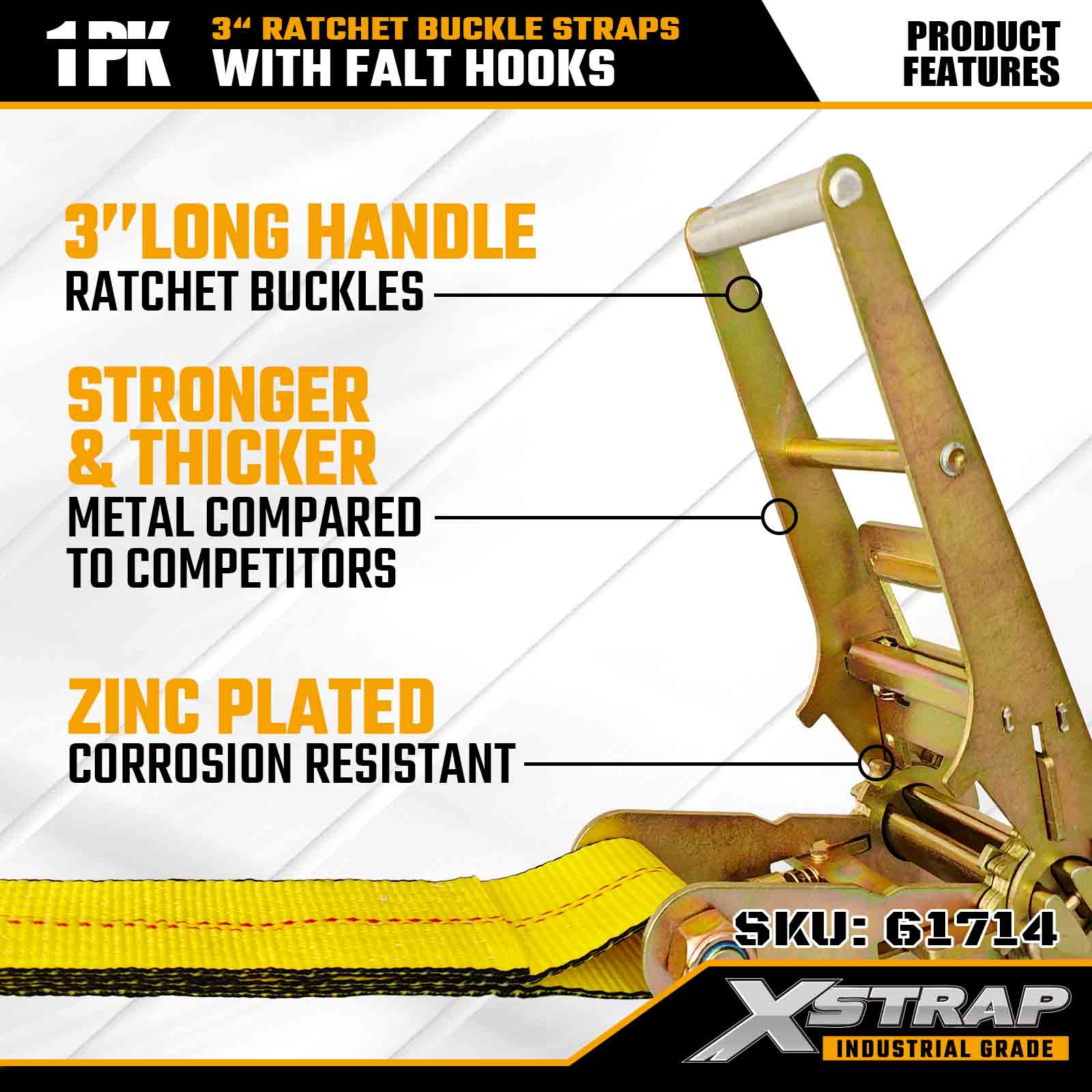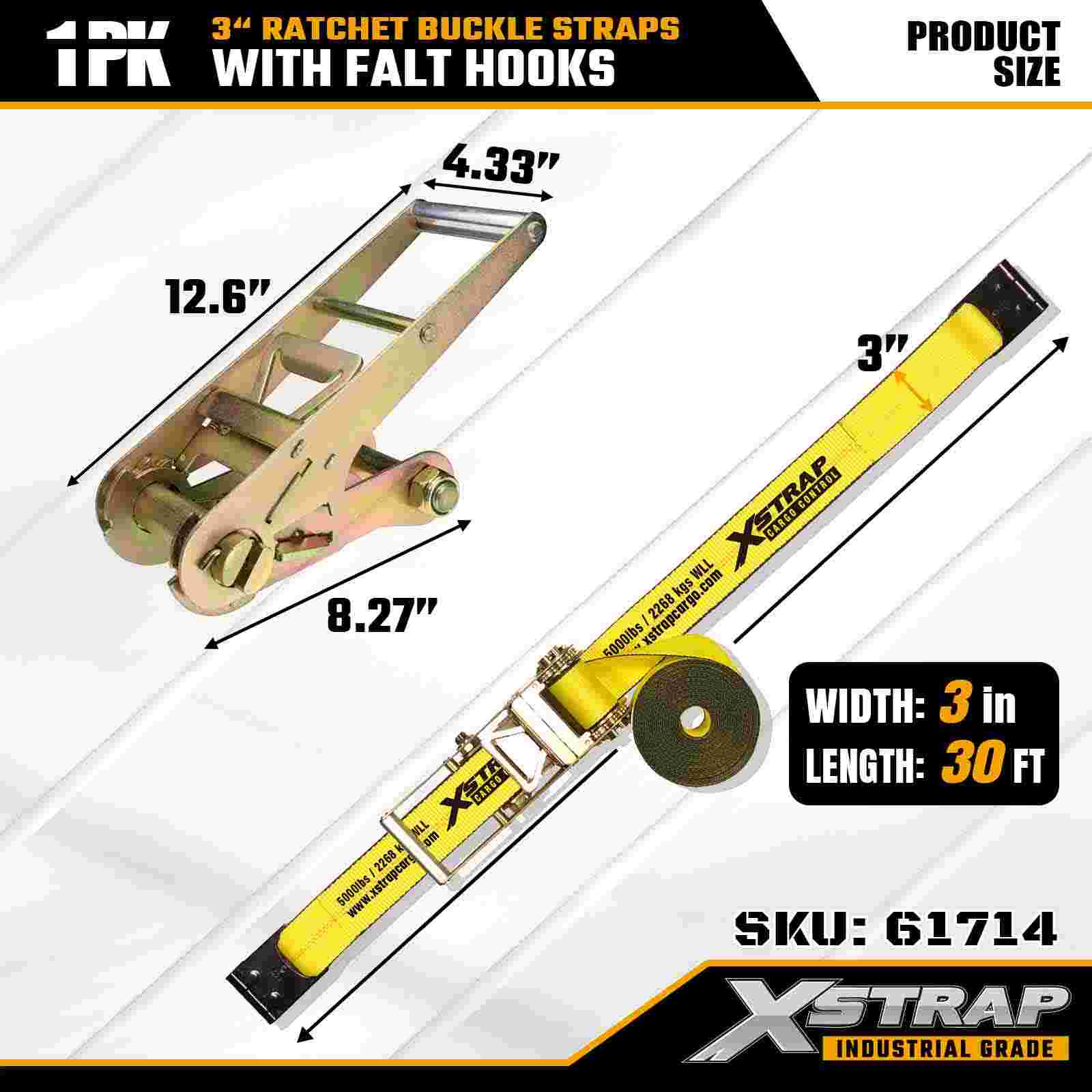 Xstrap 61714 3" x 30ft Ratchet Buckle Straps (1-Pack) – Flat Hooks, 5,000 lbs Load Capacity, 15,000 lbs Break Strength, Heavy Duty Tie Down for Trucks, Trailers, and Industrial Cargo Transport.