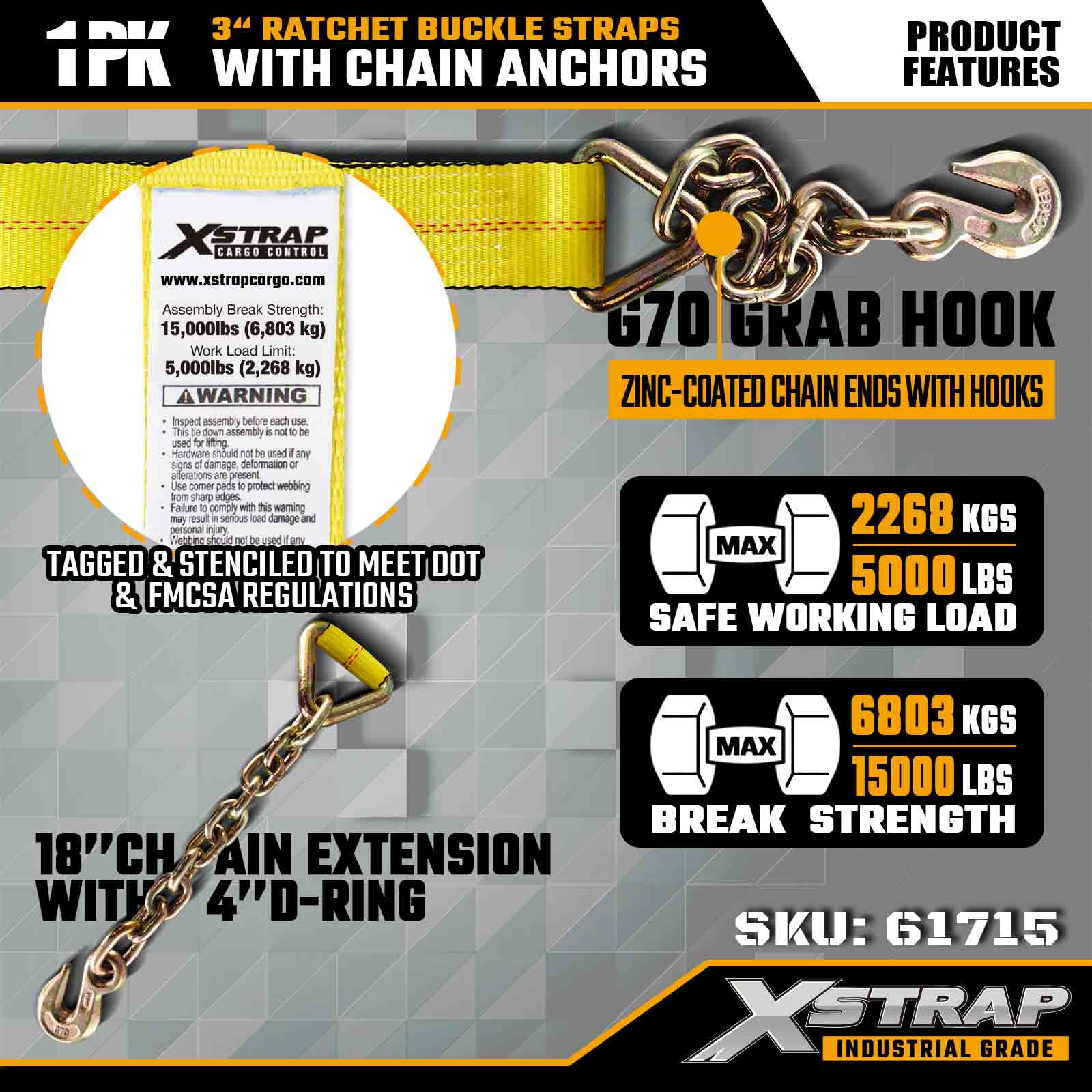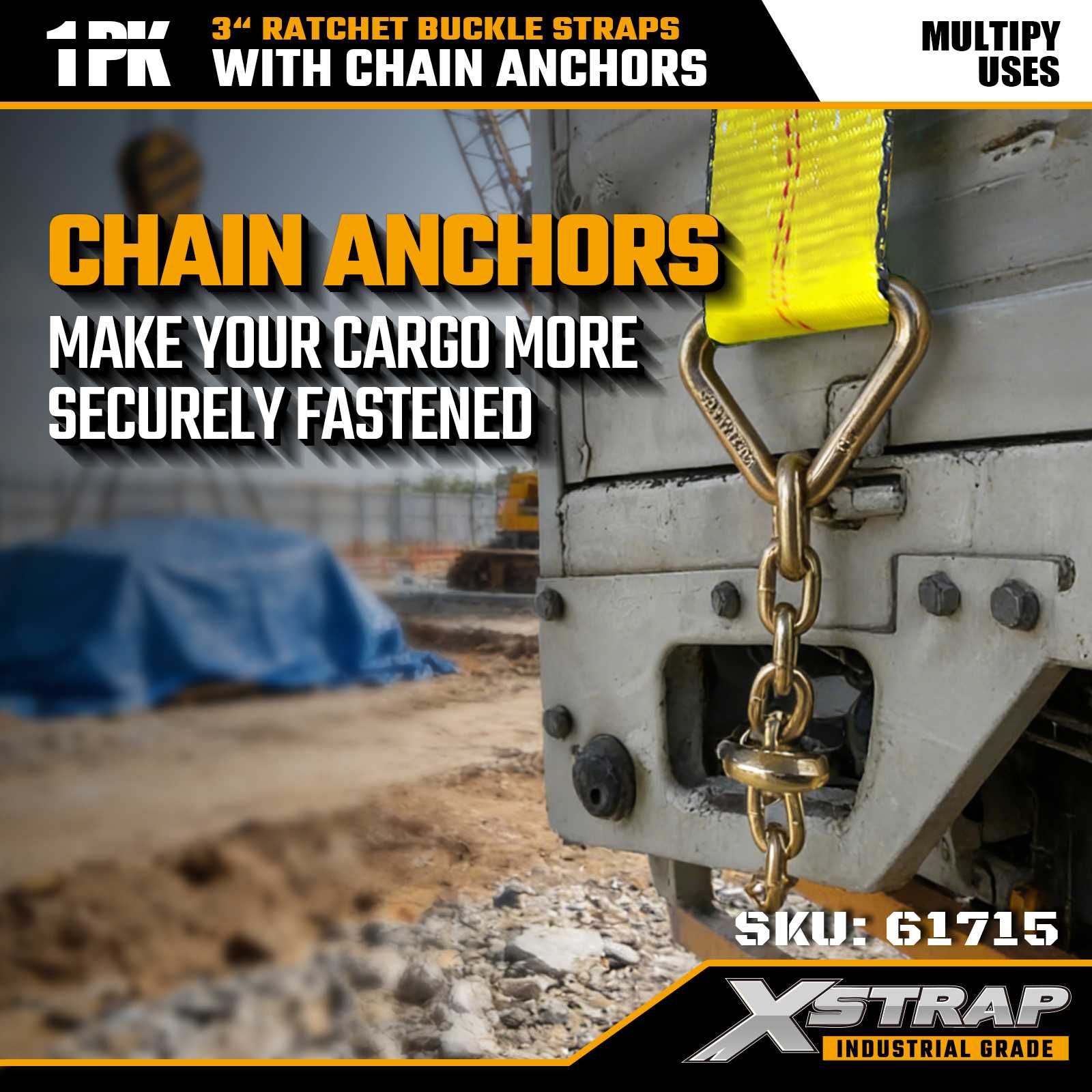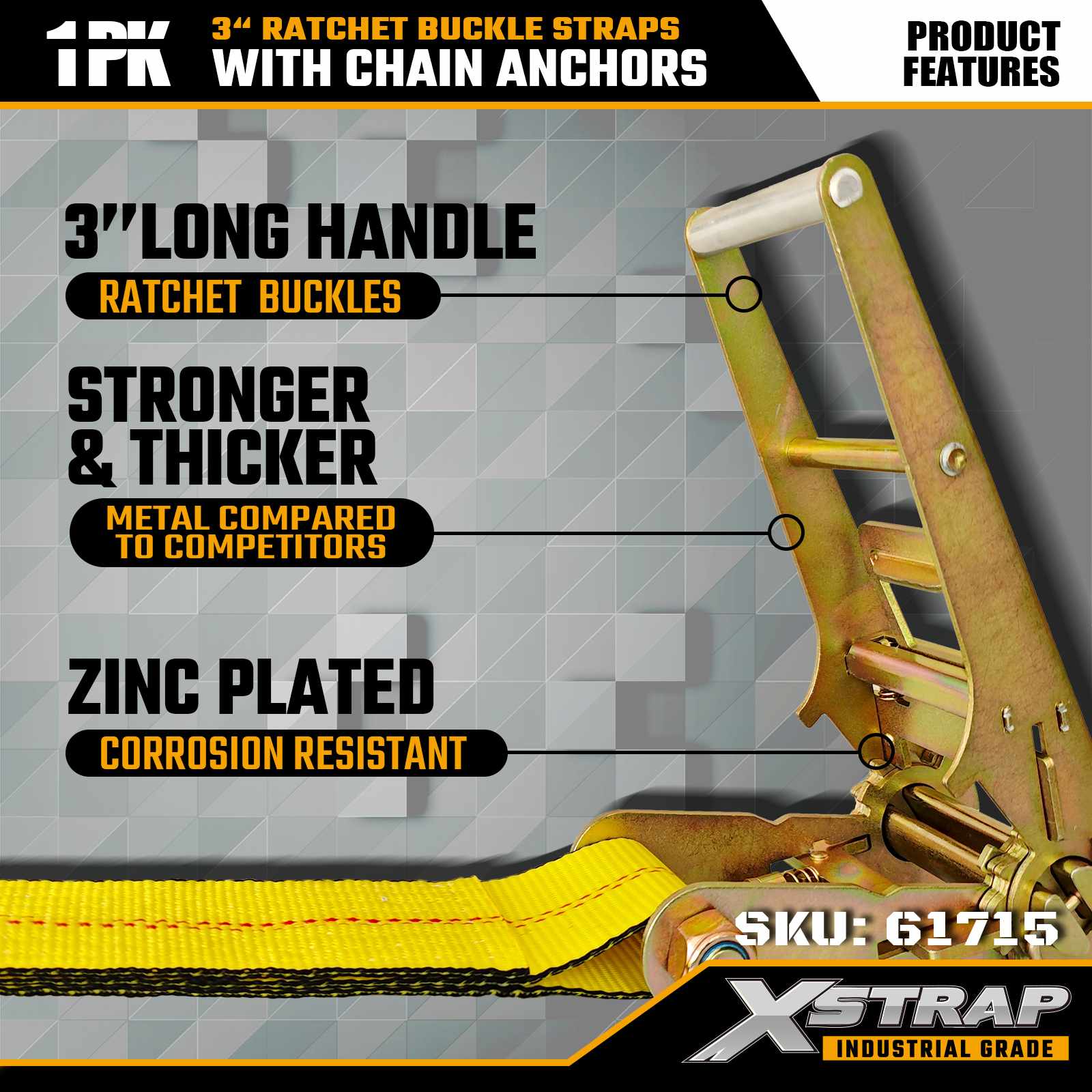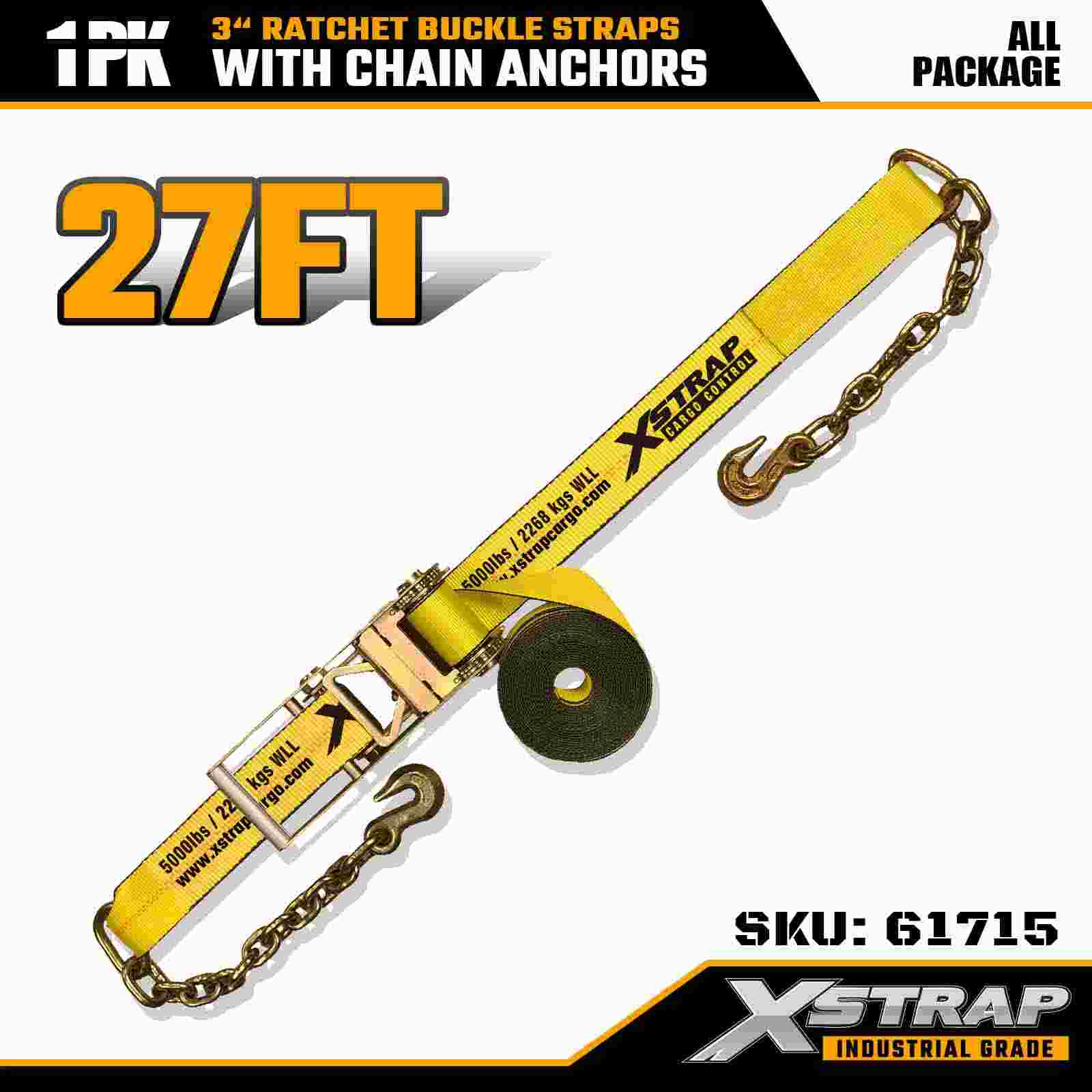 Xstrap 61715 3" x 27ft Ratchet Buckle Straps (1-Pack) – Chain Anchors, 5,000 lbs Load Capacity, 15,000 lbs Break Strength. Designed for heavy-duty cargo control, these straps combine industrial-grade webbing with chain anchor ends for maximum security in trucks, trailers, and construction transport.