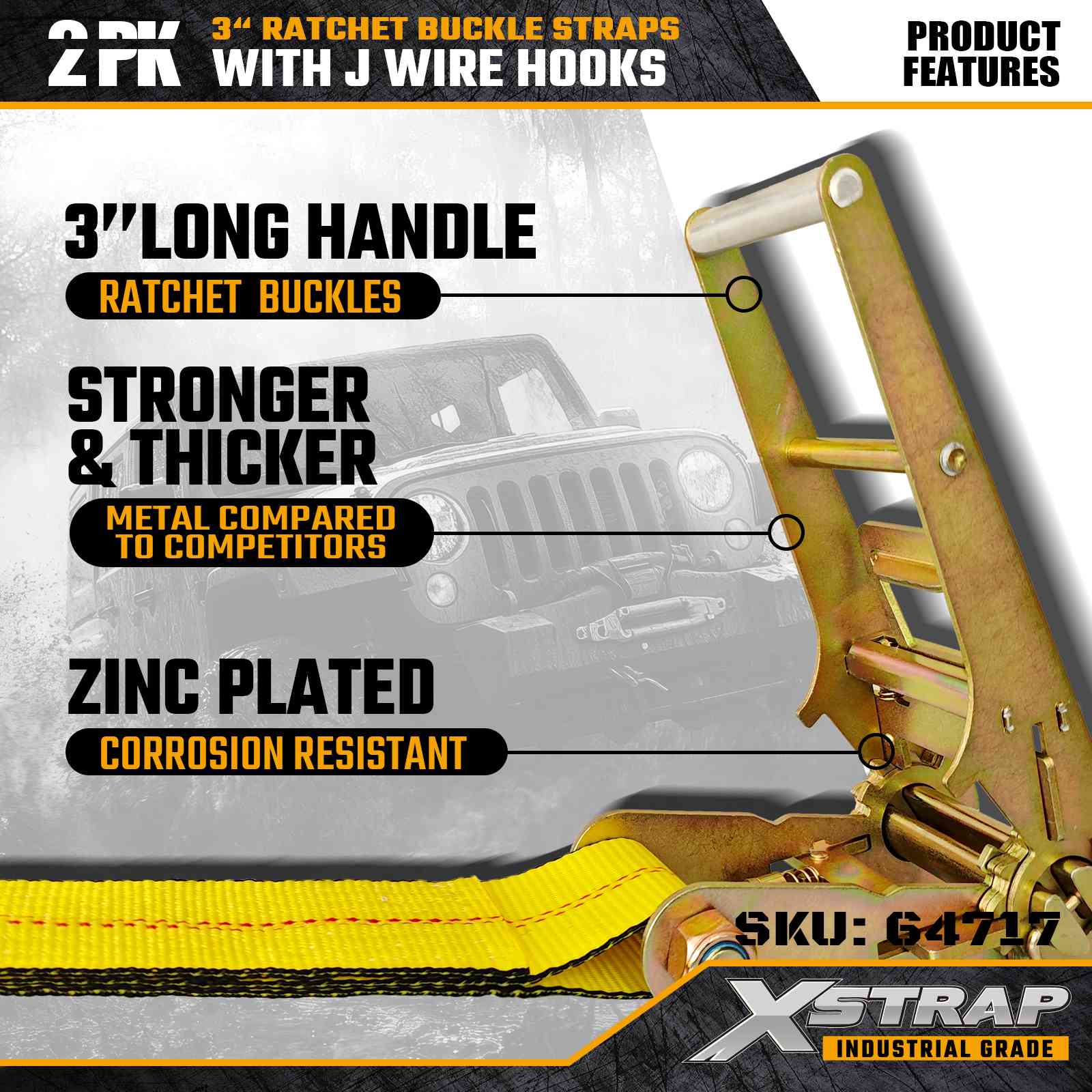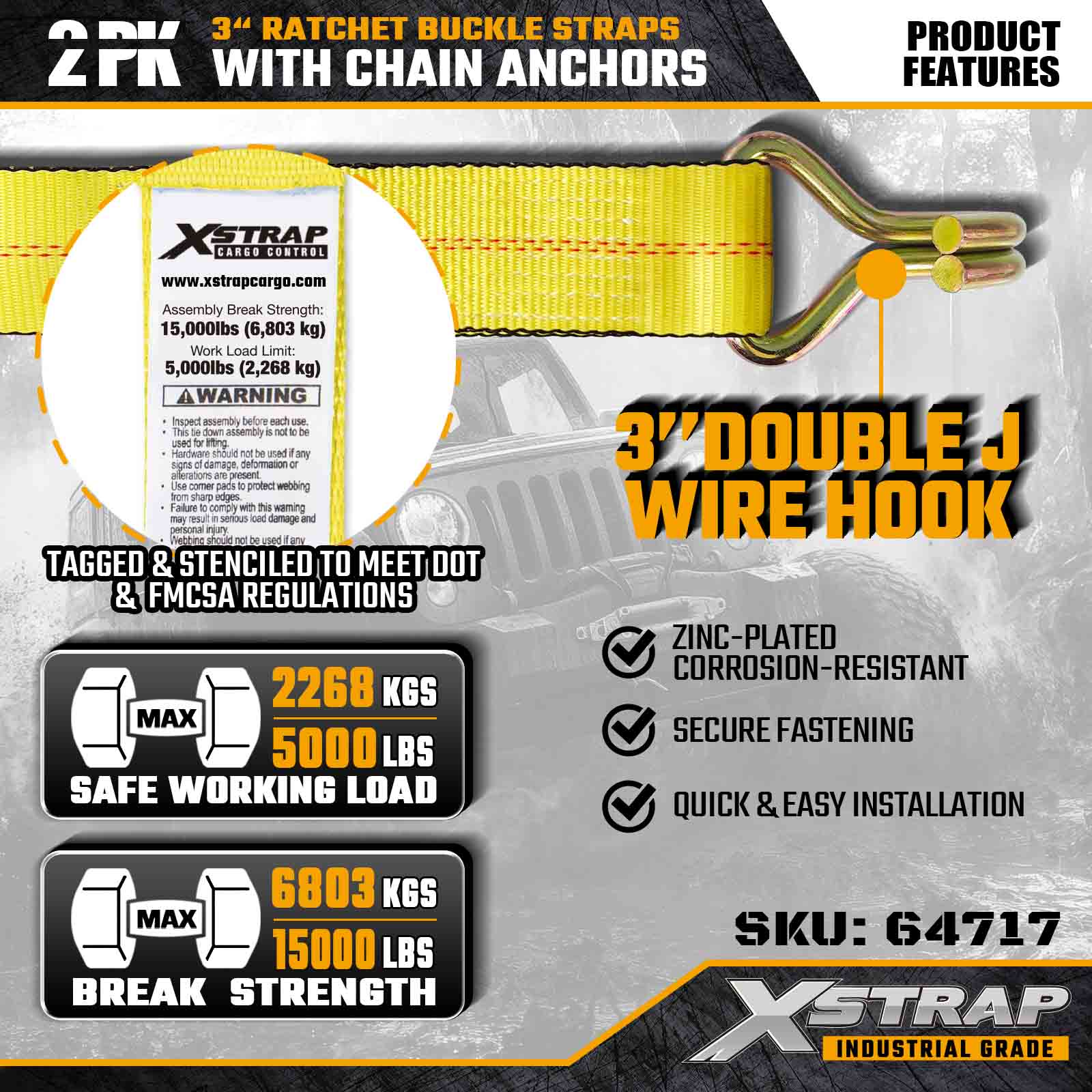 Xstrap 64717 3" × 30ft Ratchet Buckle Straps (2-Pack) are engineered for professional cargo securement, featuring reinforced Wire Hooks and a heavy-duty ratchet mechanism. With a 5,000 lbs Working Load Limit and 15,000 lbs Break Strength, these straps deliver reliable, long reach performance for flatbeds, machinery transport, and industrial hauling operations.