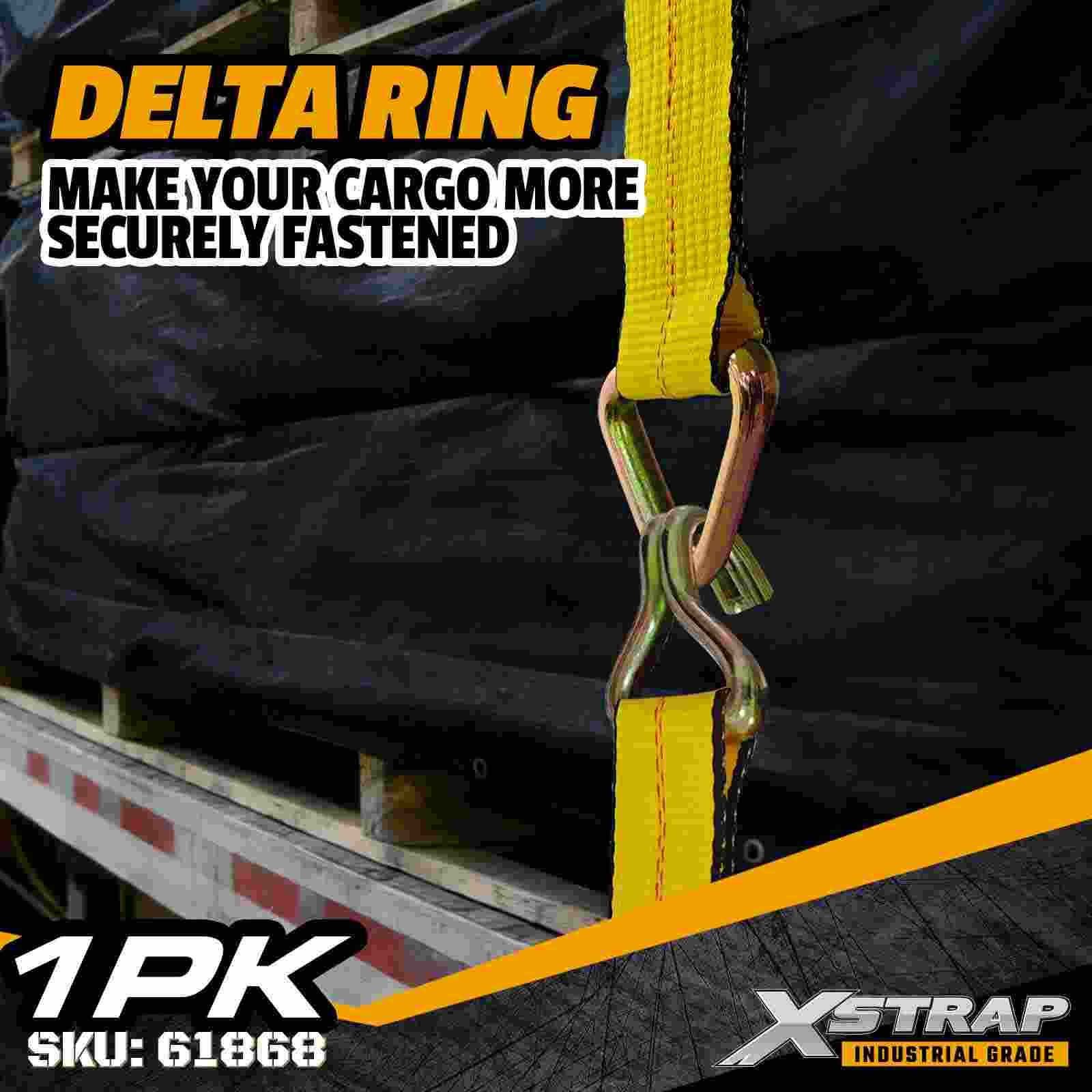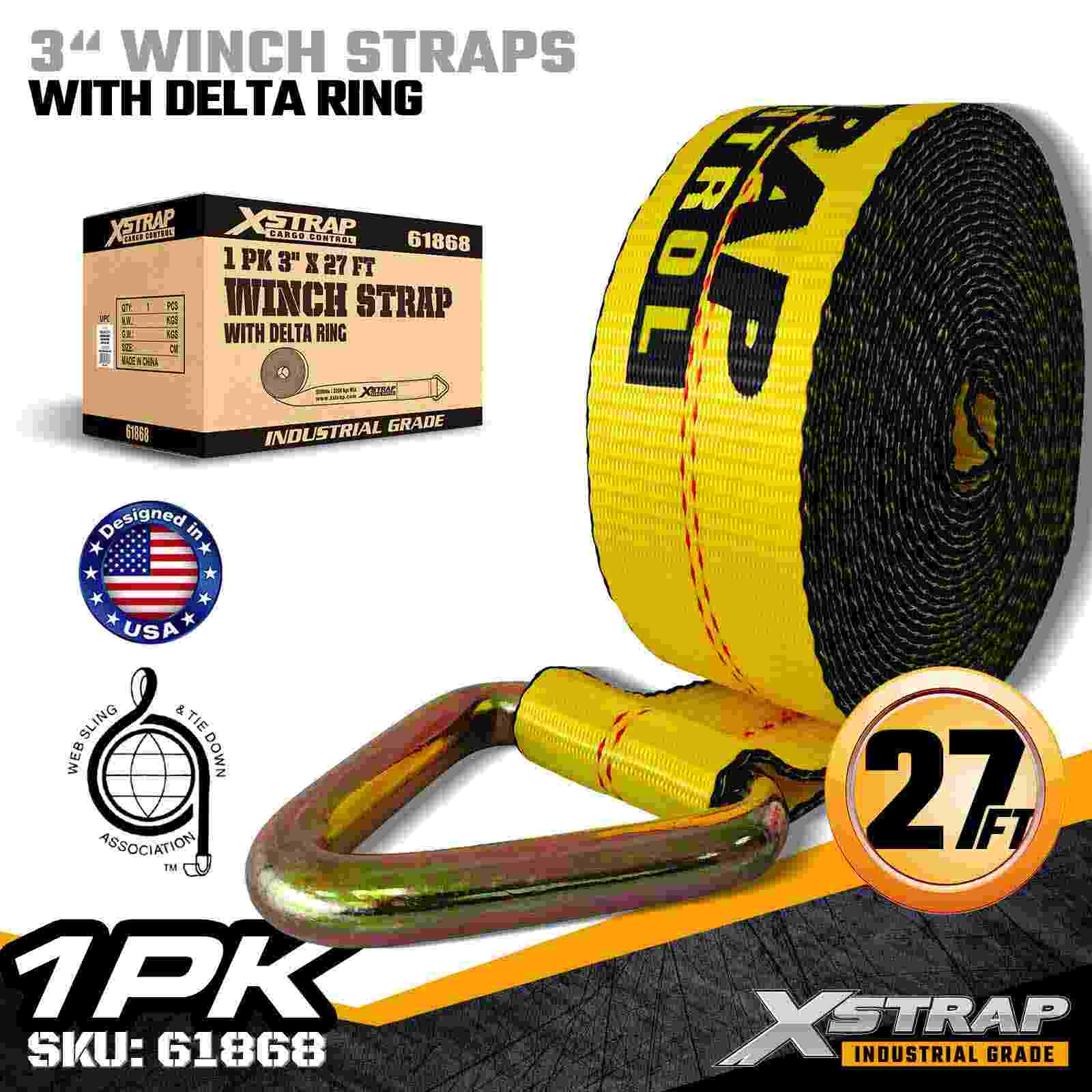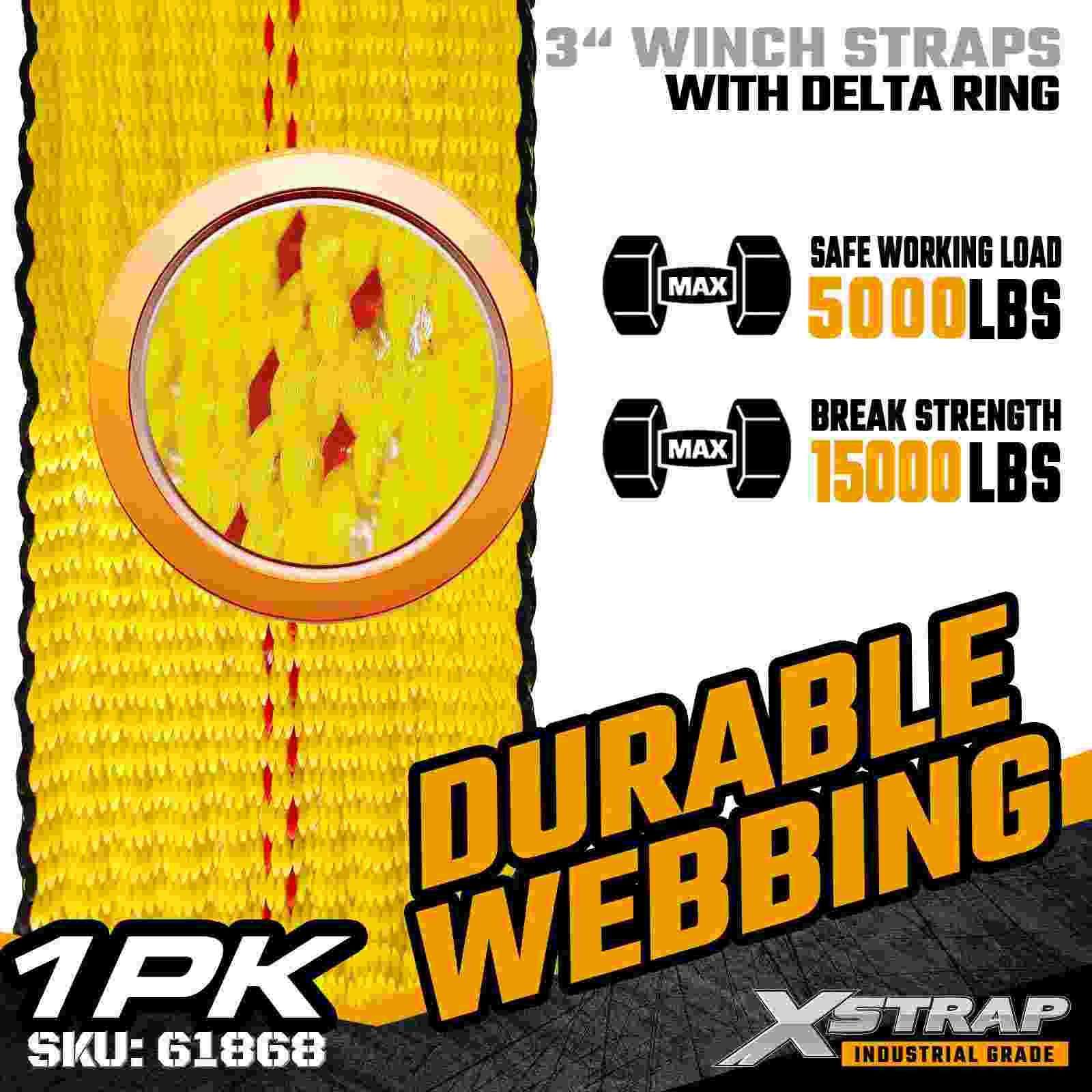 The Xstrap 61868 3" × 27ft Standard Winch Strap is a heavy-duty cargo securement solution designed for flatbed trailers and high-capacity transport. Featuring a reinforced Delta Ring and extra-wide 3-inch polyester webbing, this 3 inch winch strap delivers a 5,000 lbs Working Load Limit and 15,000 lbs Break Strength. It is ideal for securing oversized loads such as lumber, steel, machinery, and industrial freight during demanding hauling operations.