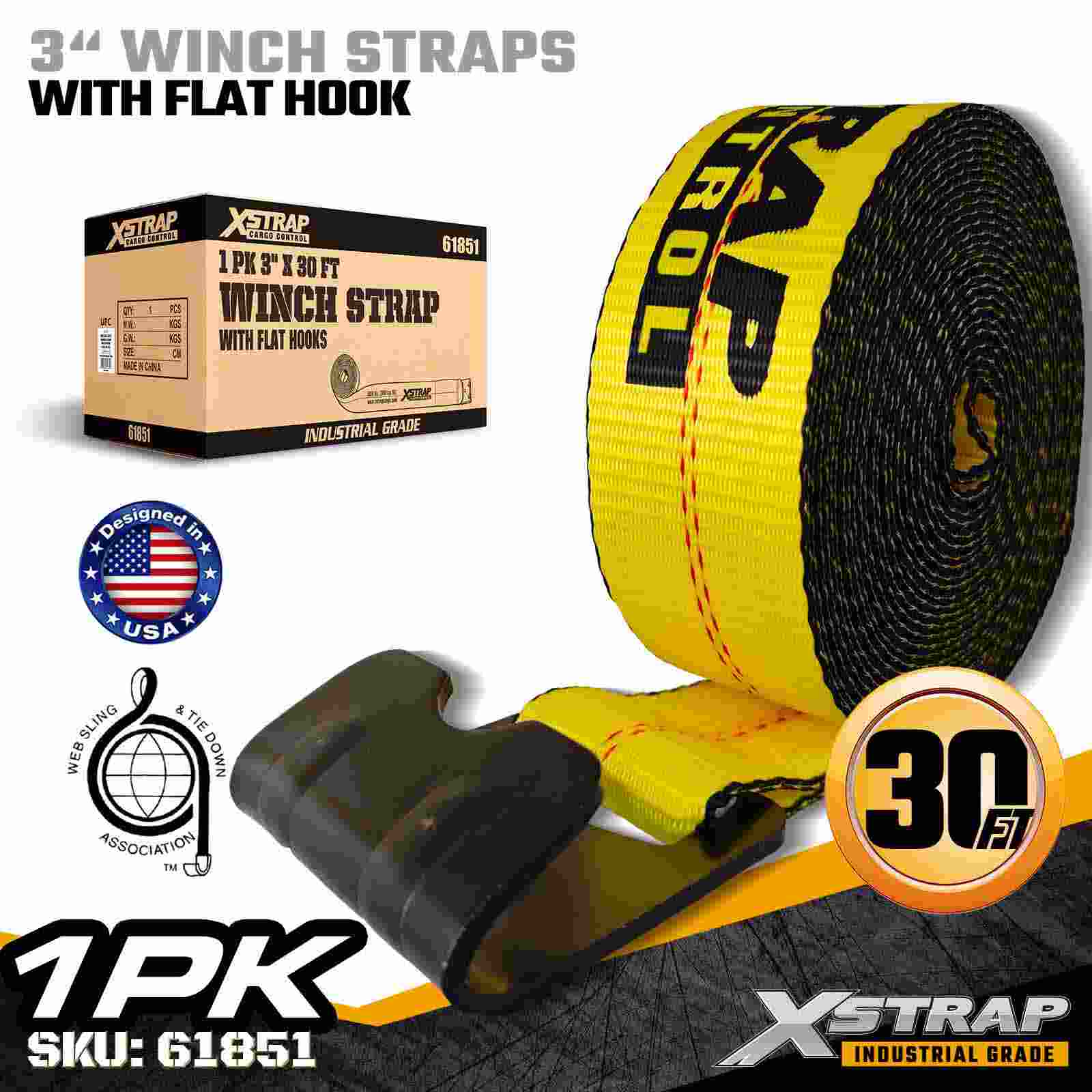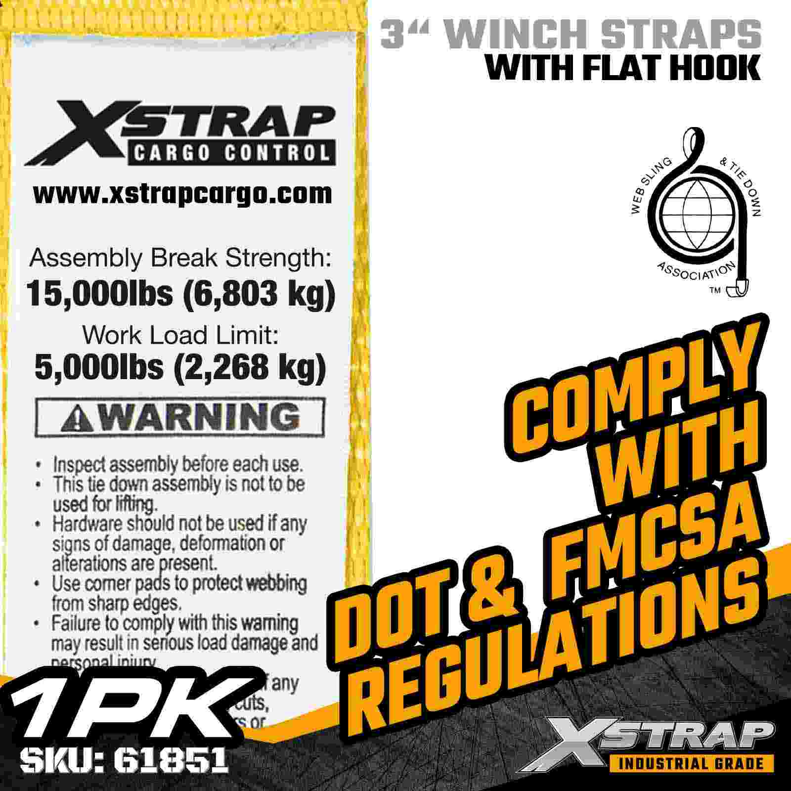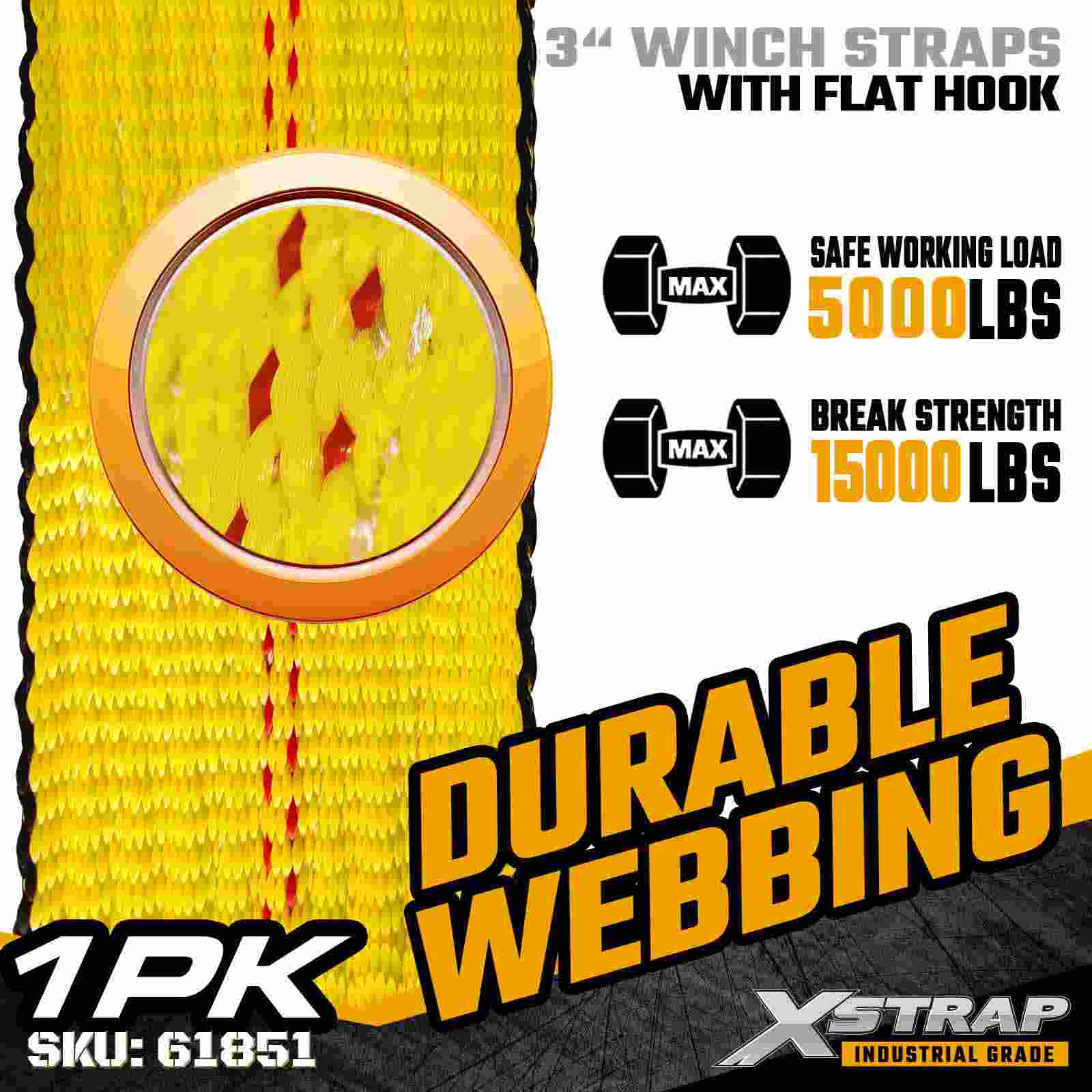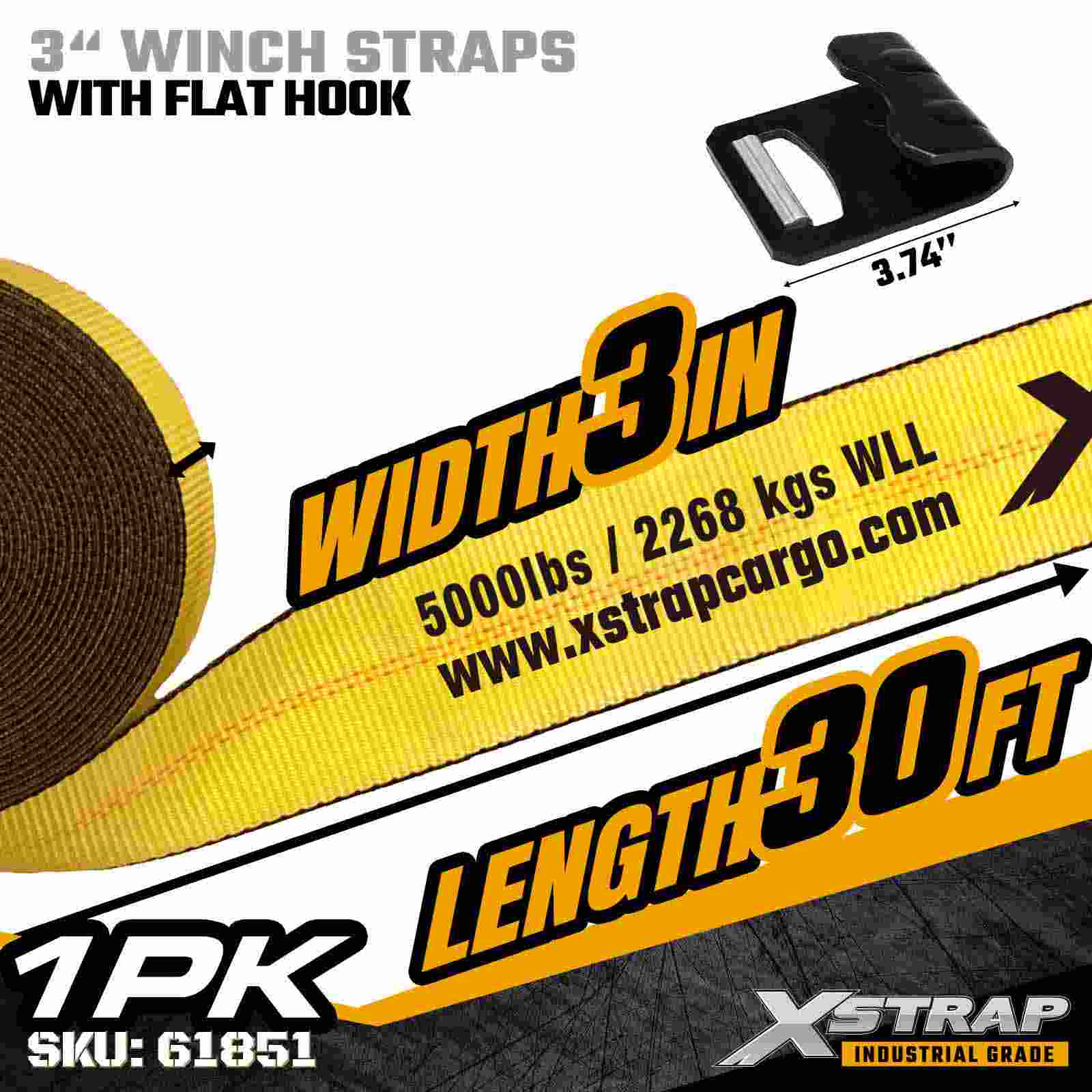 The Xstrap 61851 3" × 30ft Standard Winch Strap is a heavy-duty cargo securement strap engineered for flatbed trailers and high-capacity transport. Featuring a reinforced Flat Hook and extra-wide 3-inch polyester webbing, this 3 inch winch strap delivers a 5,000 lbs Working Load Limit and 15,000 lbs Break Strength. It is ideal for securing lumber, steel, machinery, and industrial freight during demanding hauling operations.