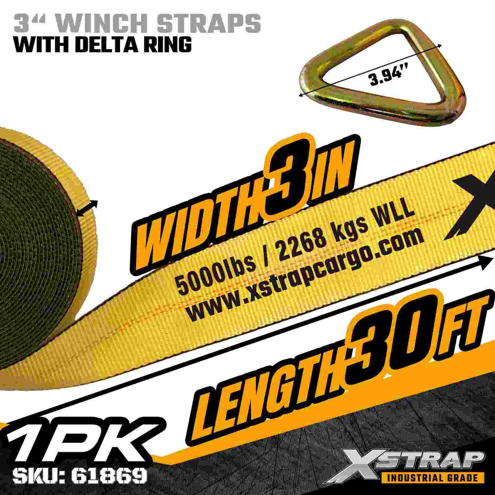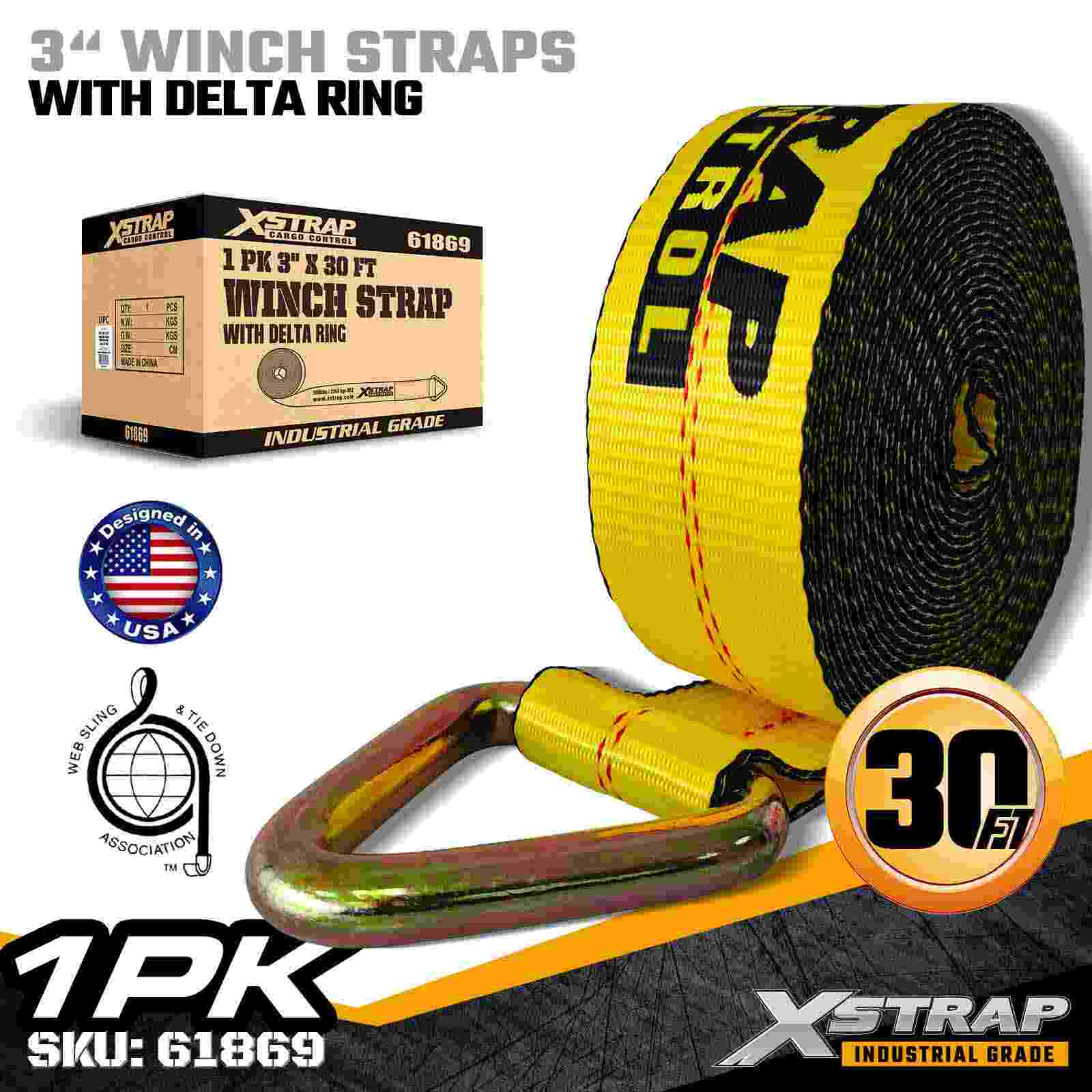 The Xstrap 61869 3" × 30ft Standard Winch Strap is a heavy-duty cargo securement strap engineered for flatbed trailers and high-capacity transport. Featuring a reinforced Delta Ring and extra-wide 3-inch polyester webbing, this 3 inch winch strap delivers a 5,000 lbs Working Load Limit and 15,000 lbs Break Strength. It is ideal for securing oversized loads such as lumber, steel, machinery, and industrial freight during demanding hauling operations.