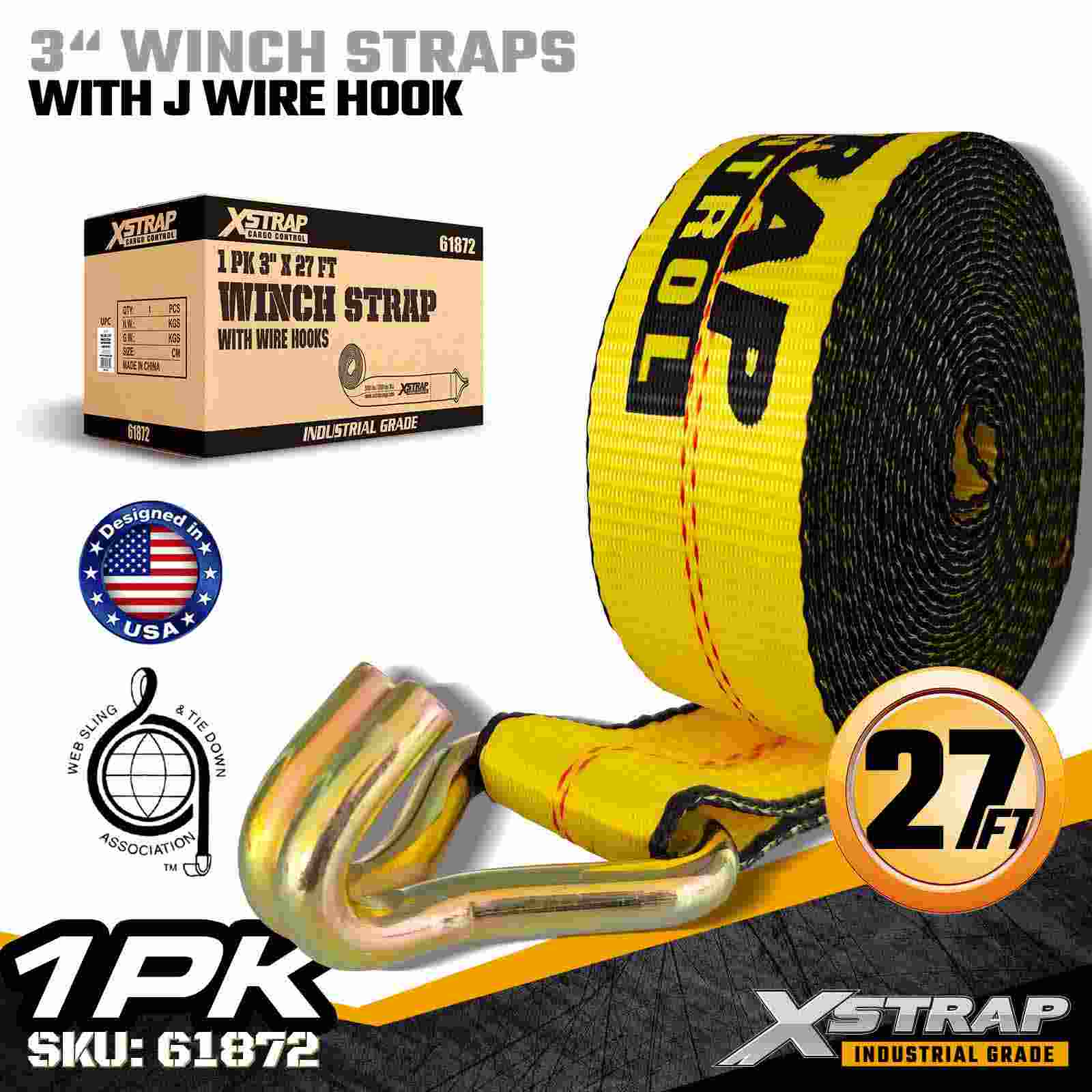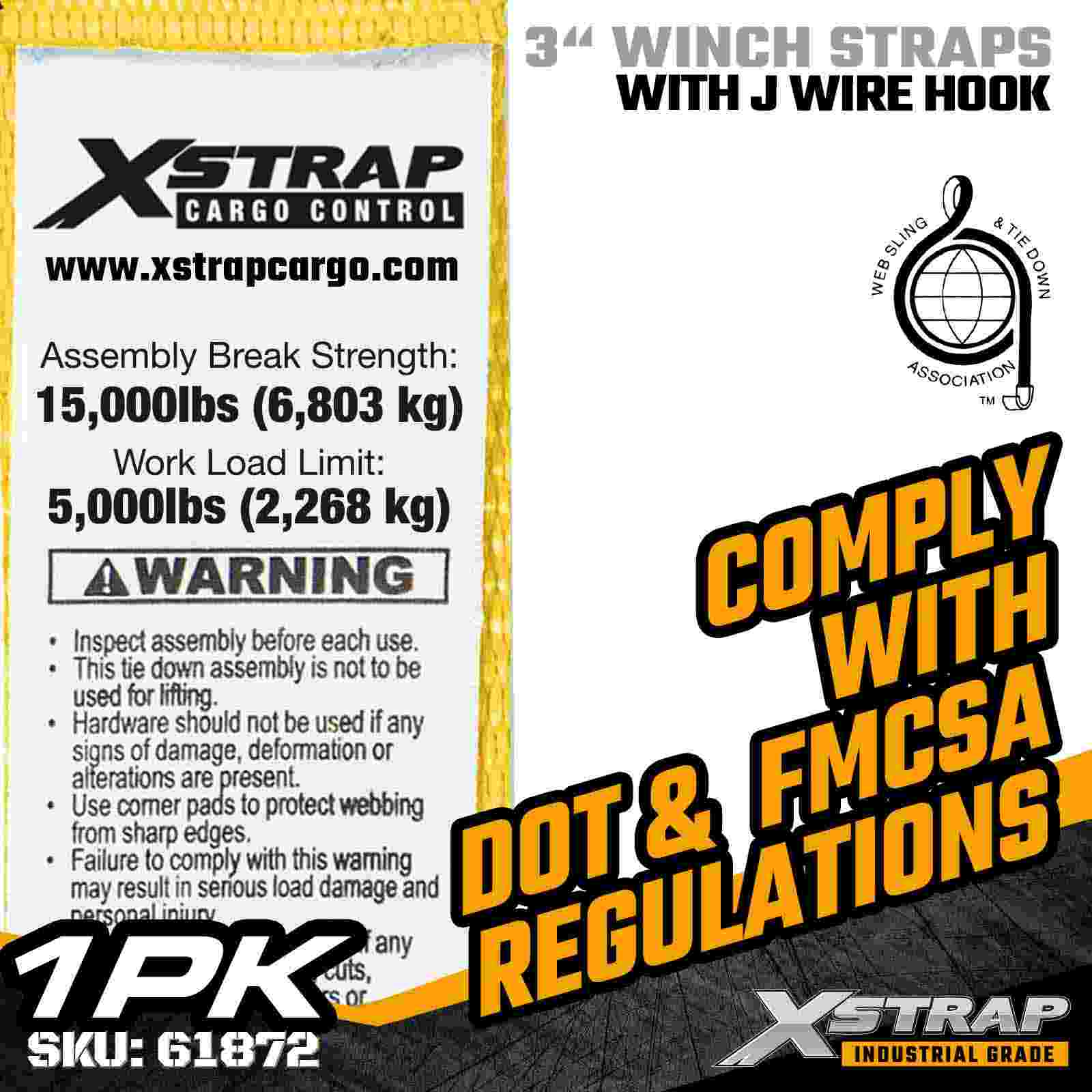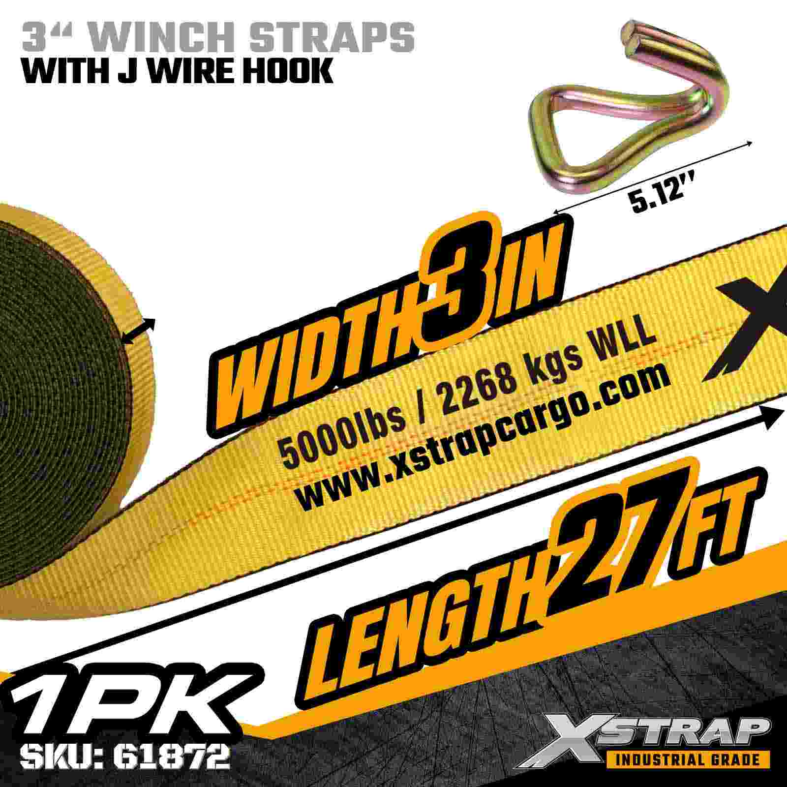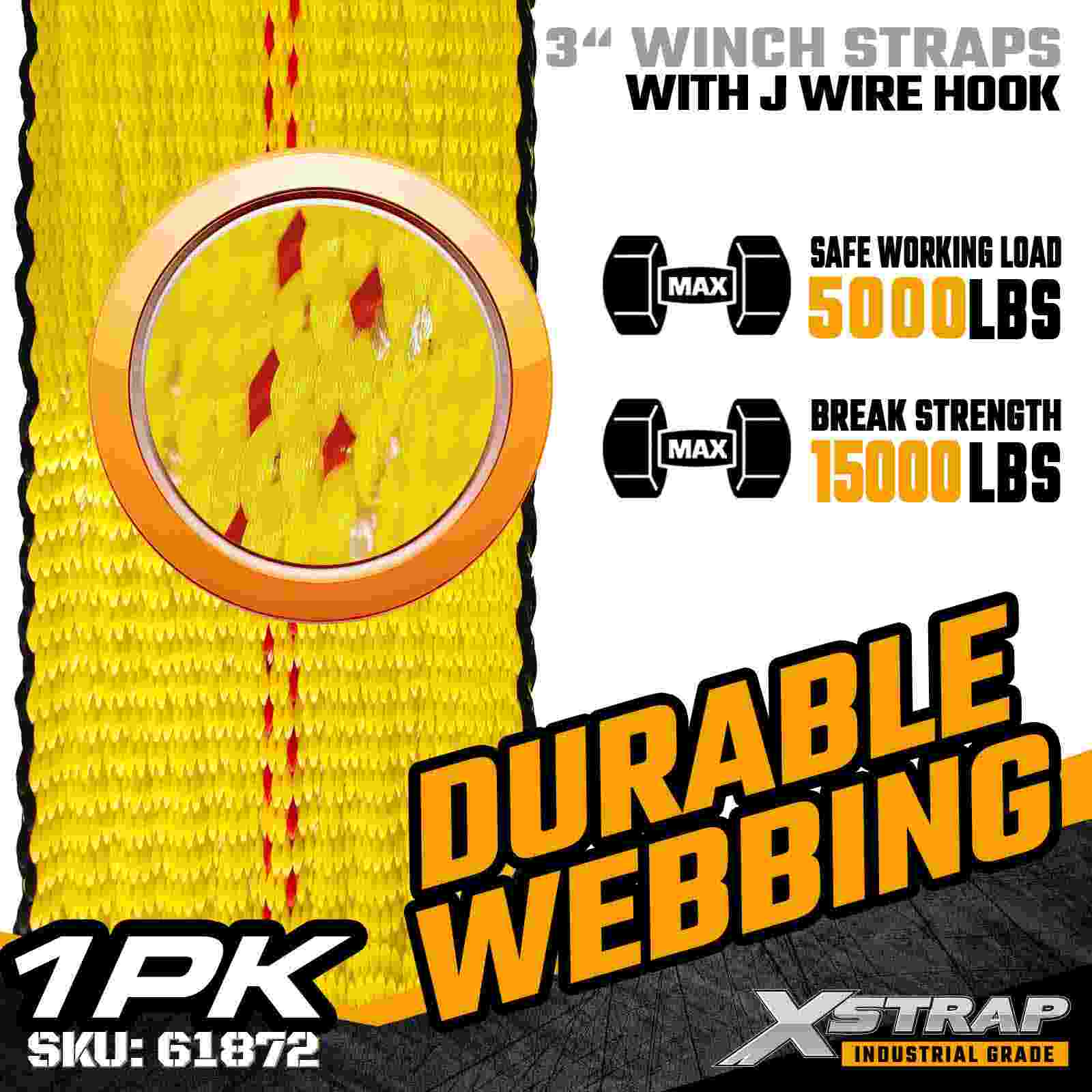 The Xstrap 61872 3" × 27ft Standard Winch Strap is a heavy-duty cargo securement solution designed for flatbed trailers and industrial transport. Equipped with a reinforced Wire Hook and extra-wide 3-inch polyester webbing, this 3 inch winch strap delivers a 5,000 lbs Working Load Limit and 15,000 lbs Break Strength. The Wire Hook design offers flexible attachment options, making it ideal for operators who need quick, versatile connection points during daily hauling operations.