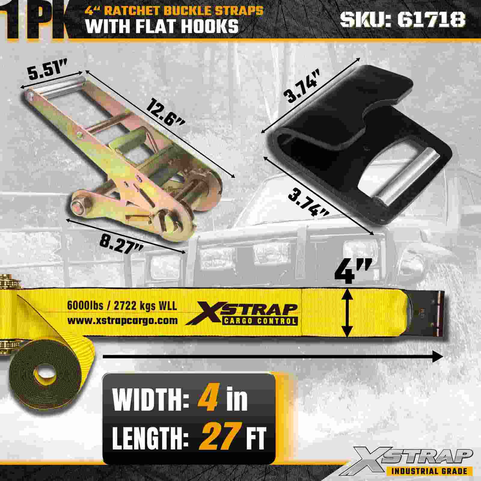 The Xstrap 61718 4" × 27ft Ratchet Buckle Strap (1-Pack) is built for extreme-duty cargo securement, featuring reinforced Flat Hooks and a heavy duty ratchet mechanism. With a 6,000 lbs Working Load Limit and 18,000 lbs Break Strength, this strap is engineered for professional flatbed hauling, construction materials, machinery transport, and industrial logistics where maximum strength and reliability are essential.