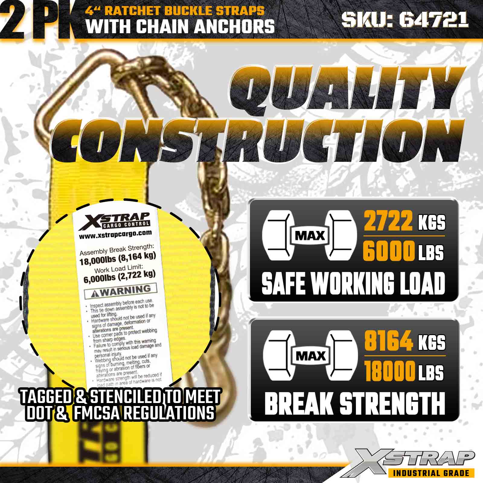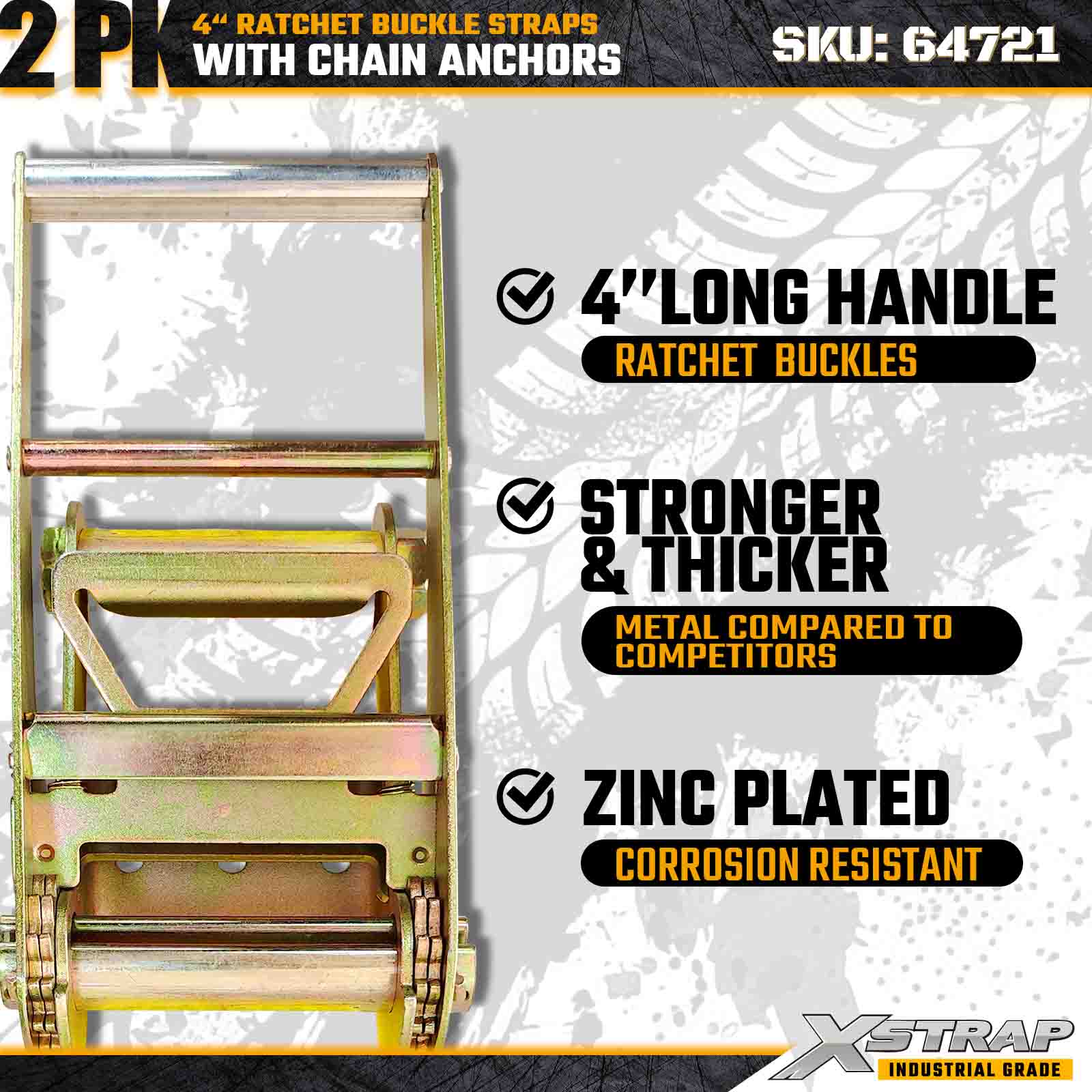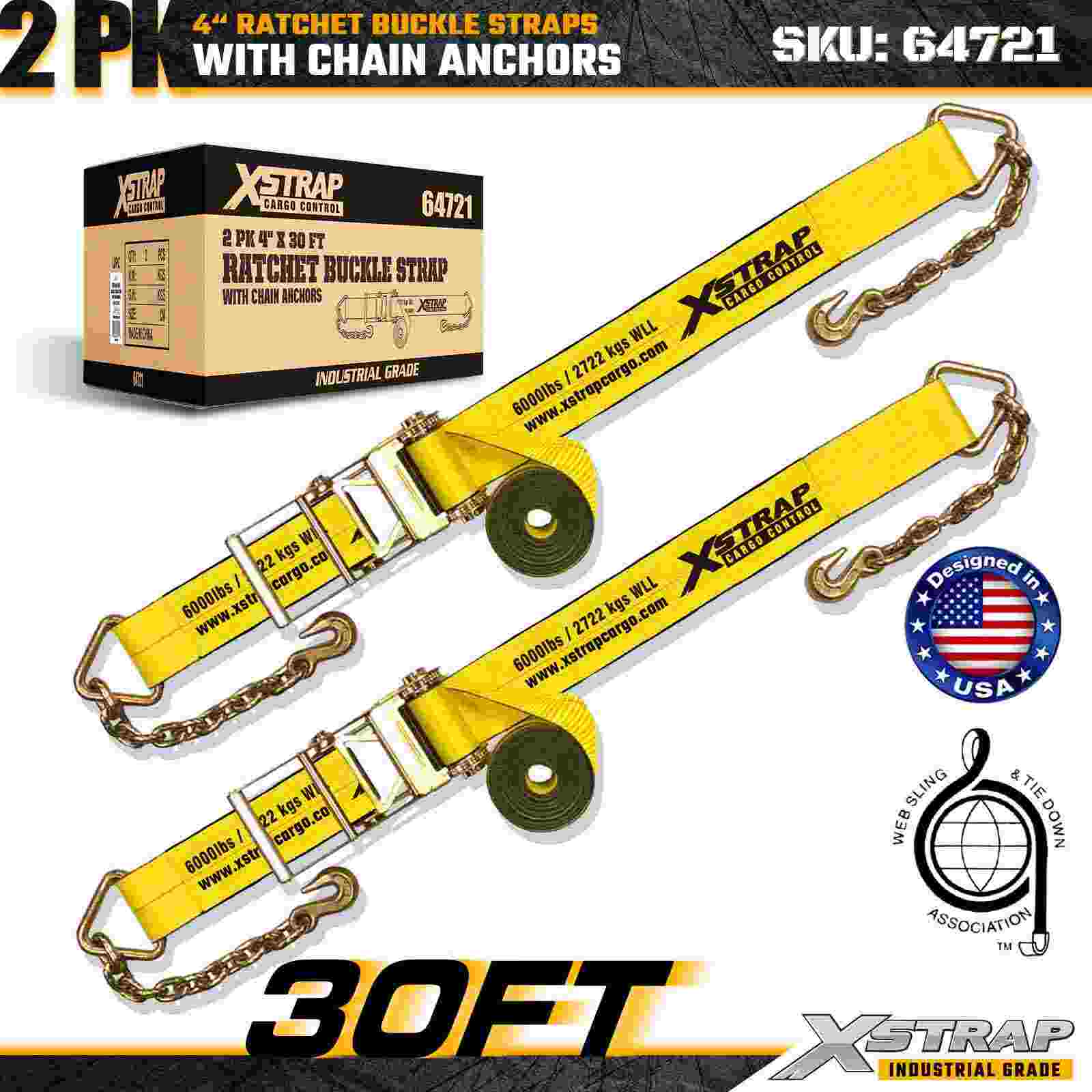 The Xstrap 64721 4" × 30ft Ratchet Buckle Straps (2-Pack) are engineered for heavy-duty cargo securement, featuring rugged Chain Anchors and a reinforced ratchet mechanism. With a 6,000 lbs Working Load Limit and 18,000 lbs Break Strength, these straps are ideal for flatbed hauling, machinery transport, steel loads, and industrial cargo applications requiring maximum strength and reliability.