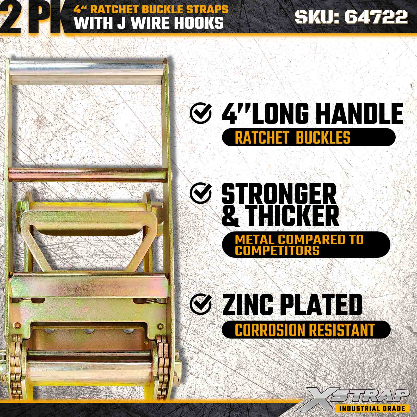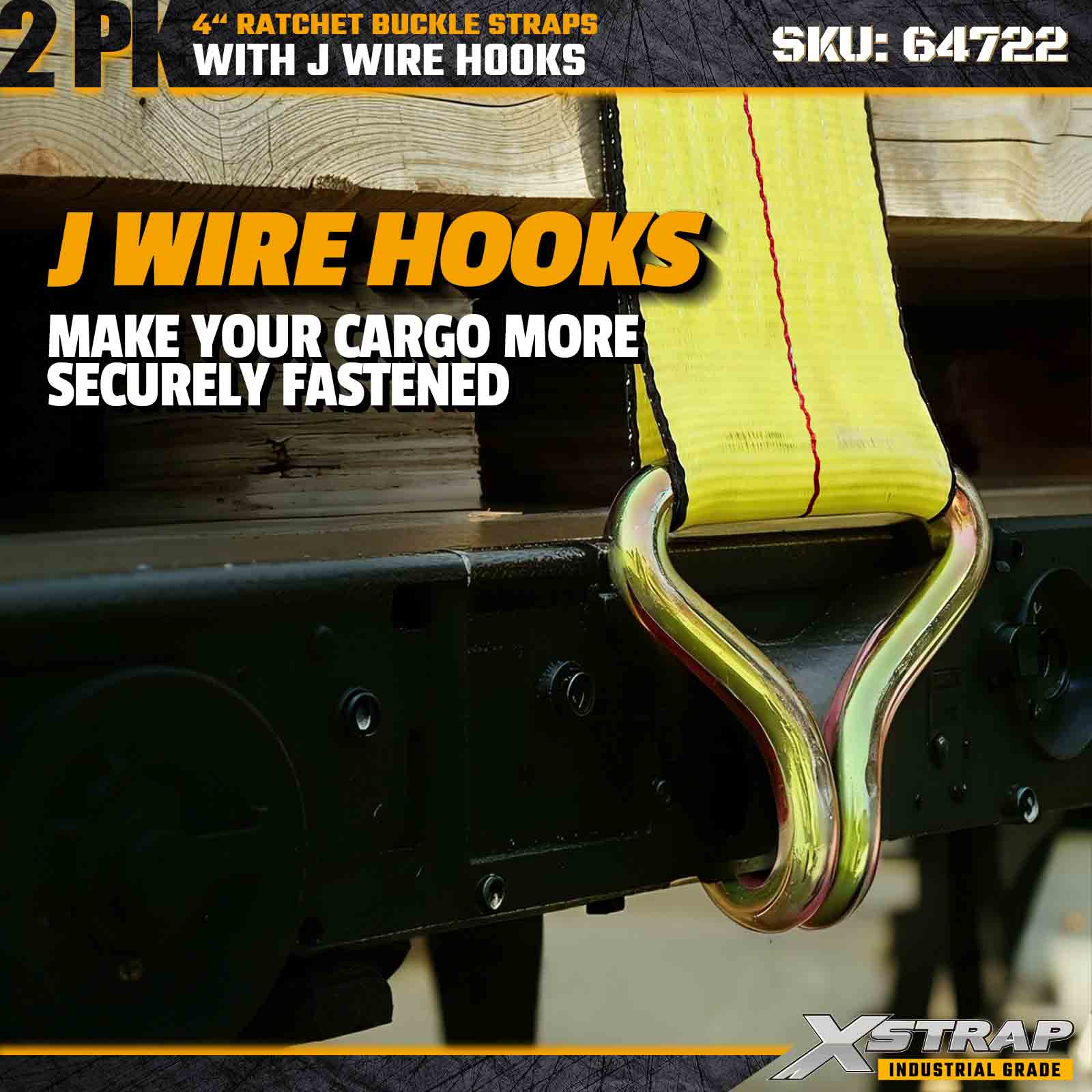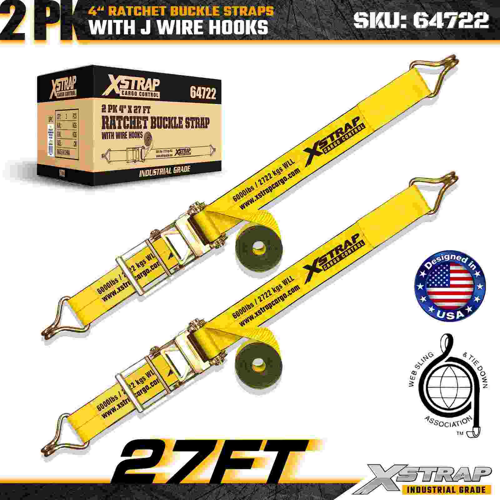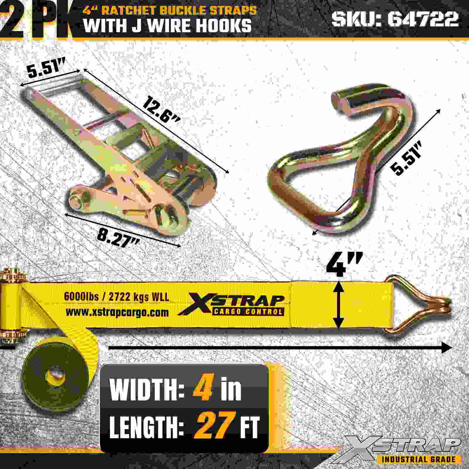 The Xstrap 64722 4" × 27ft Ratchet Buckle Straps (2-Pack) are designed for heavy-duty cargo securement, featuring reinforced Wire Hooks and a durable ratchet mechanism. With a 6,000 lbs Working Load Limit and 18,000 lbs Break Strength, these straps are ideal for flatbed hauling, machinery transport, lumber, steel loads, and industrial cargo applications.