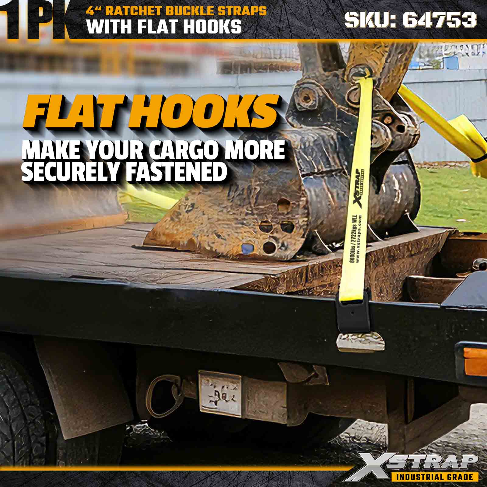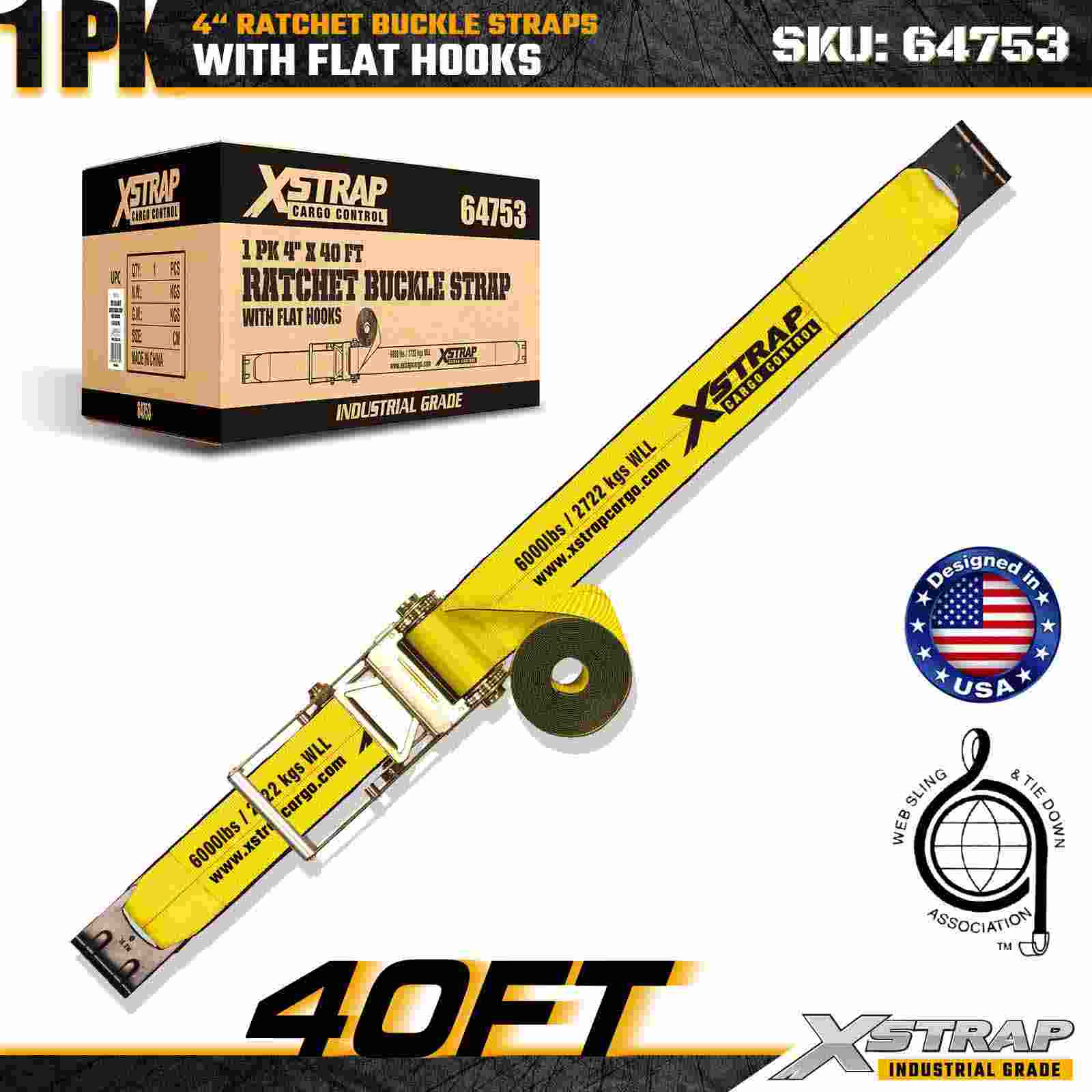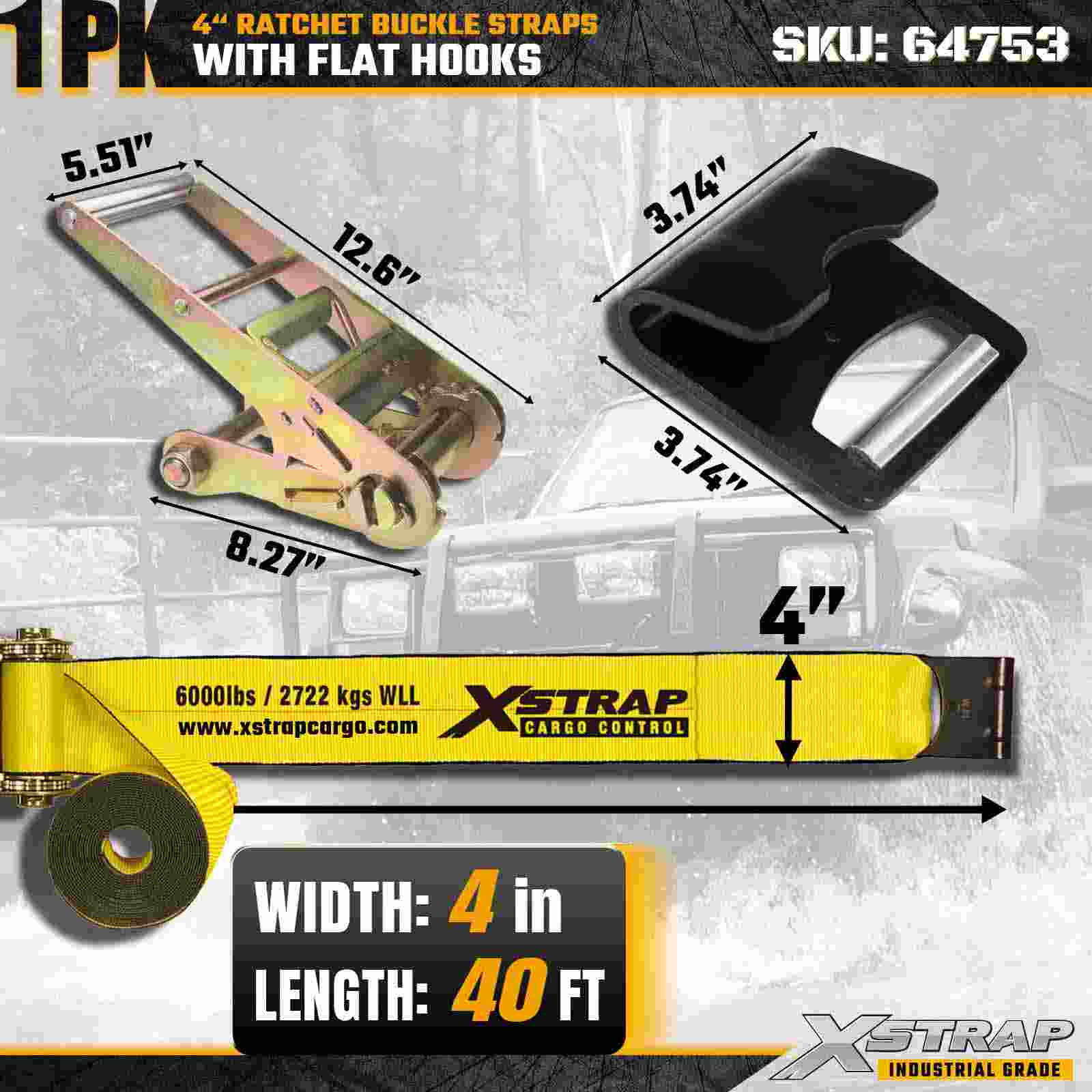 The Xstrap 64753 4" × 40ft Ratchet Buckle Strap (1-Pack) is designed for heavy-duty cargo securement, featuring reinforced Flat Hooks and a durable ratchet mechanism. With a 6,000 lbs Working Load Limit and 18,000 lbs Break Strength, this extra-long strap is ideal for flatbed hauling, oversized loads, machinery transport, and industrial cargo applications.