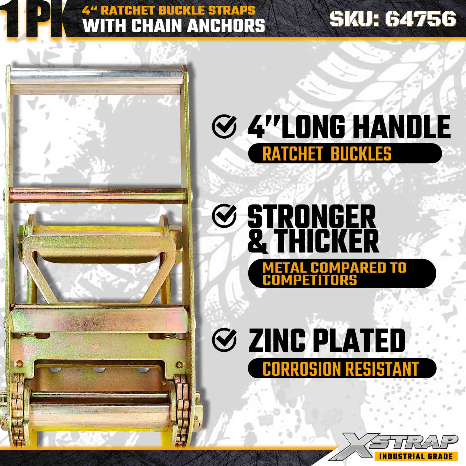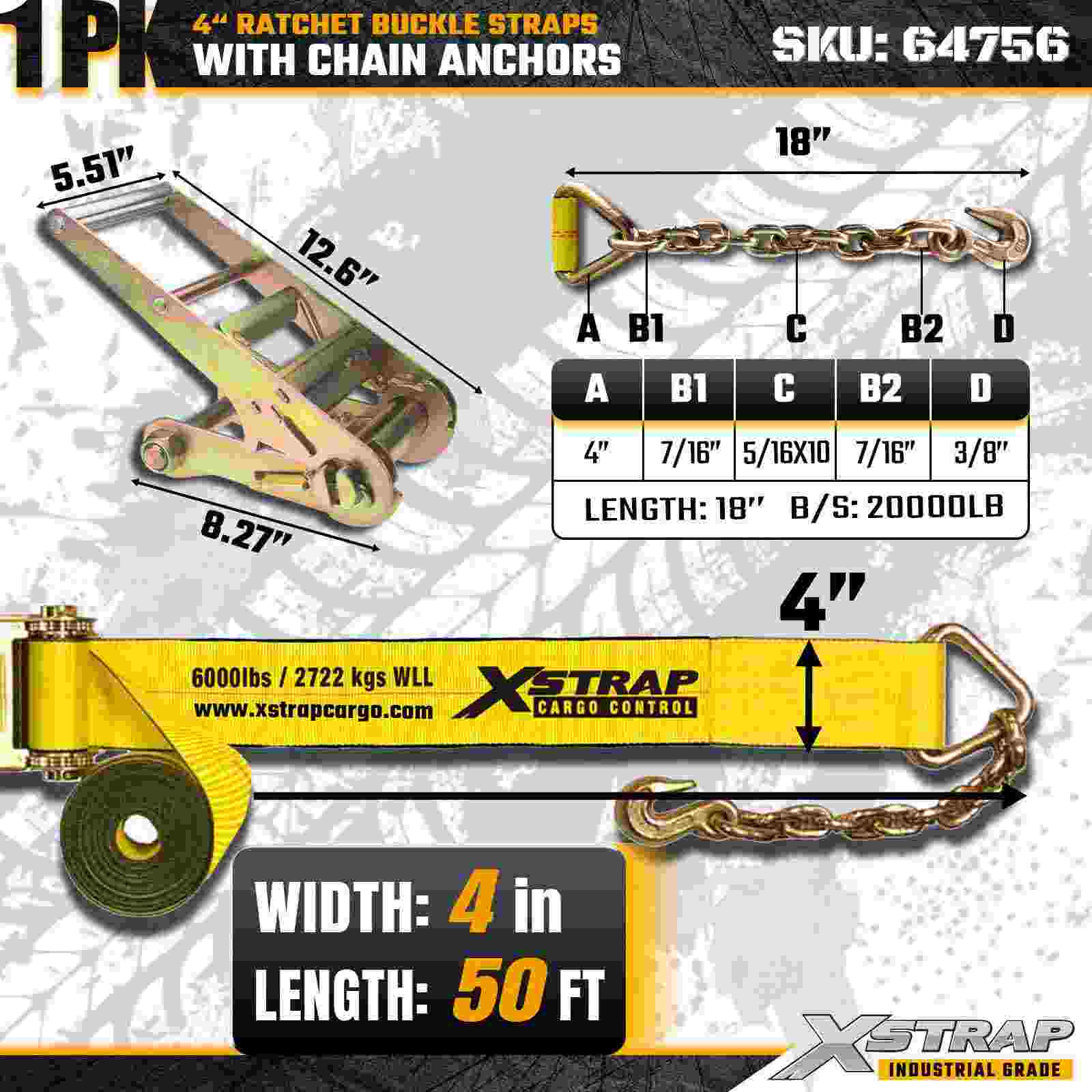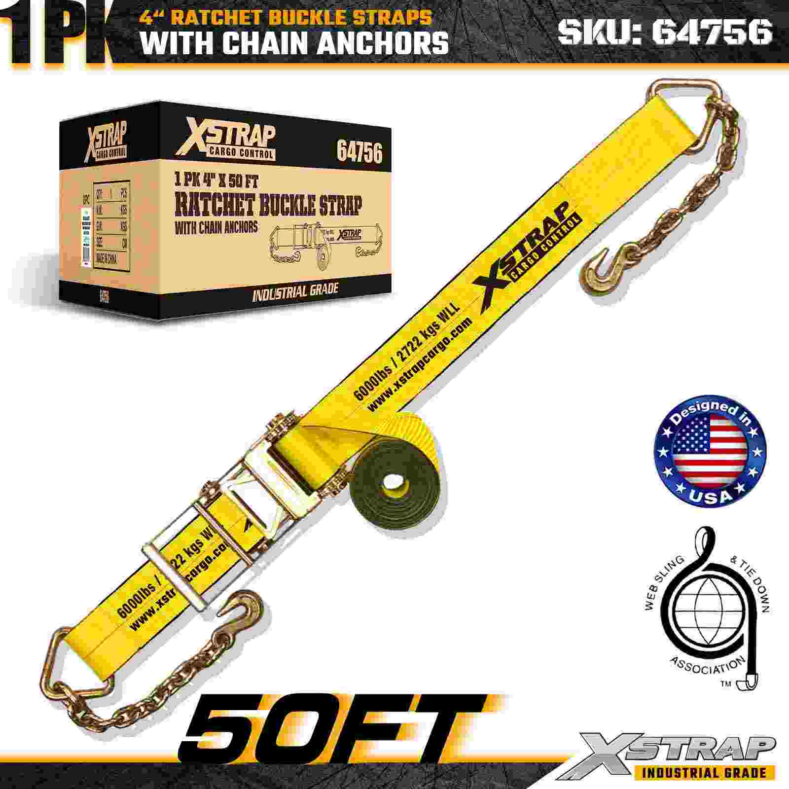 Xstrap 64756 4" × 50ft Ratchet Buckle Strap with Chain Anchors Break Strength 18,000 lbs (1-Pack)