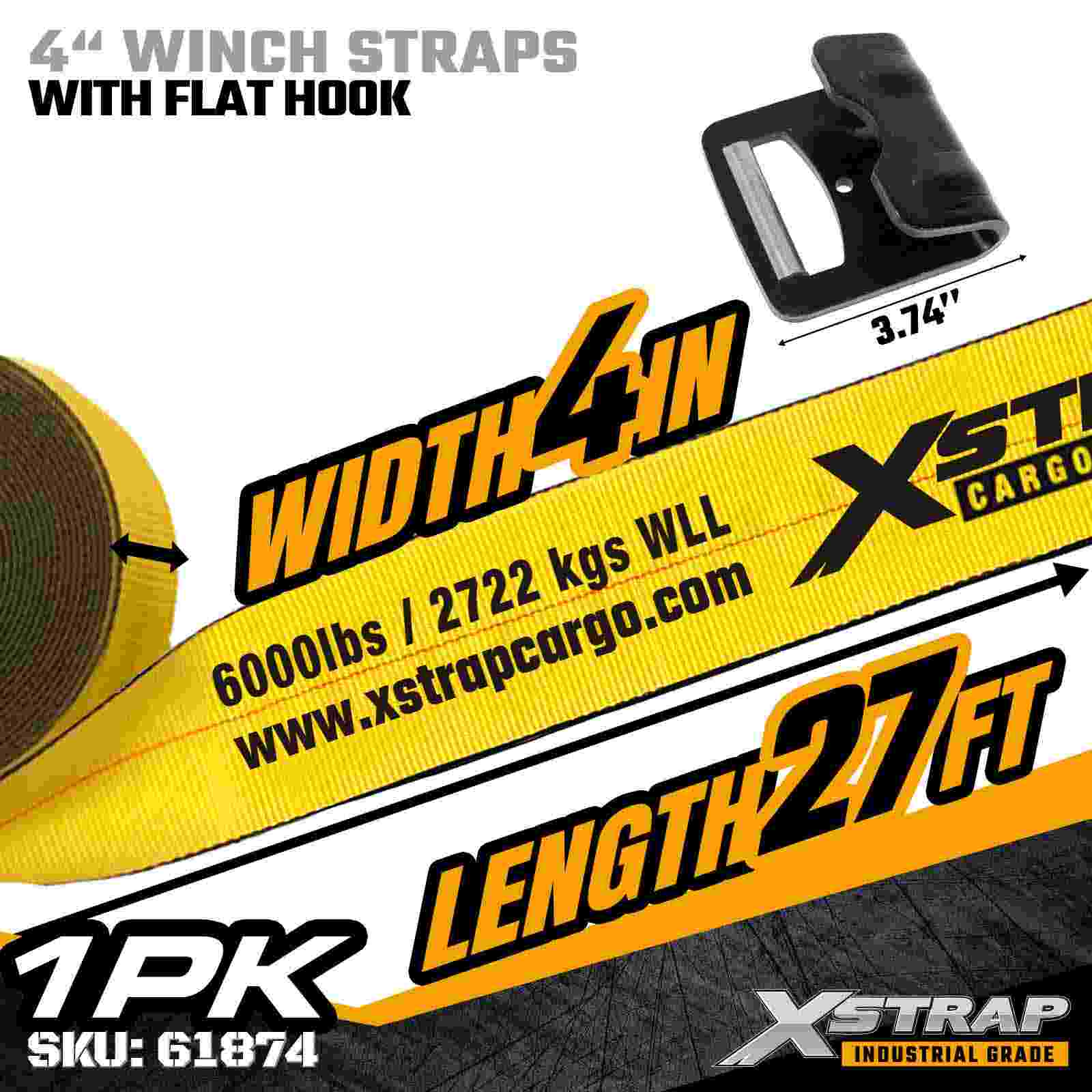 The Xstrap 61874 4" × 27ft Standard Winch Strap is a heavy-duty, high-capacity cargo securement strap engineered for flatbed trailers and industrial transport. Featuring a reinforced Flat Hook and extra-wide 4-inch polyester webbing, this 4 inch winch strap delivers a 6,000 lbs Working Load Limit and 18,000 lbs Break Strength. The wider webbing provides superior load distribution, making it ideal for securing heavy, bulky, or delicate freight that requires maximum stability.