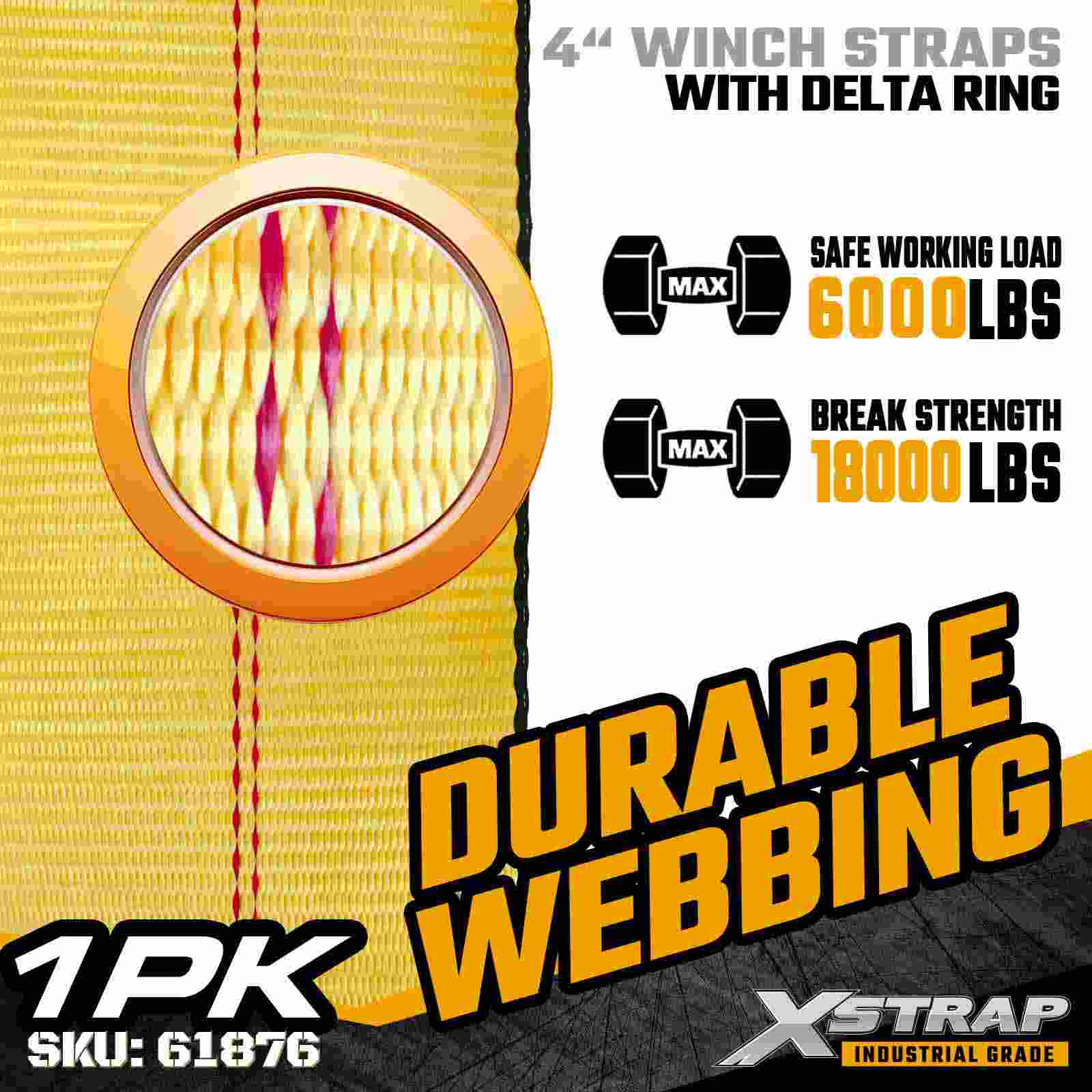 The Xstrap 61876 4" × 27ft Standard Winch Strap is a premium heavy-duty cargo securement strap engineered for flatbed trailers and industrial transport. Featuring a reinforced Delta Ring and ultra-wide 4-inch polyester webbing, this 4 inch winch strap delivers a 6,000 lbs Working Load Limit and 18,000 lbs Break Strength. The Delta Ring design provides multi-directional load engagement, making it ideal for securing complex or uneven freight that requires enhanced stability and flexible anchoring.