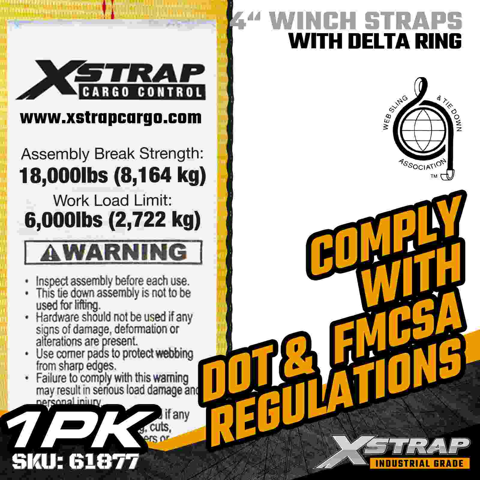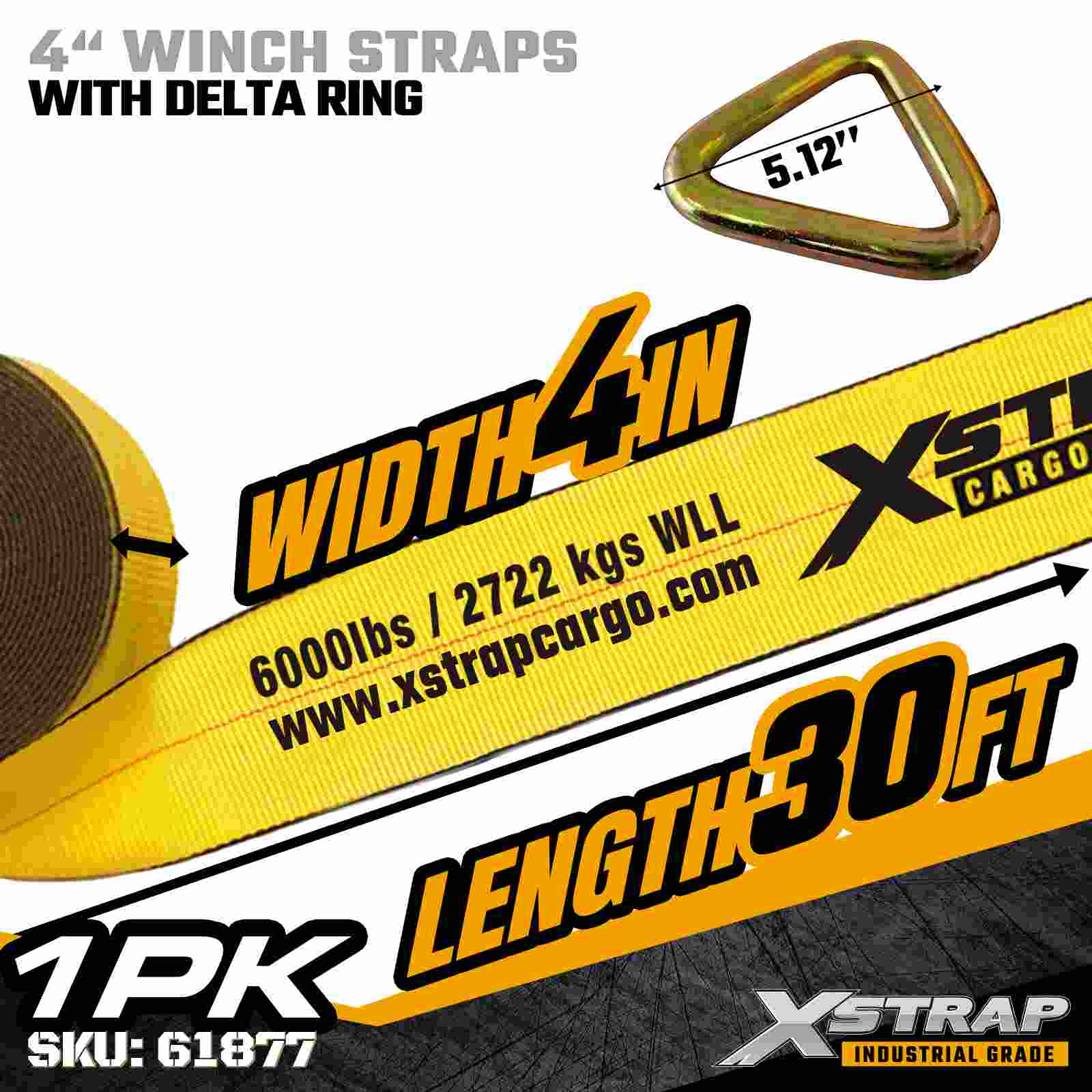 The Xstrap 61877 4" × 30ft Standard Winch Strap is a high-capacity, extended-reach cargo securement strap engineered for flatbed trailers and oversized industrial freight. Featuring a reinforced Delta Ring and ultra-wide 4-inch polyester webbing, this 4 inch winch strap delivers a 6,000 lbs Working Load Limit and 18,000 lbs Break Strength. The extended 30ft length provides additional reach, making it ideal for securing wide, tall, or irregularly shaped loads that require multi-directional anchoring and enhanced stability.
