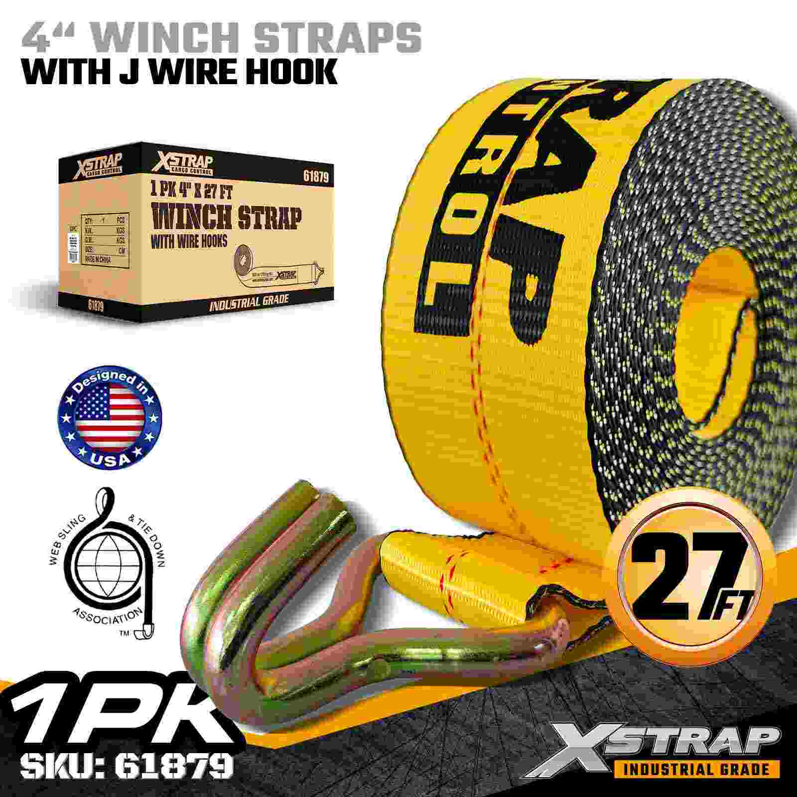 The Xstrap 61879 4" × 27ft Standard Winch Strap is a heavy-duty, flexible-anchoring cargo securement strap designed for flatbed trailers and industrial transport. Featuring a reinforced Wire Hook and ultra-wide 4-inch polyester webbing, this 4 inch winch strap delivers a 6,000 lbs Working Load Limit and 18,000 lbs Break Strength. The Wire Hook design offers versatile attachment options, making it ideal for operators who need quick, adaptable connection points for various freight types.