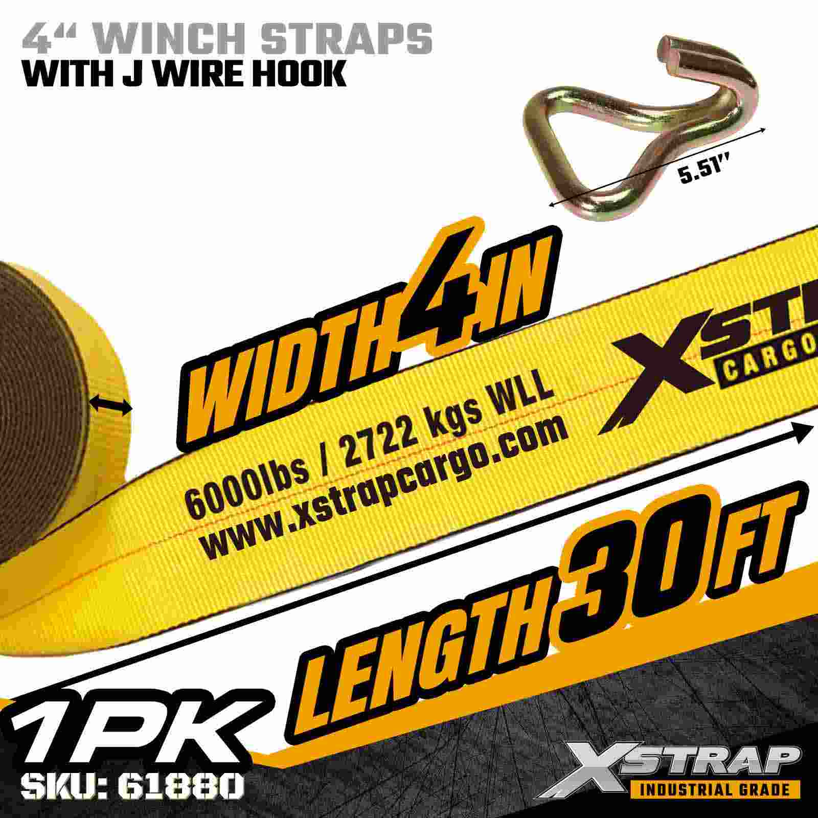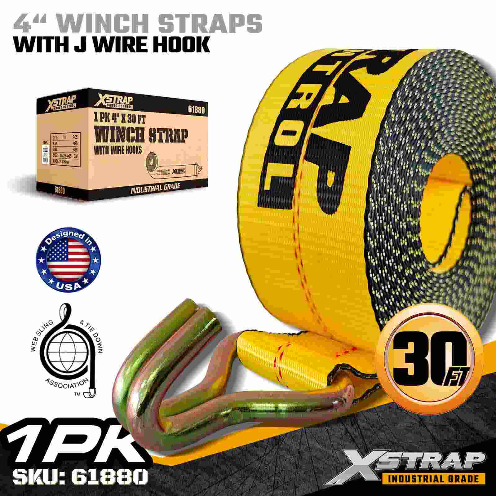 The Xstrap 61880 4" × 30ft Standard Winch Strap is a high-capacity, extended-reach cargo securement strap designed for flatbed trailers and oversized industrial freight. Featuring a reinforced Wire Hook and ultra-wide 4-inch polyester webbing, this 4 inch winch strap delivers a 6,000 lbs Working Load Limit and 18,000 lbs Break Strength. The extended 30ft length provides additional reach and flexibility, making it ideal for securing wide, tall, or irregularly shaped loads that require adaptable anchoring options.