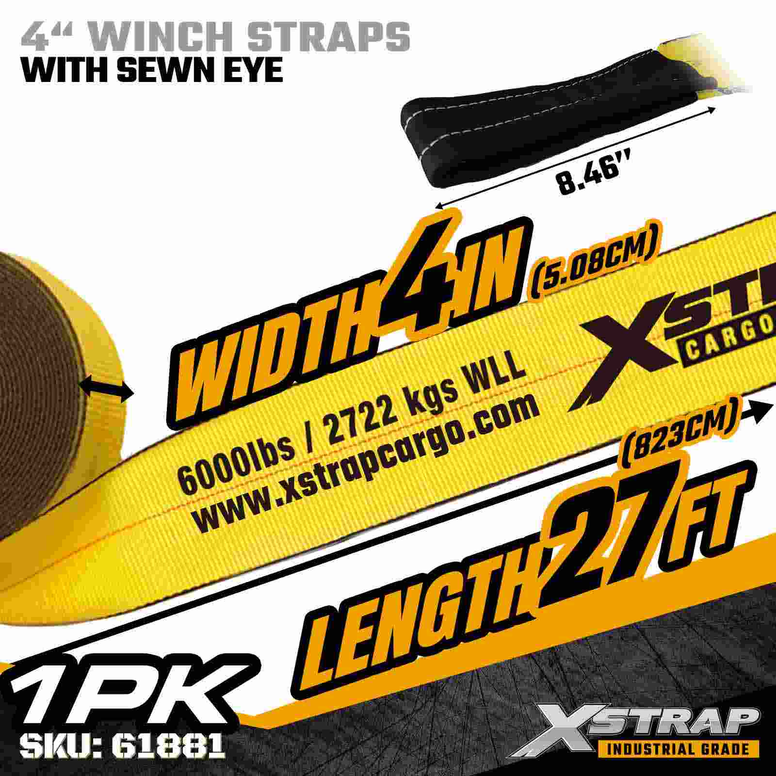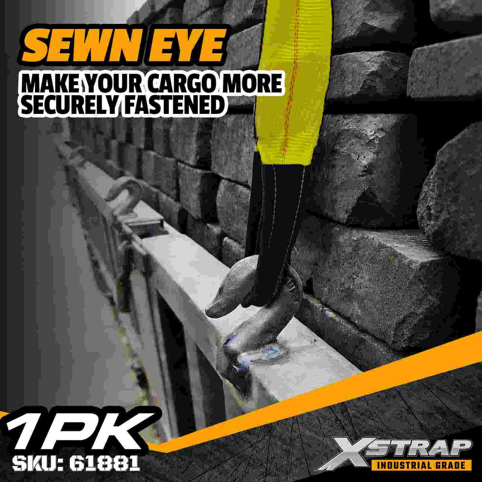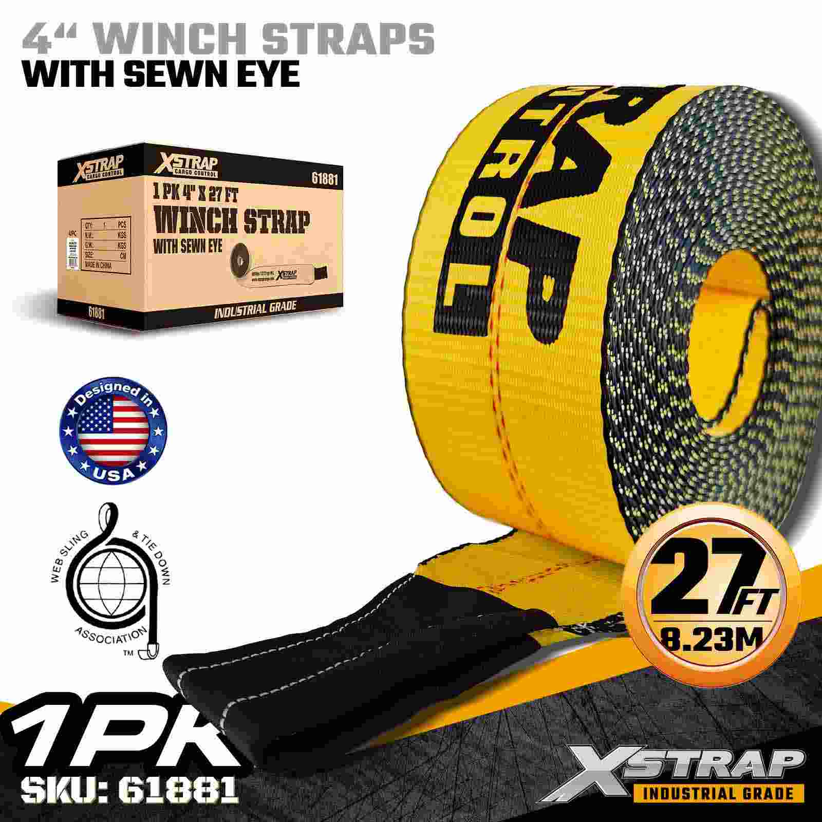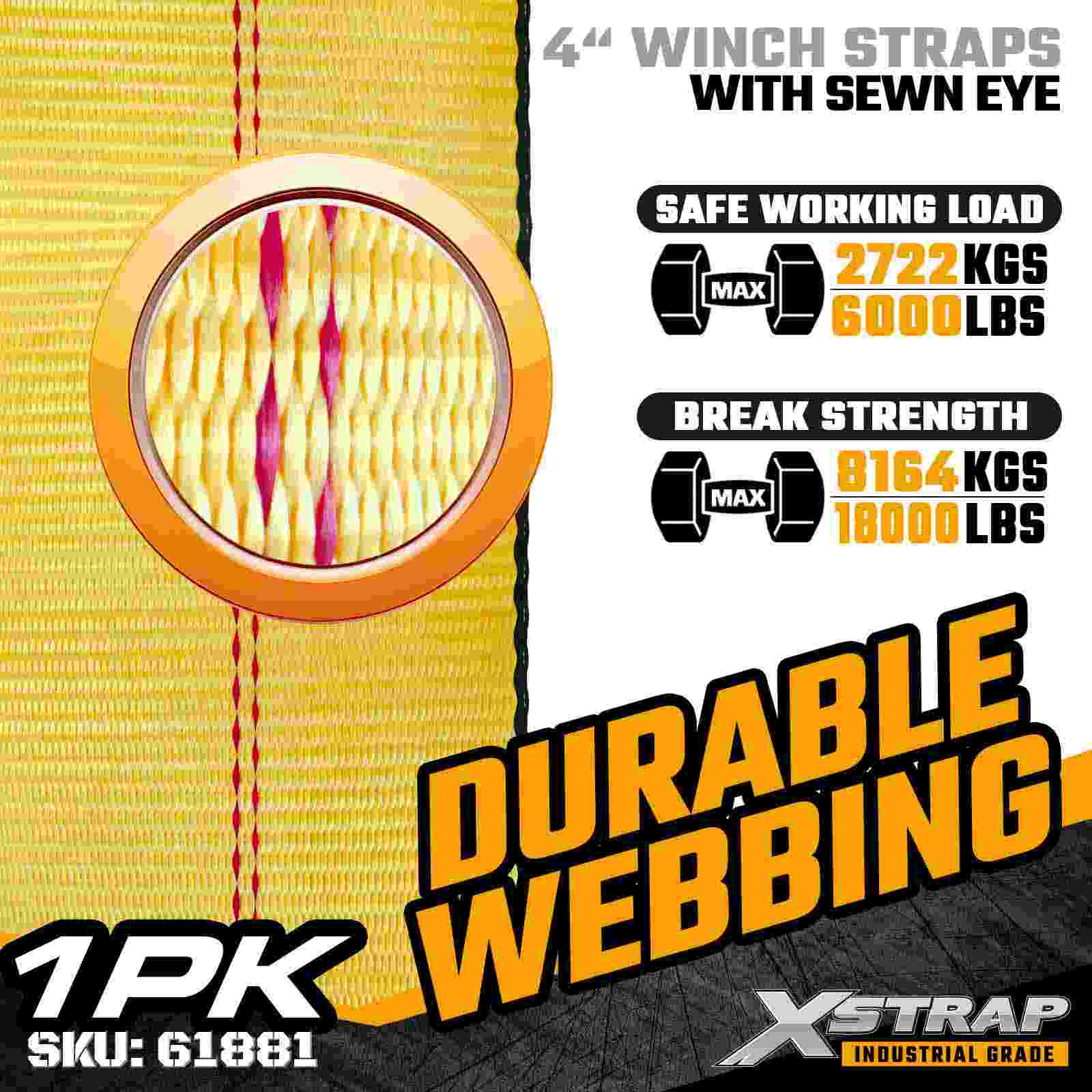 The Xstrap 61881 4" × 27ft Standard Winch Strap is a heavy-duty, flexible-anchoring cargo securement strap engineered for flatbed trailers and industrial transport. Featuring a reinforced Sewn Eye loop and ultra-wide 4-inch polyester webbing, this 4 inch winch strap delivers a 6,000 lbs Working Load Limit and 18,000 lbs Break Strength. The Sewn Eye design provides a soft, adaptable connection point ideal for hooks, shackles, and custom anchor setups.
