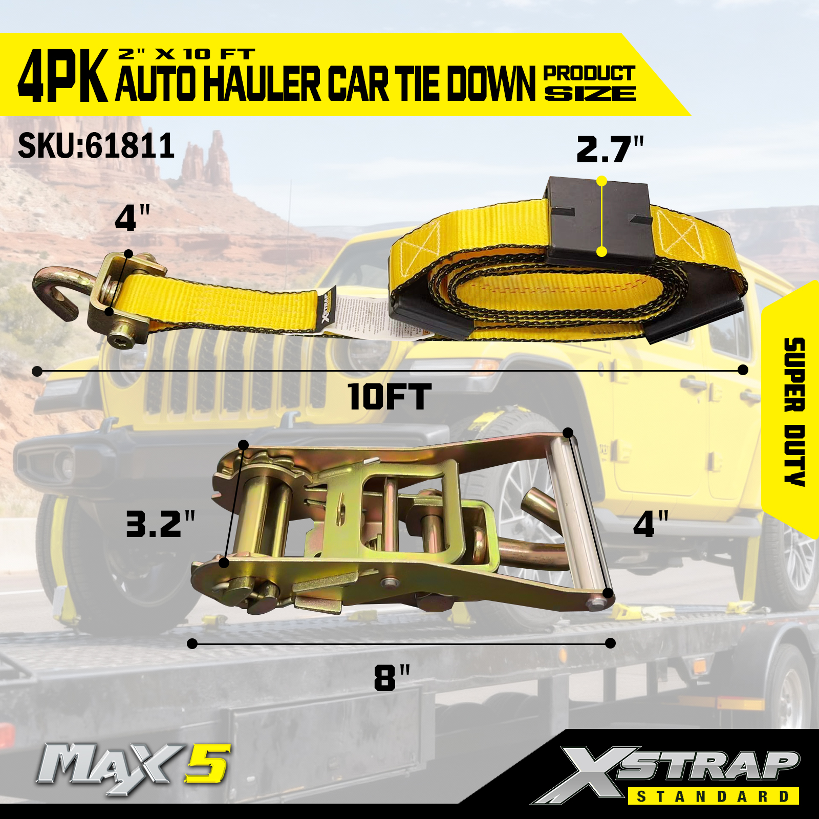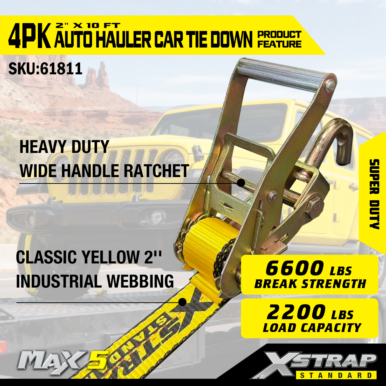 - Super Duty Performance: Each strap has a safe working load of 2,200 Safe working load is stamped on the warning tag of each tie down straps for easy inspection, it’s built to handle heavy vehicles and demanding transport scenarios.