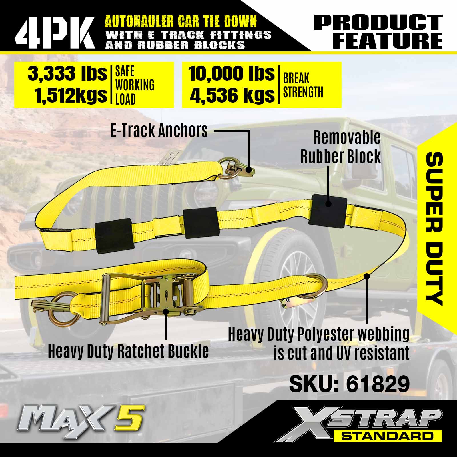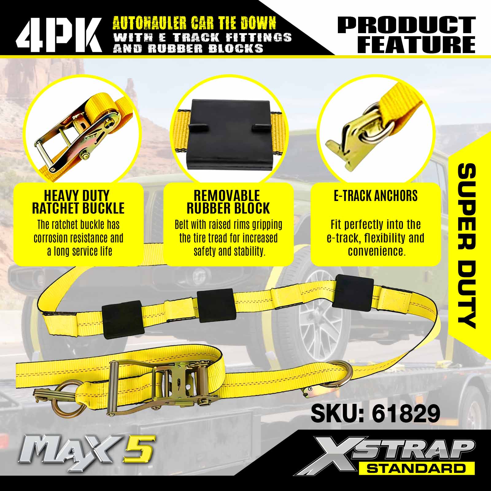 - Premium Material: Heavy-duty car tie down straps crafted from industrial grade polyester webbing, ensuring exceptional abrasion resistance for long-lasting durability during all your vehicle hauling needs