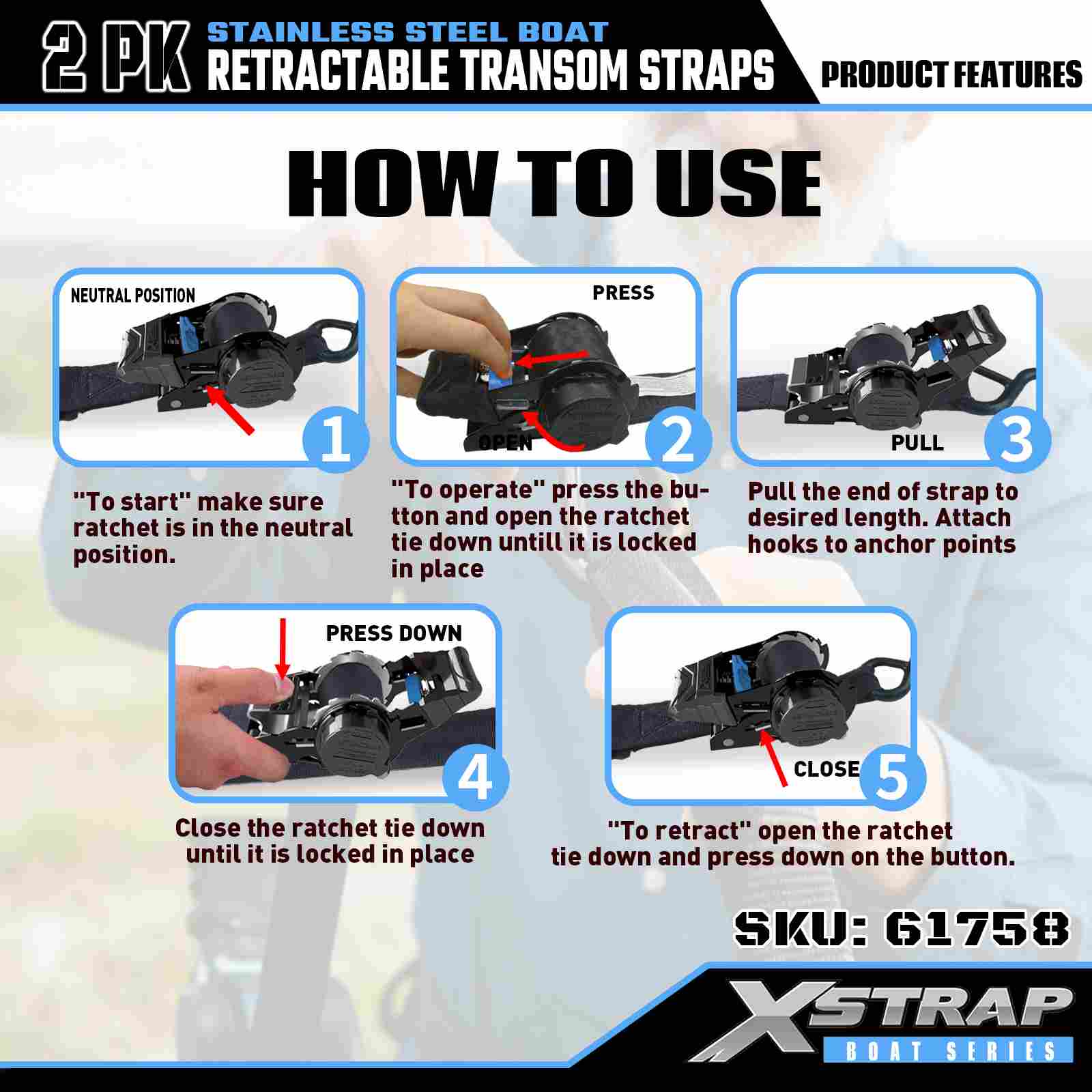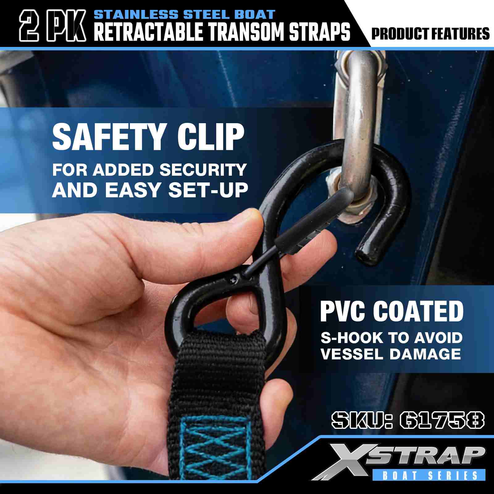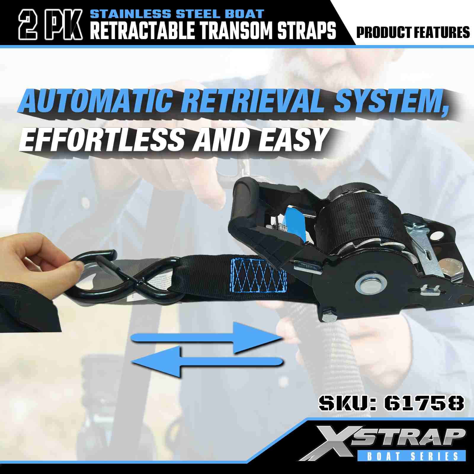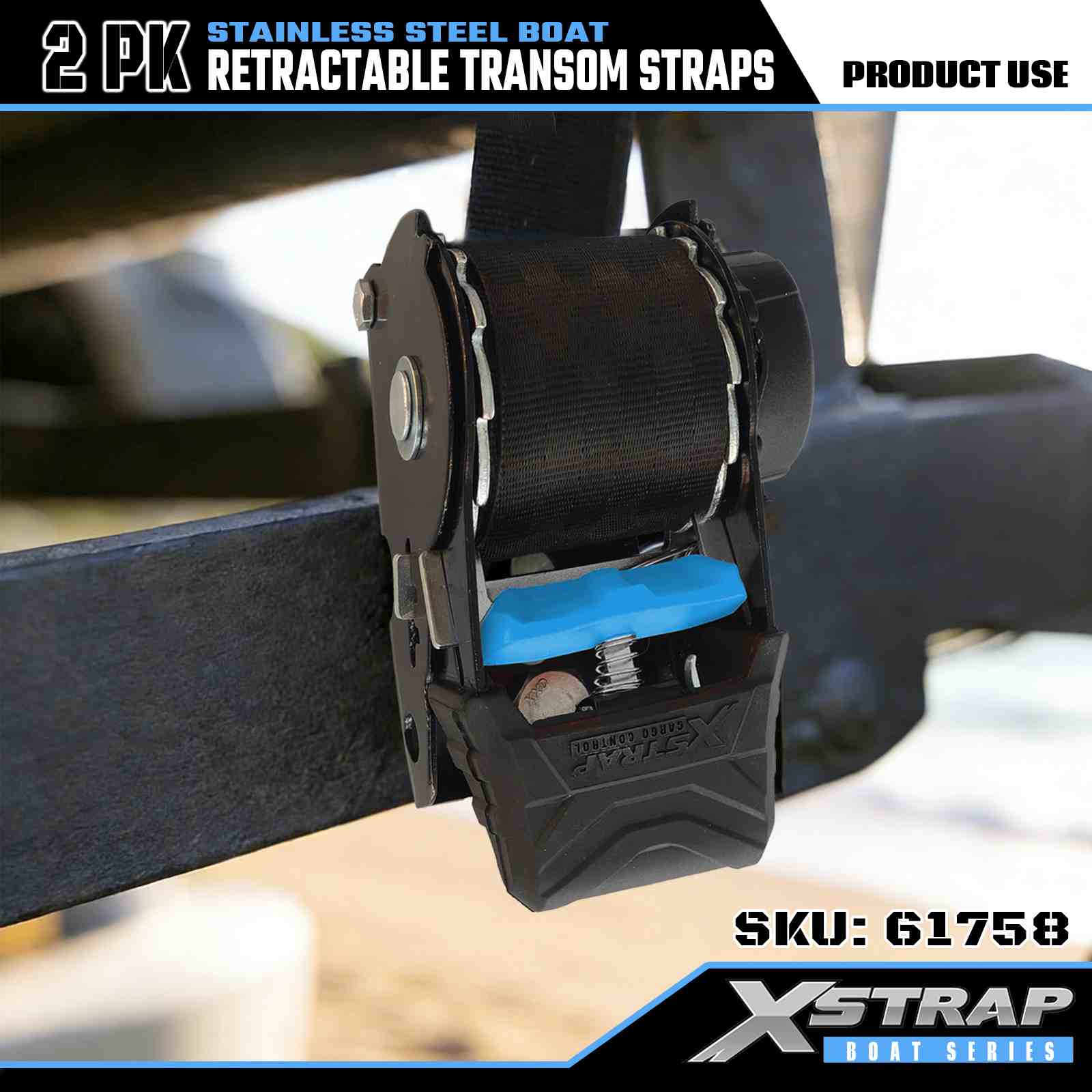 Xstrap 2PK Boat Retractable Transom Strap with Safety S Hooks, 2” x 3.6’ Polyester Tie Down Strap Retractable Strap, 1000lbs Capacity Cargo Lashing Securing Straps with Safety S Hook for the Serious Professional to Secure Cargo Trailer, Flat Bed Trailer, Ski Boat, Small Car.