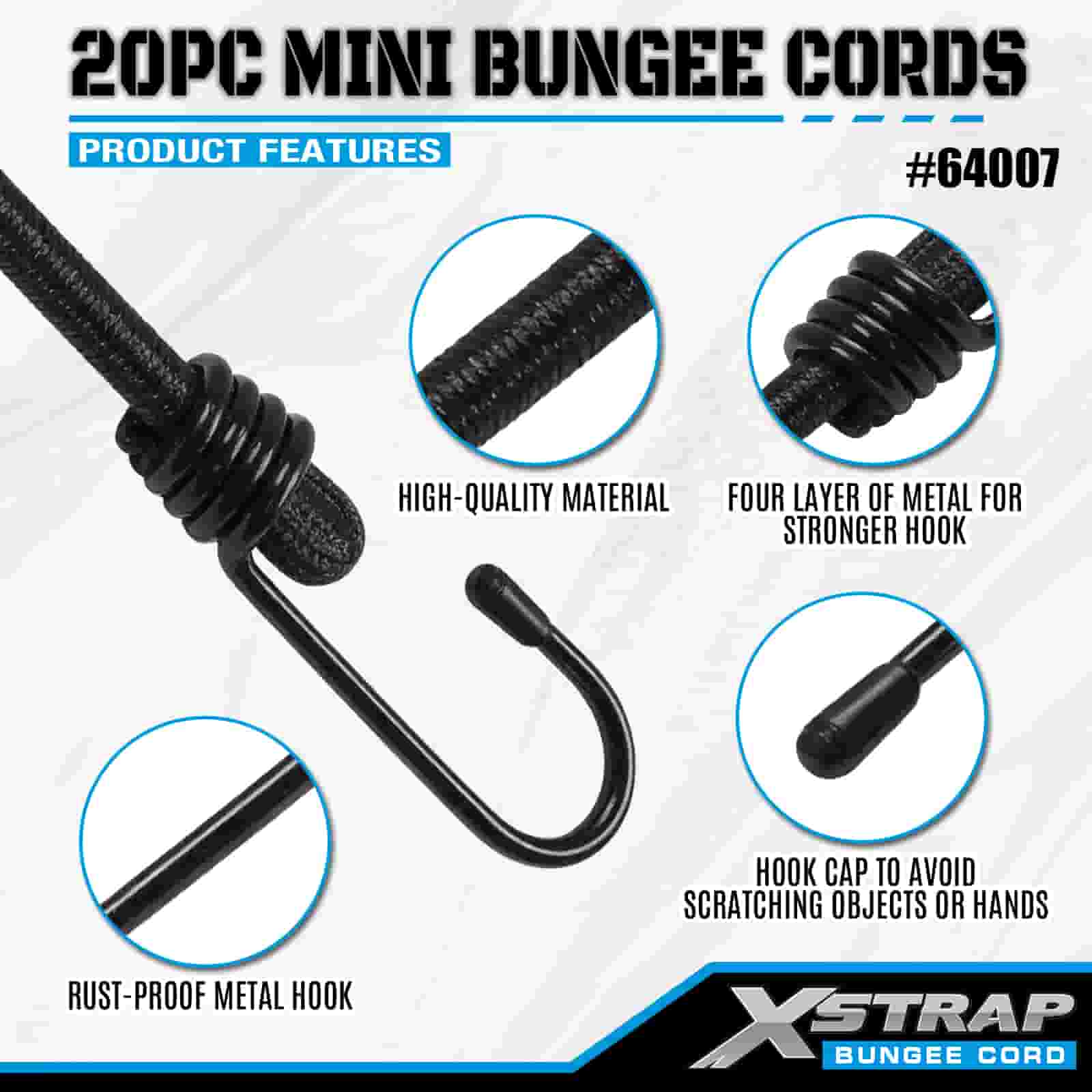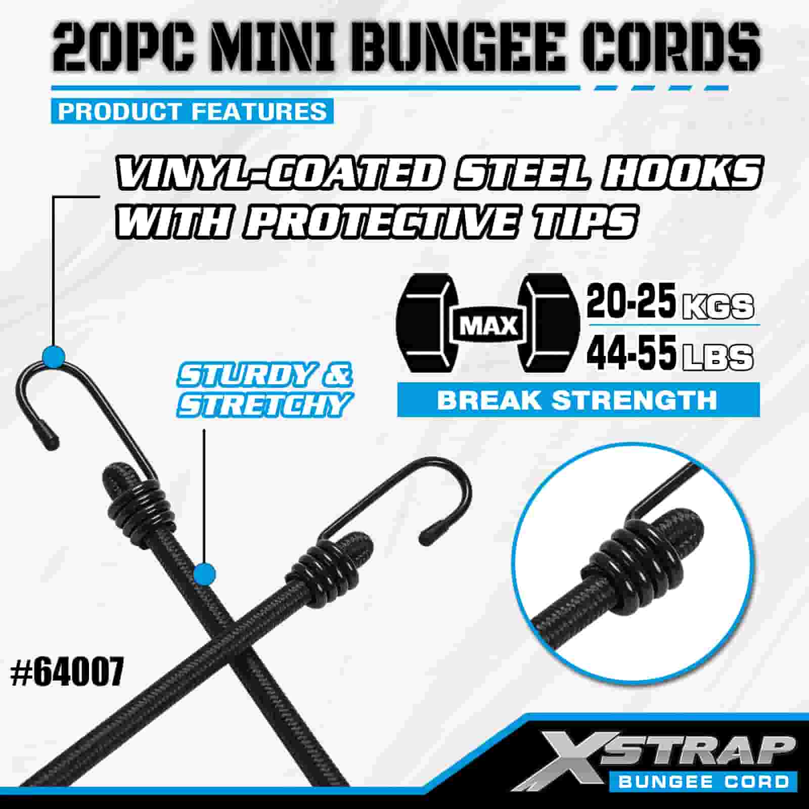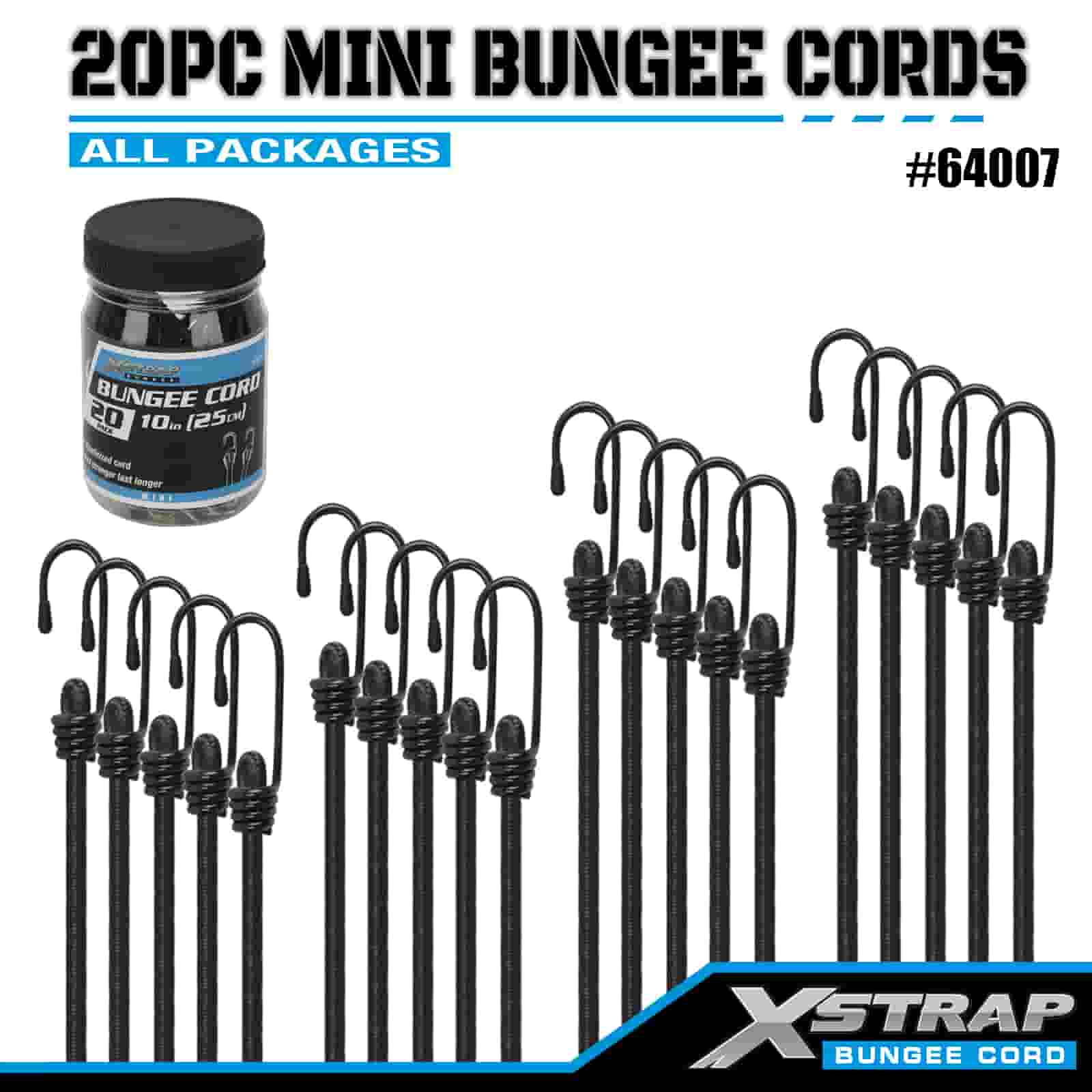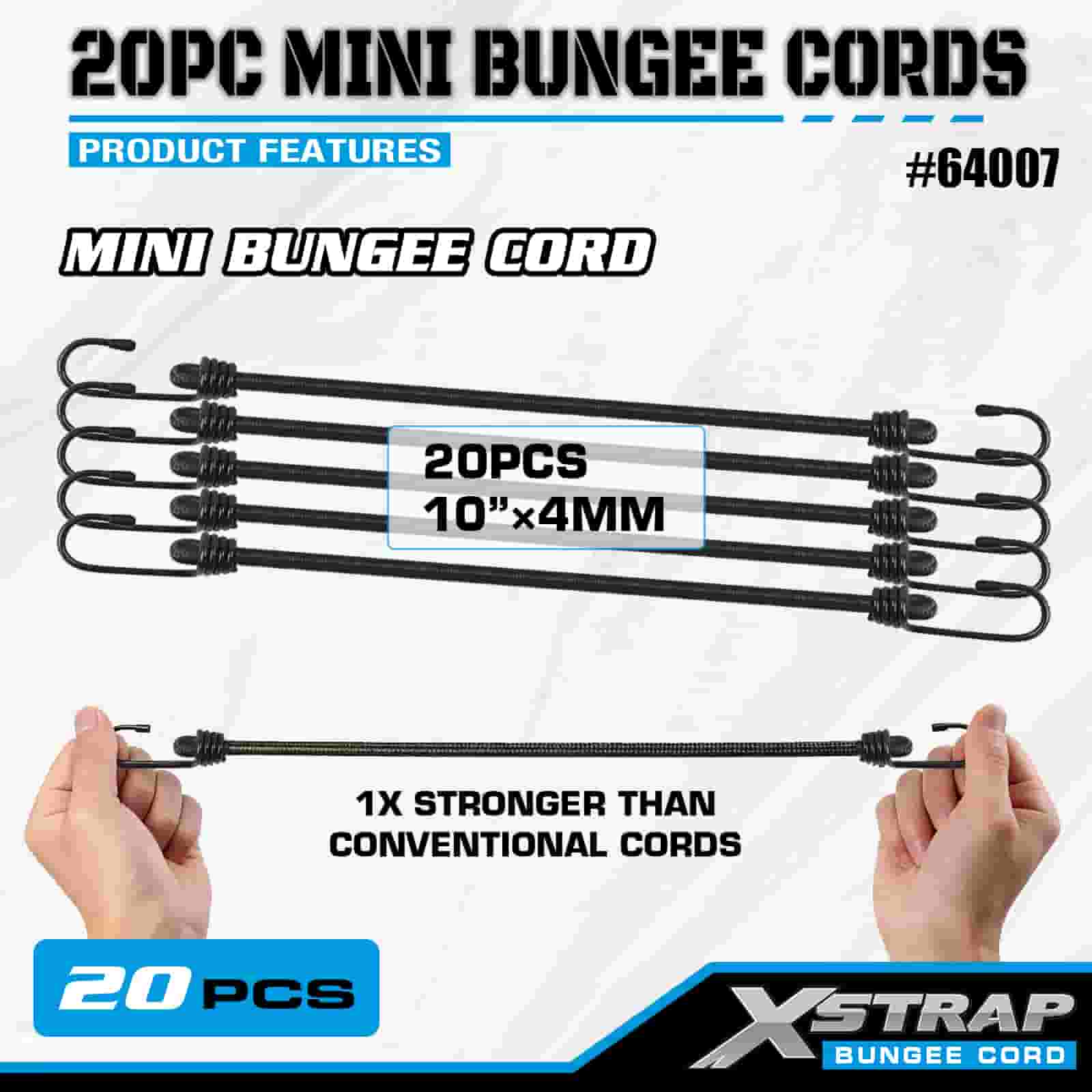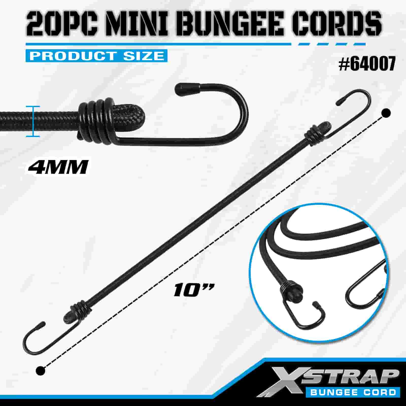 Xstrap 20PK MINI Bungee Cords 4mm x 10", 44-55lbs break strength with steel hooks with protective tips and standard spring hooks.