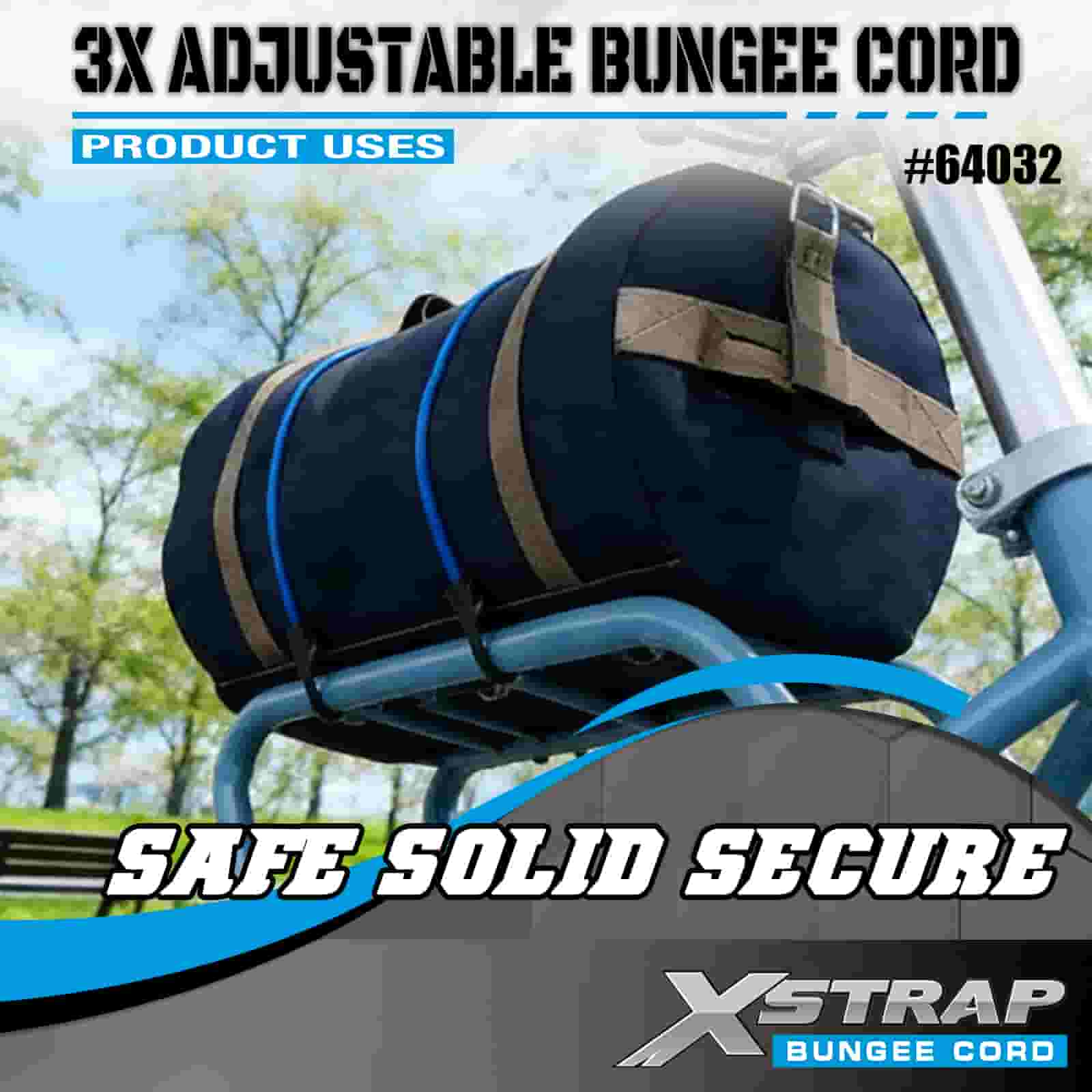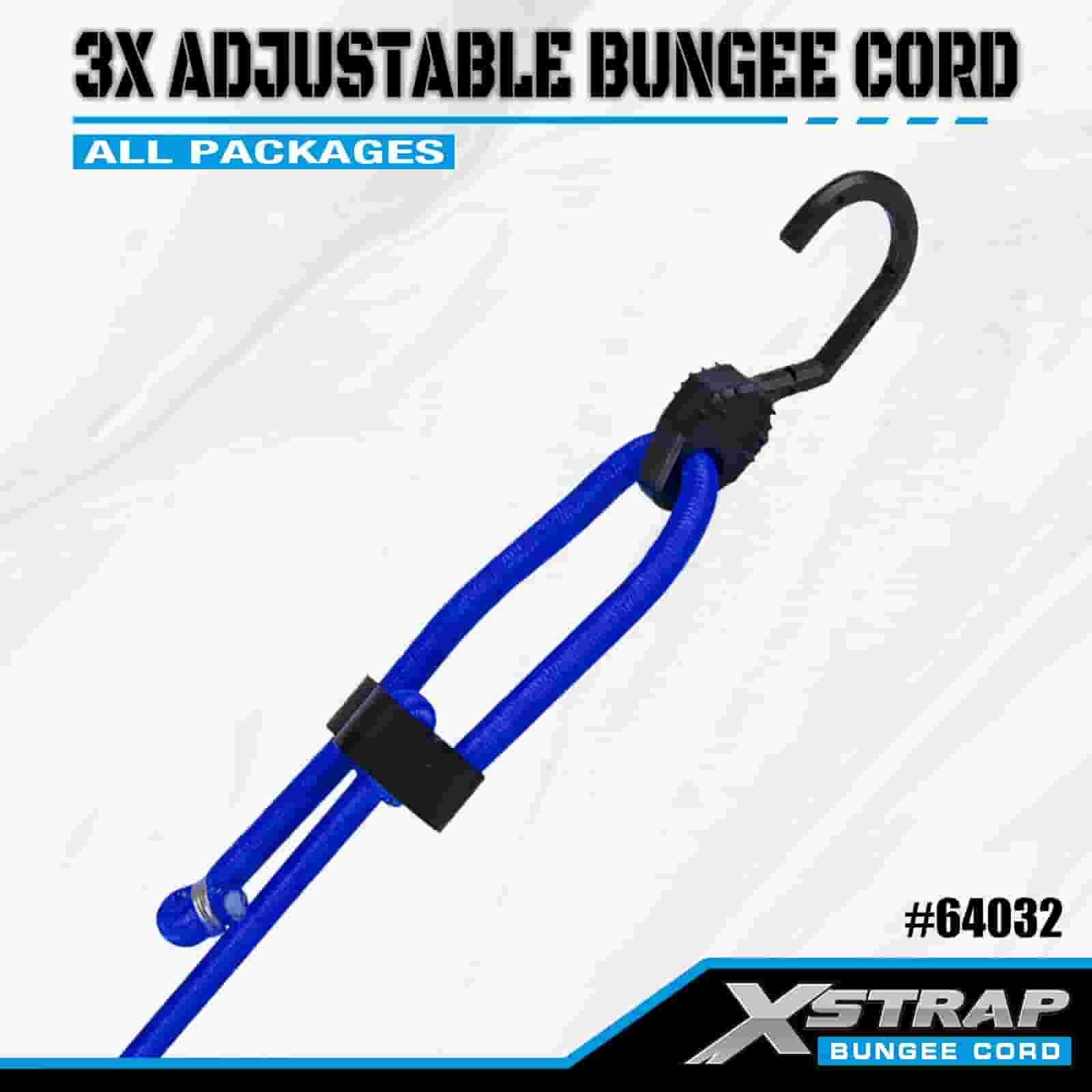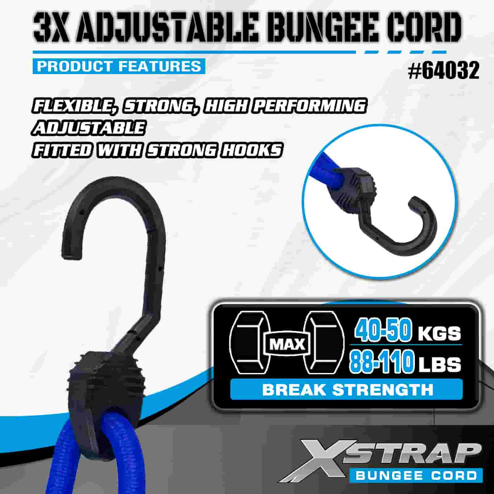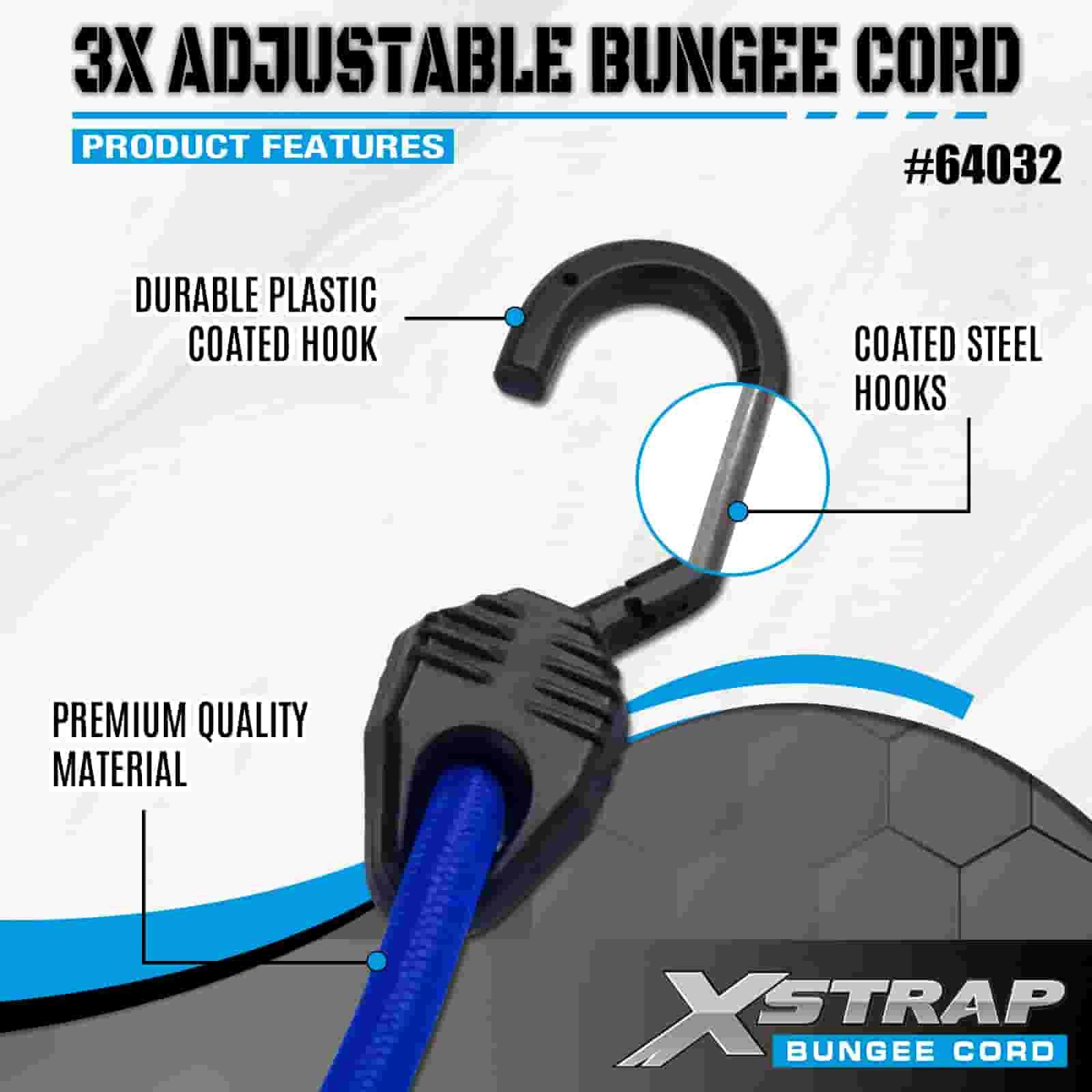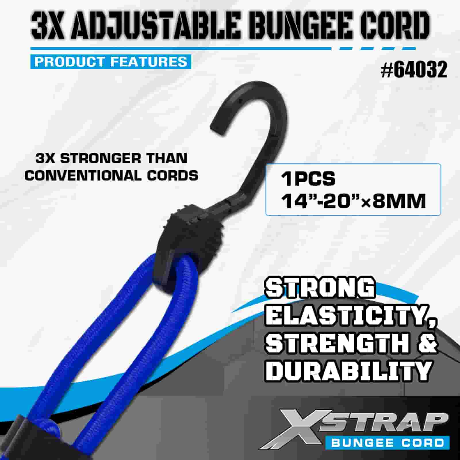 Xstrap 3X Adjustable Bungee Cords 8mm x 14”-20”, 132-165lbs break strength with strong hooks for cargo control.