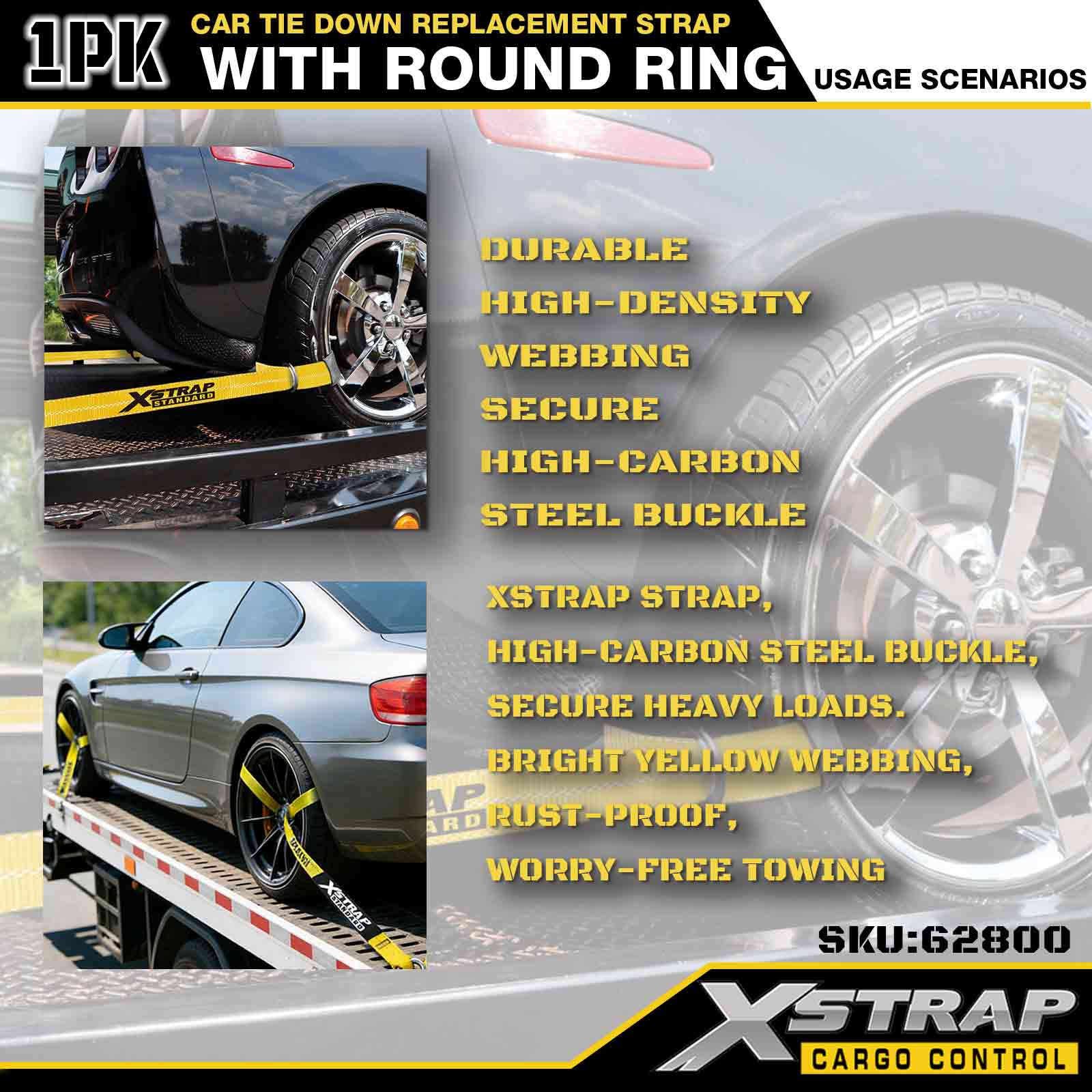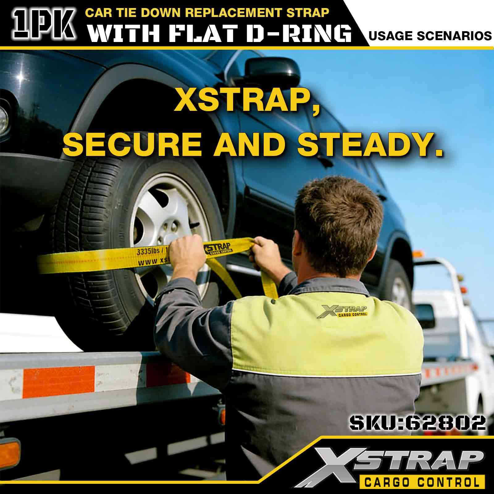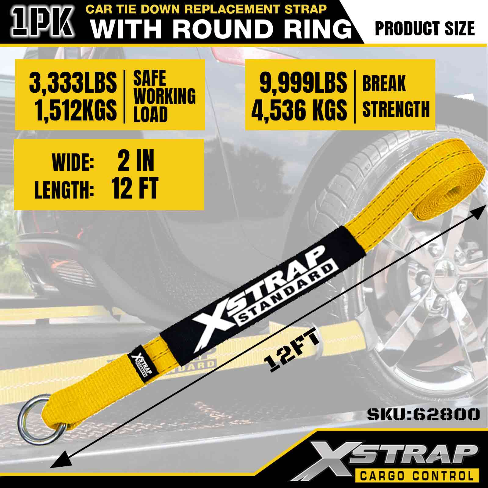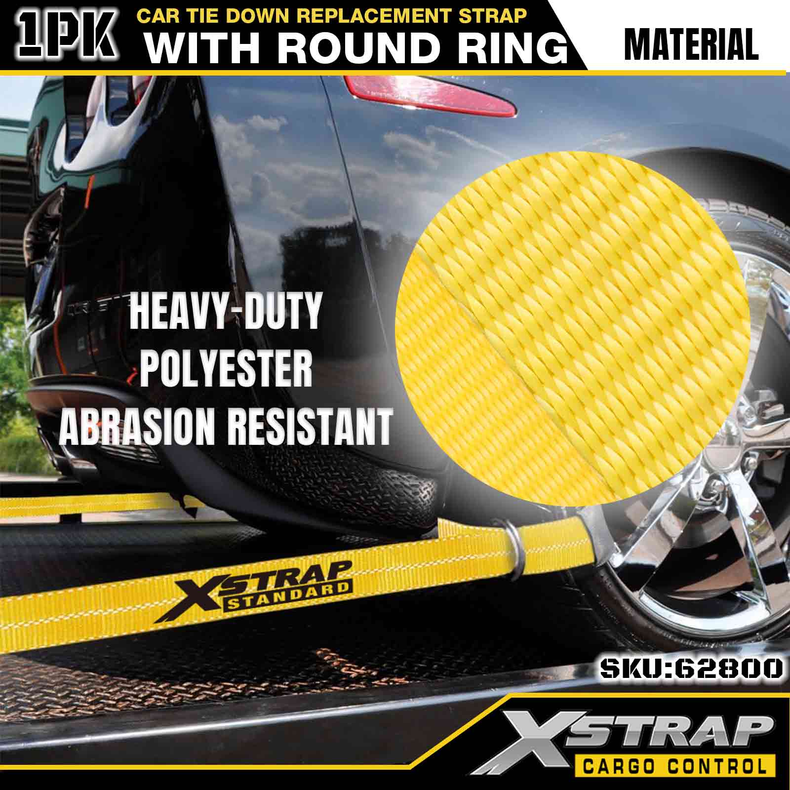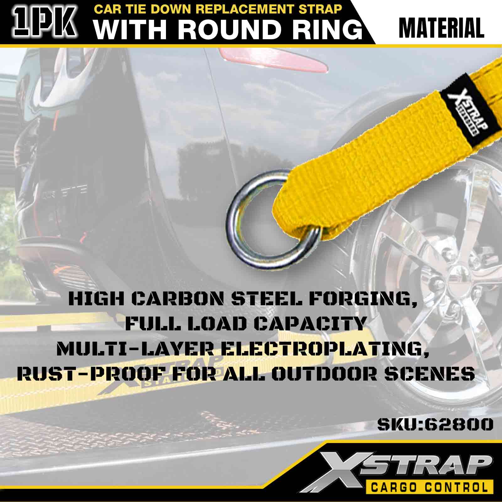 Xstrap Car Tie Down Replacement Strap (with Round Ring) – Standard Duty. It has a safe working load of 3,333LBS (1,512KGs) and a breaking strength of 9,999LBS (4,536KGs).