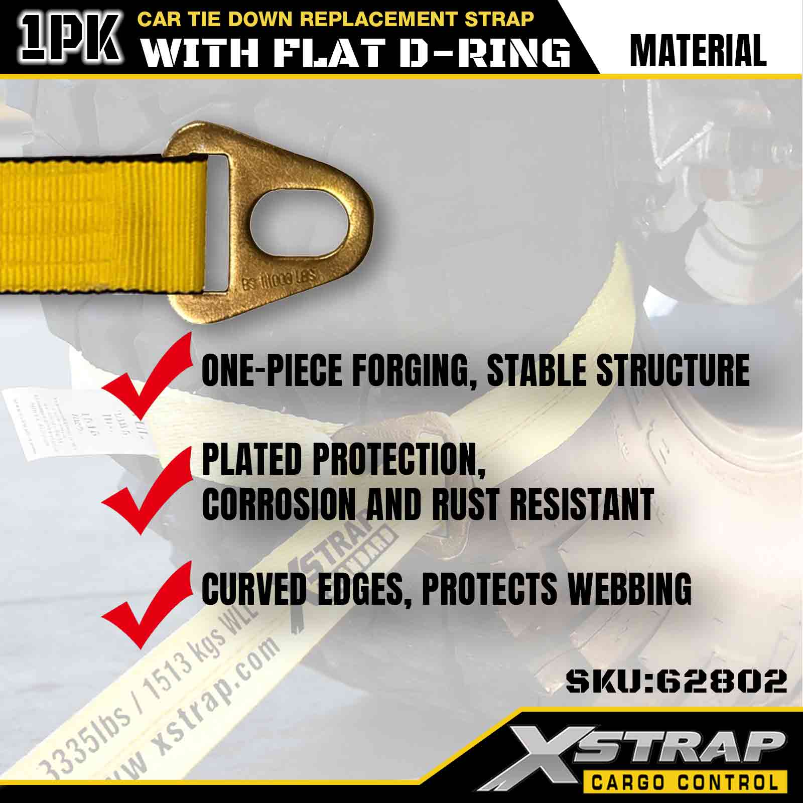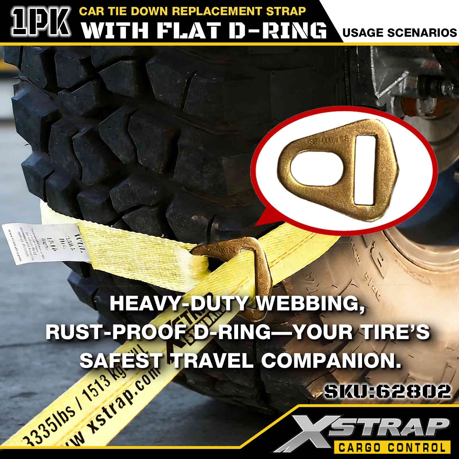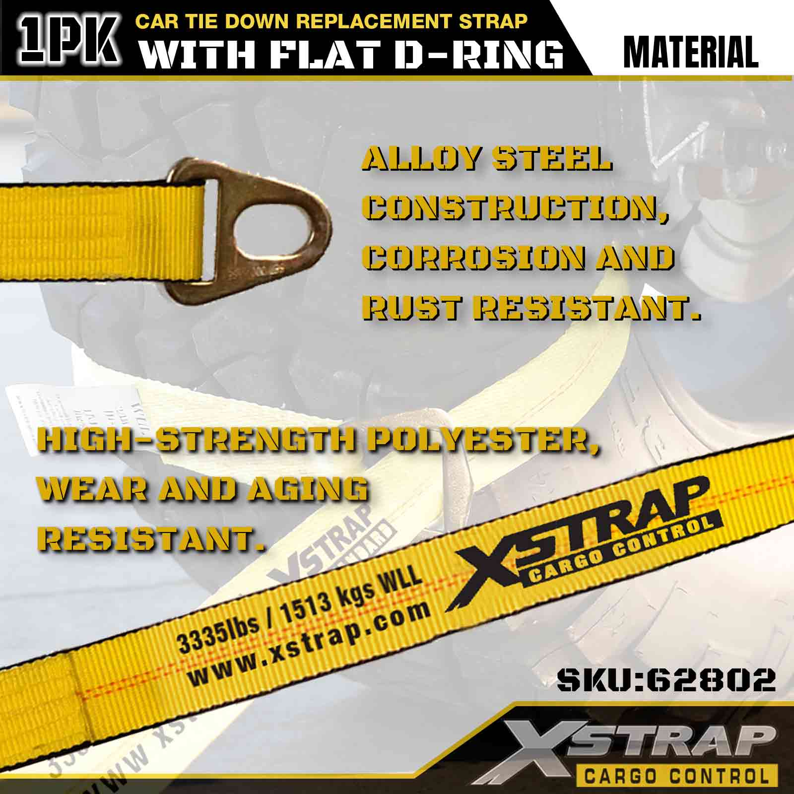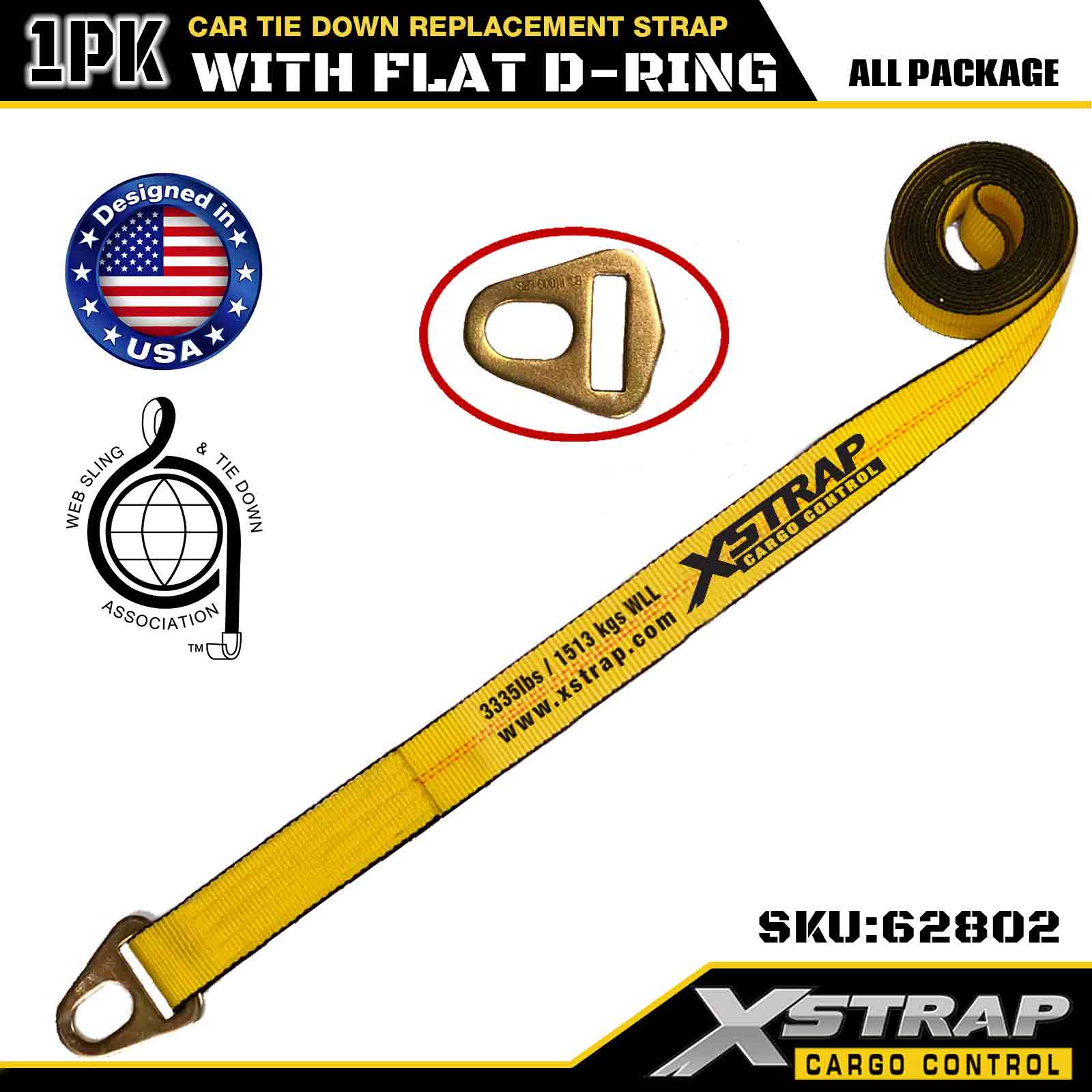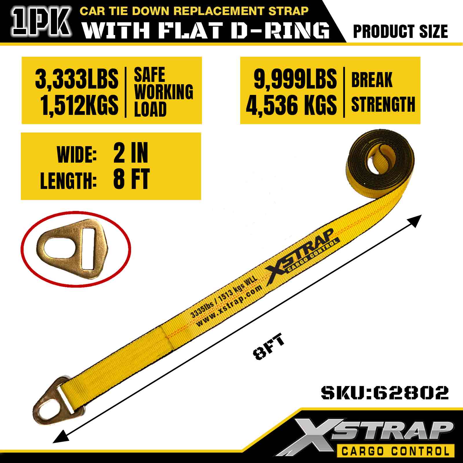 Xstrap Car Tie Down Replacement Strap (with Flat D-Ring) – Standard Duty. It has a safe working load of 3,333LBS (1,512KGs) and a breaking strength of 9,999LBS (4,536KGs).