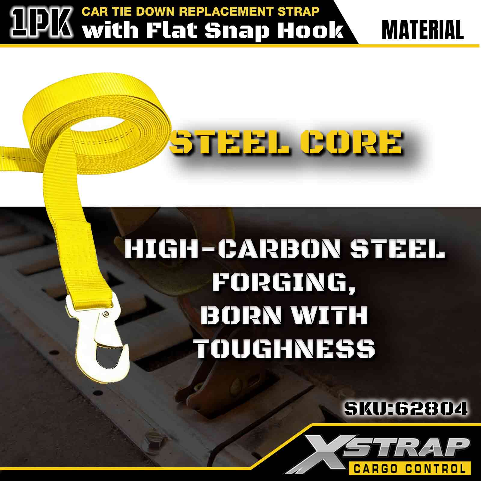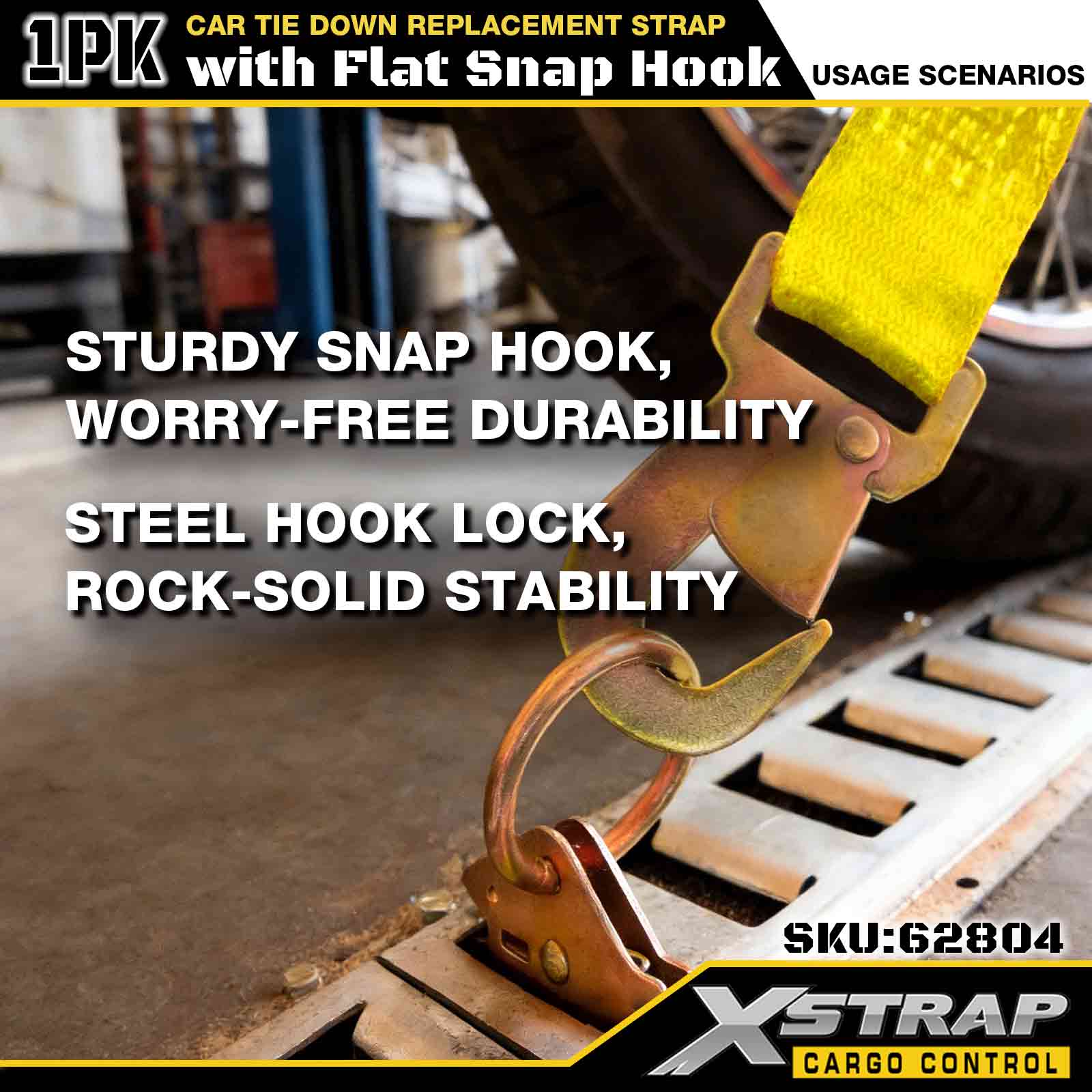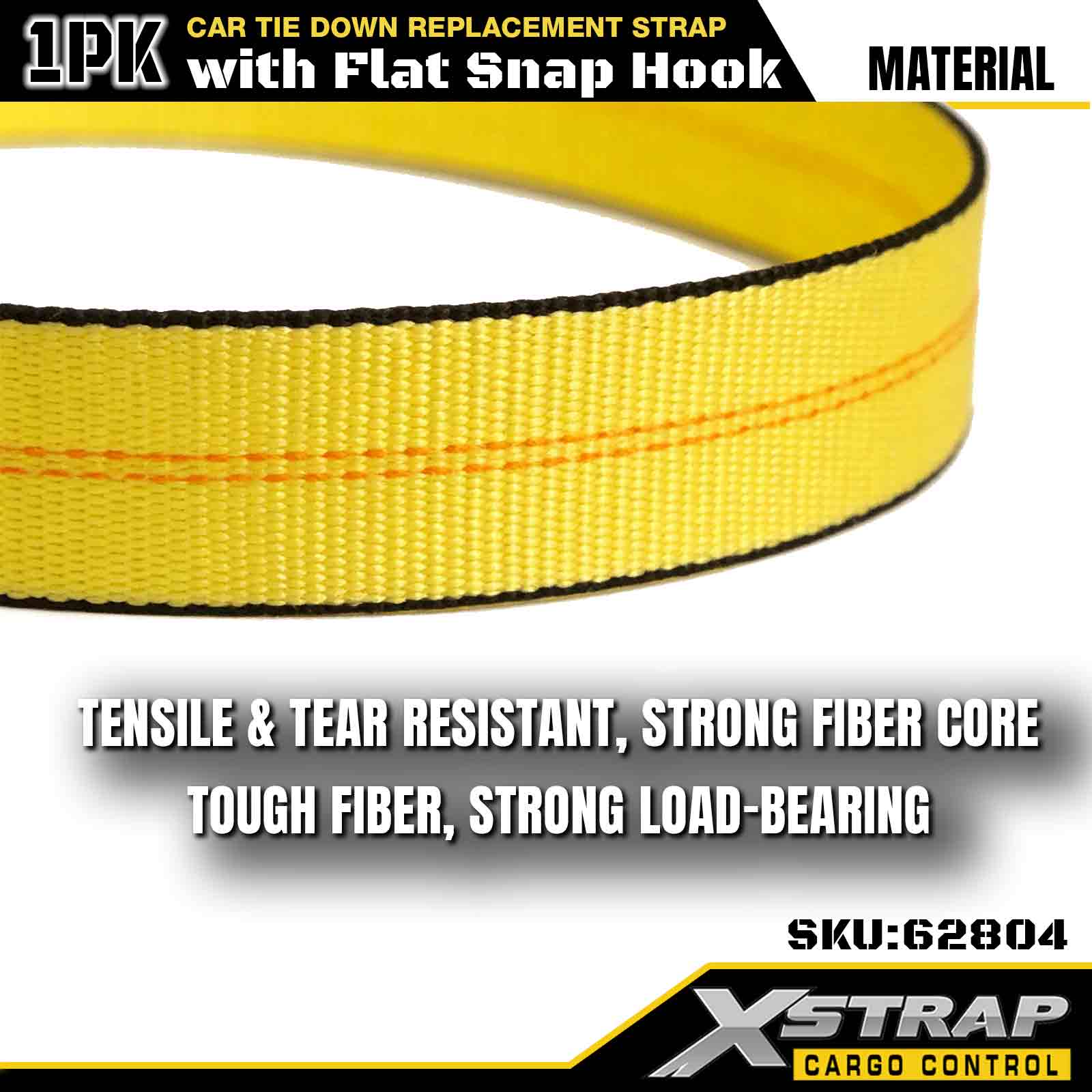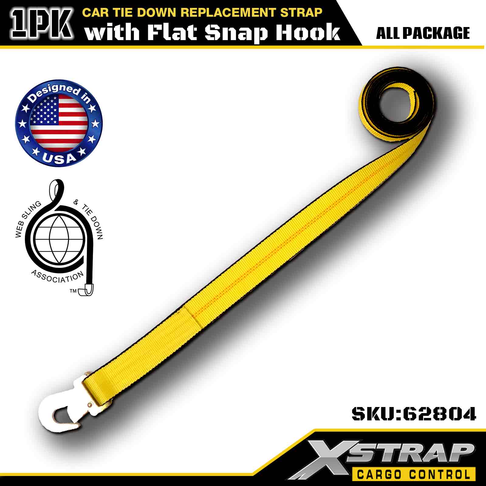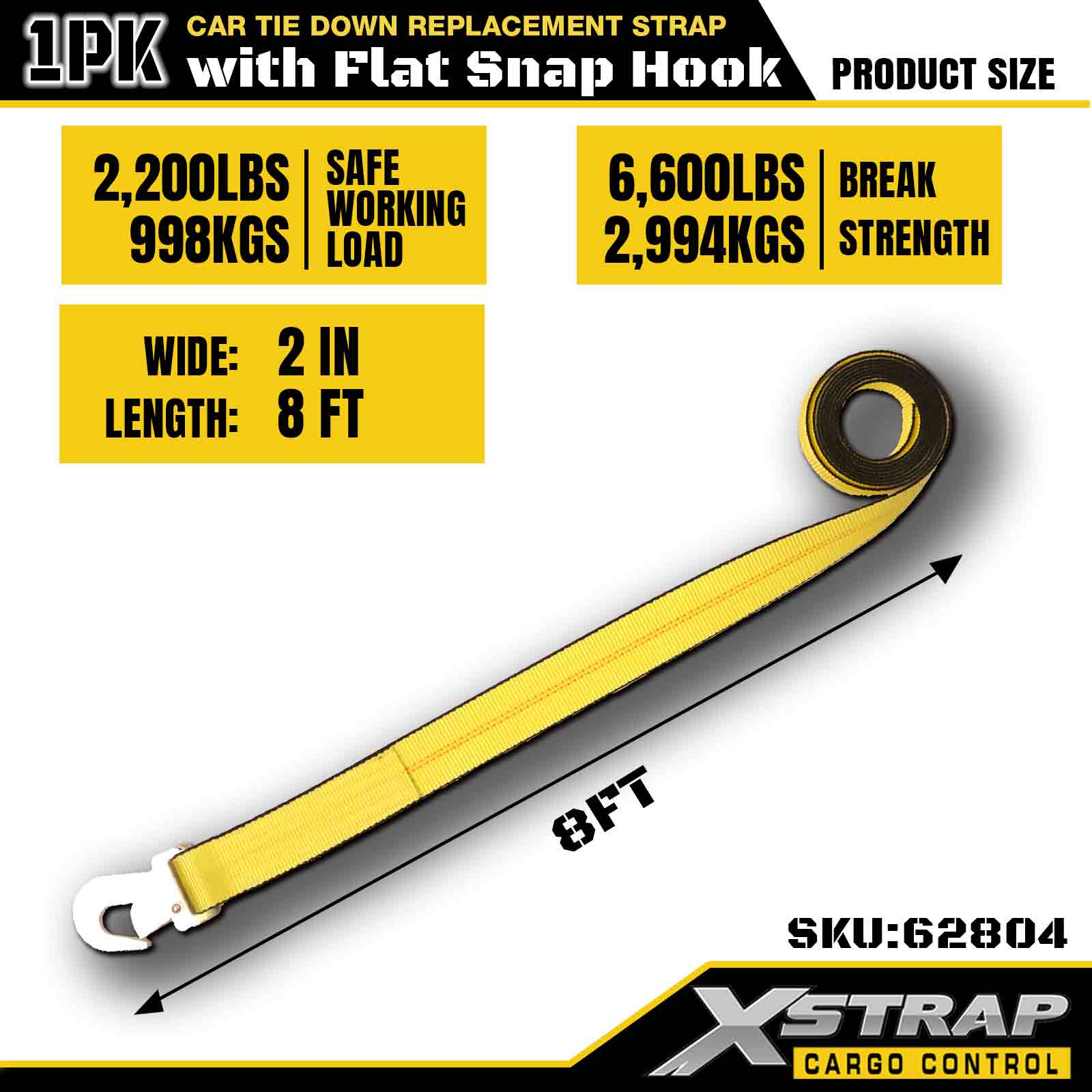 Xstrap Car Tie Down Replacement Strap (with Flat Snap Hook) – Standard Duty. It has a safe working load of 2,200LBS (998KGs) and a breaking strength of 6,600LBS (2,994KGs).