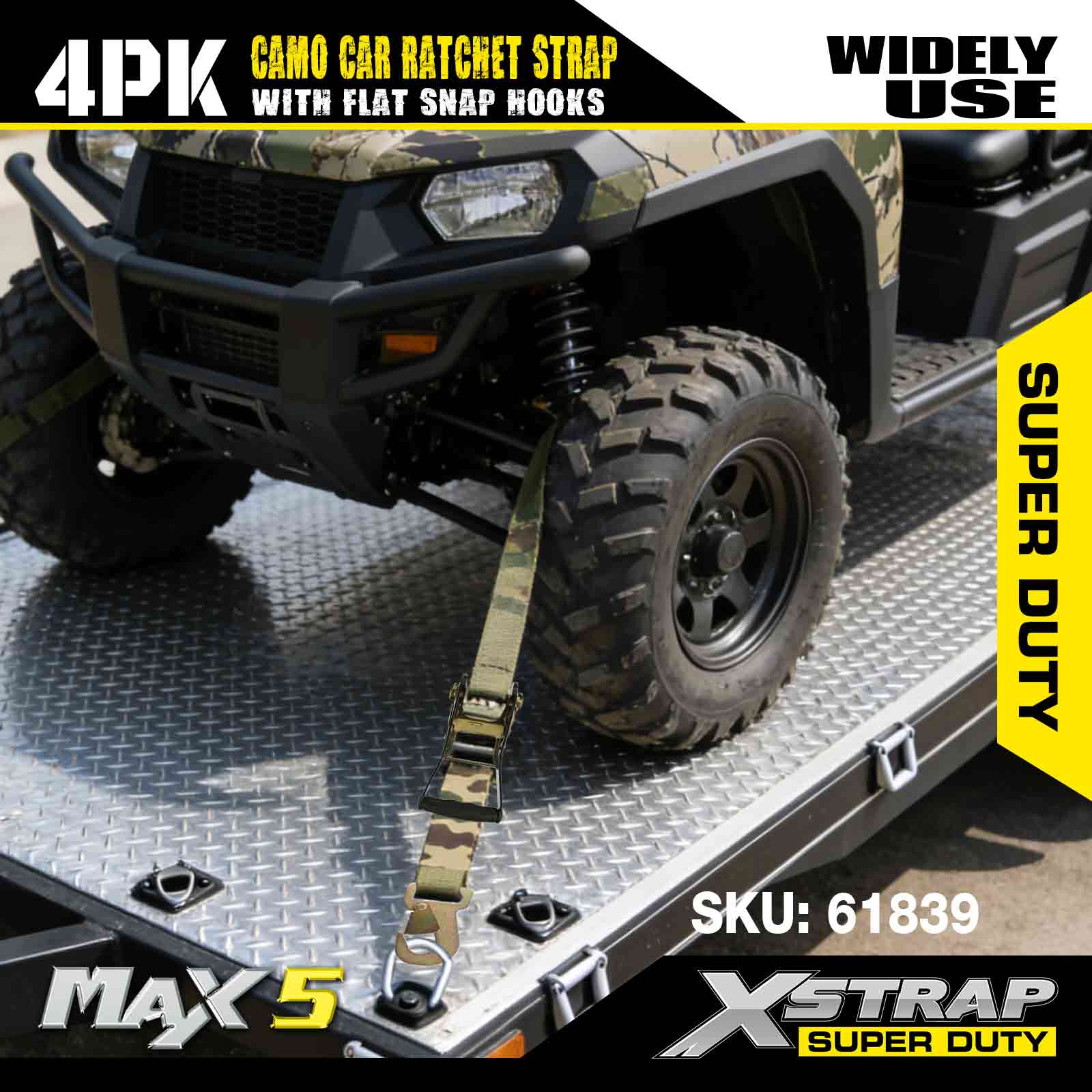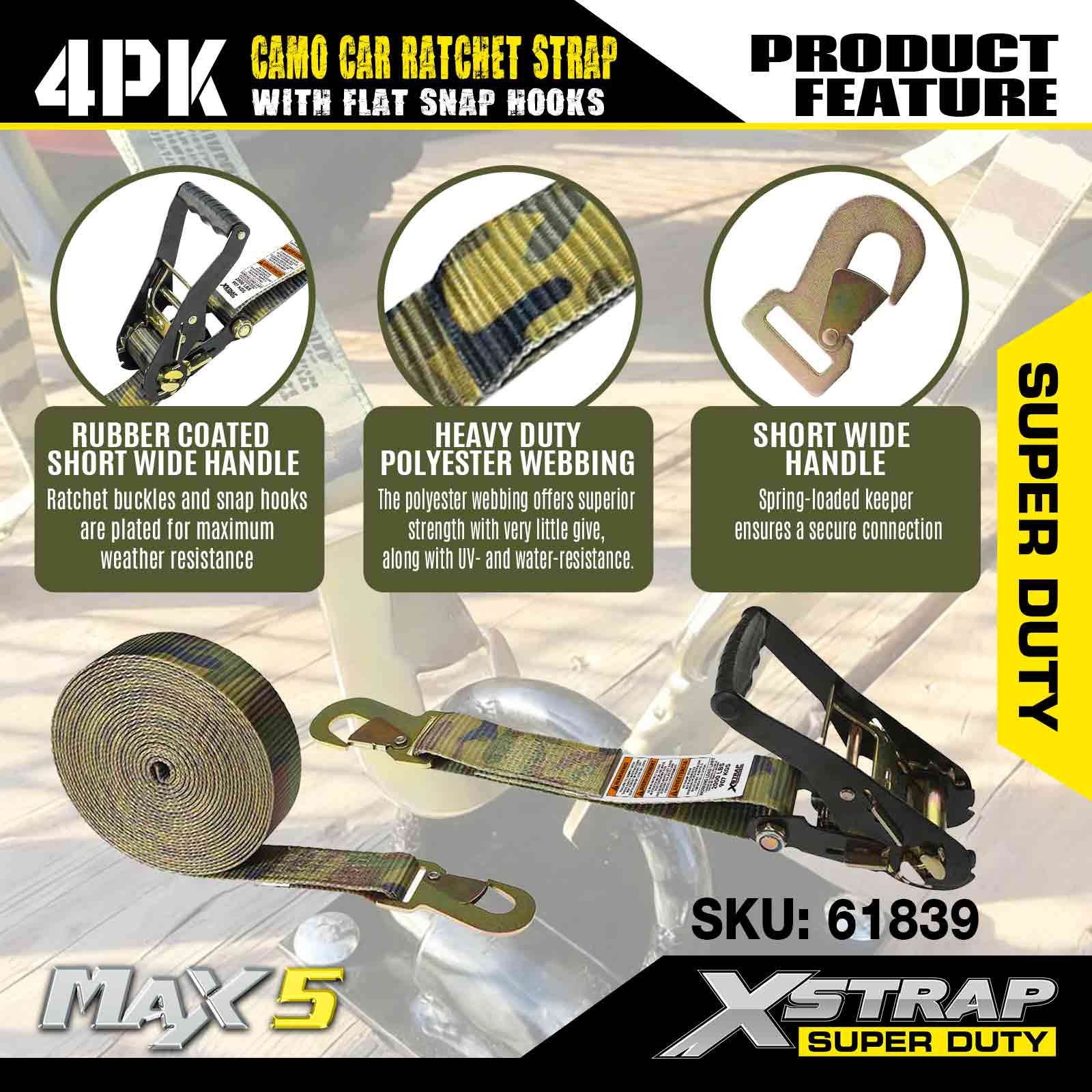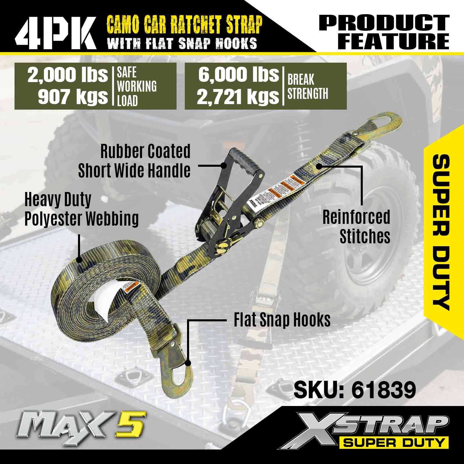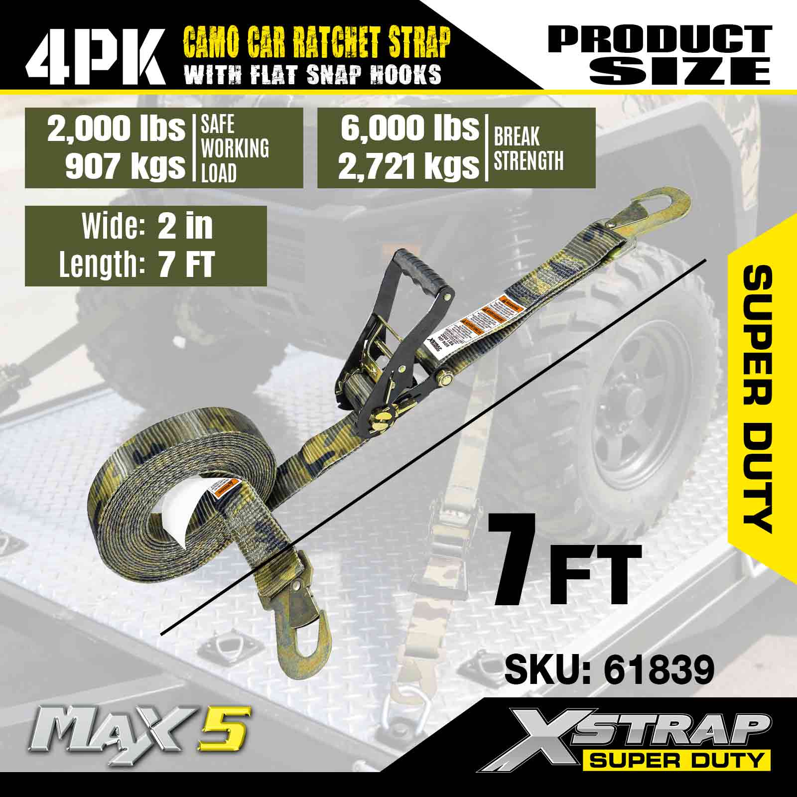 Xstrap Cargo Control Auto Ratchet Straps with Flat Snap Hooks 2 Inch x 7 Foot (4-Pack), 6,000 LBS Break Strength, Versatile Ratchet Straps with Flat Locking Hooks, Tie Down Cars, Motorcycles, & Other Vehicles