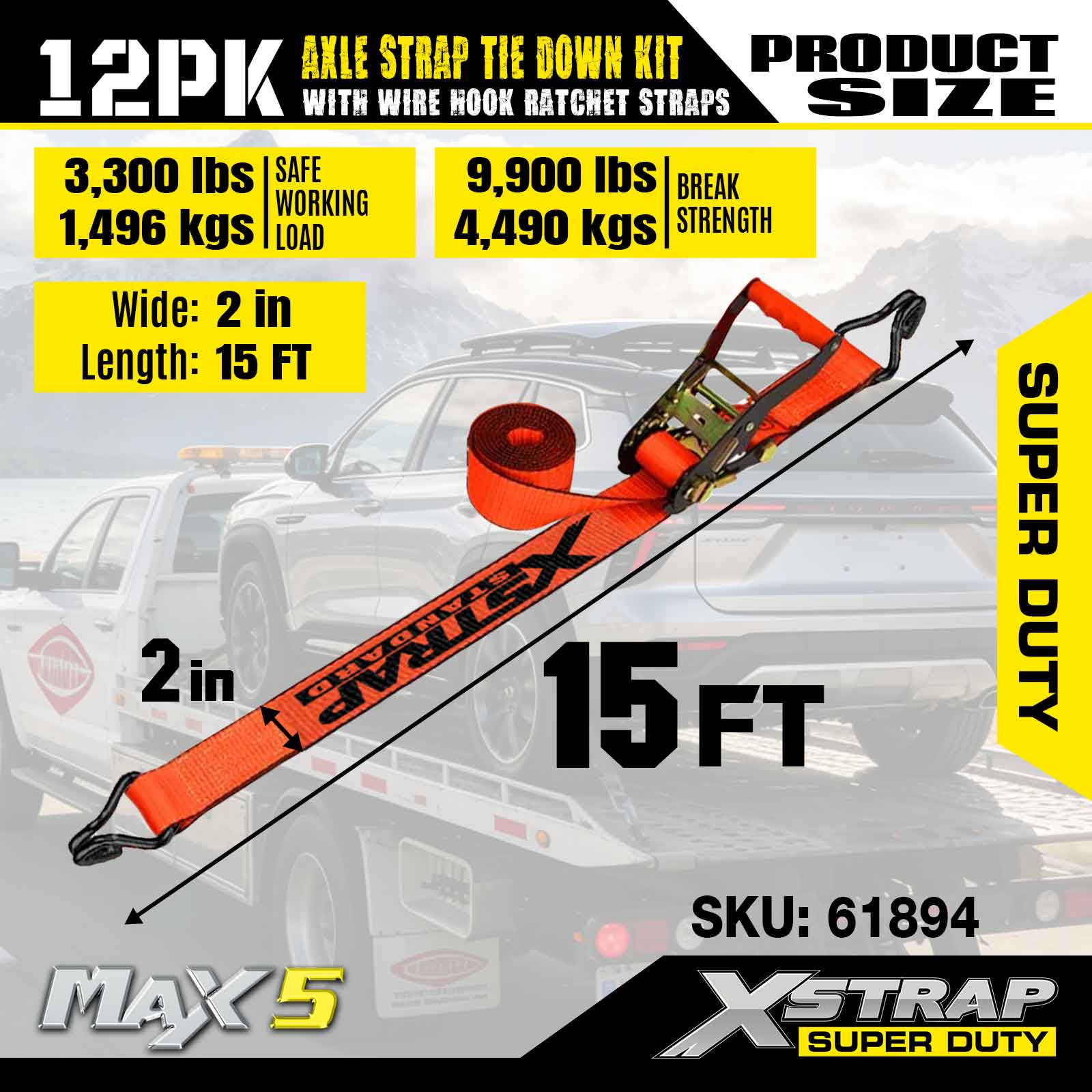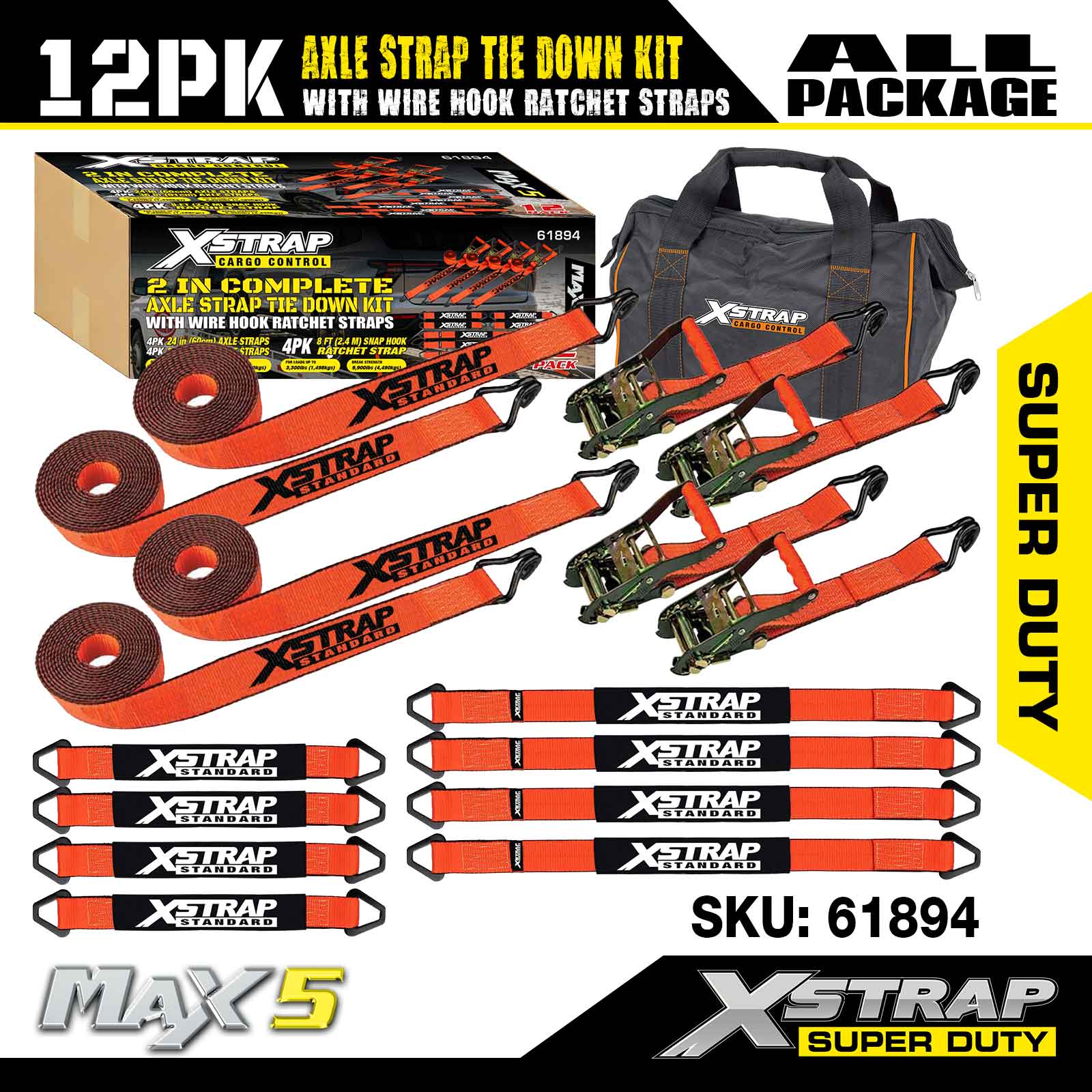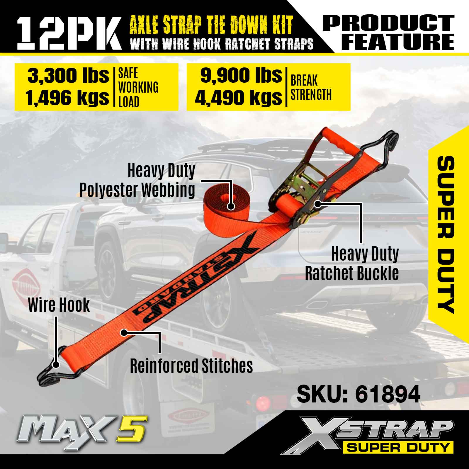 Xstrap 12PK Axle Strap Tie Down Kit (with Wire Hook Ratchet Straps) – Super Duty. It has a safe working load of 3,300LBS (1,496KGs) and a breaking strength of 9,900LBS (4,490KGs).