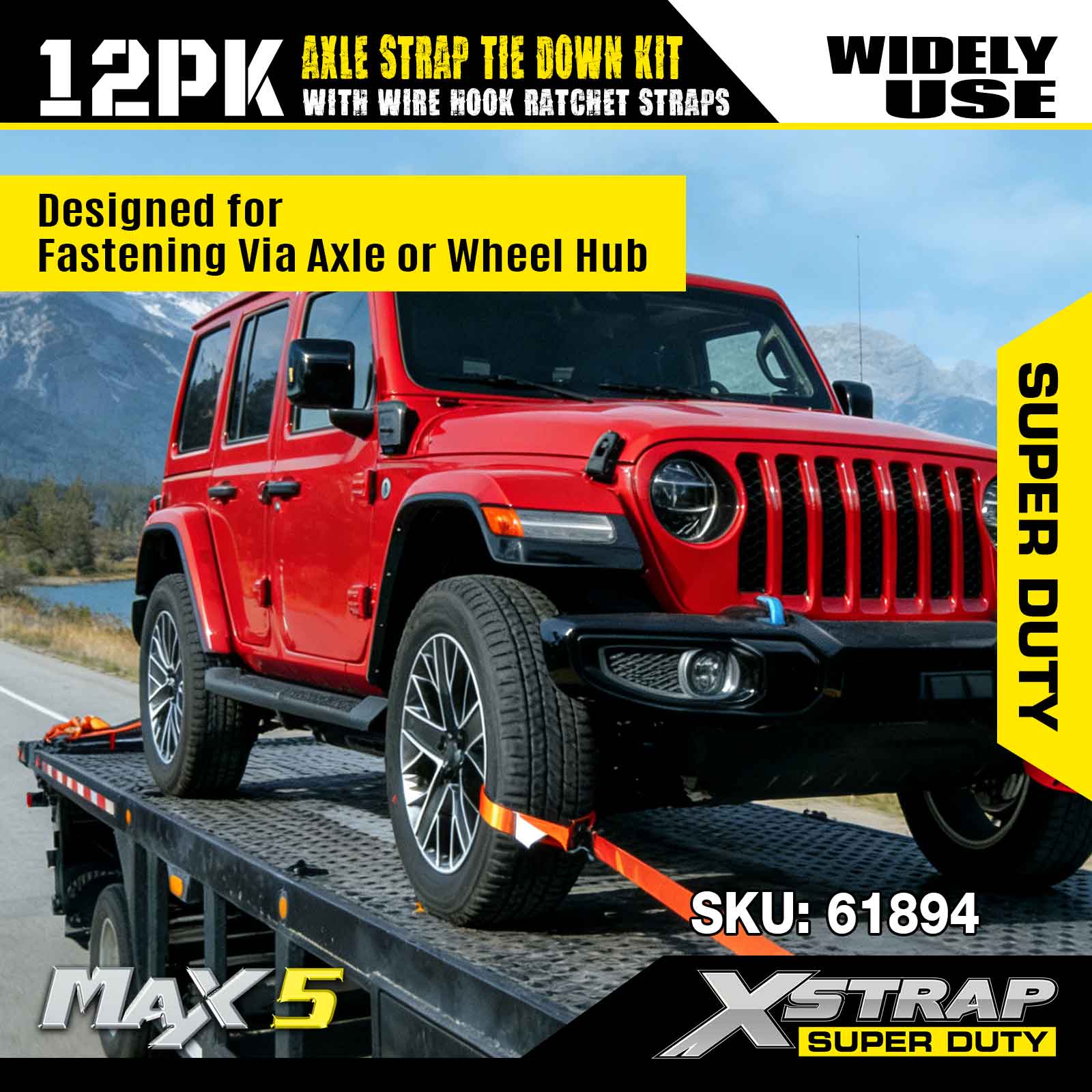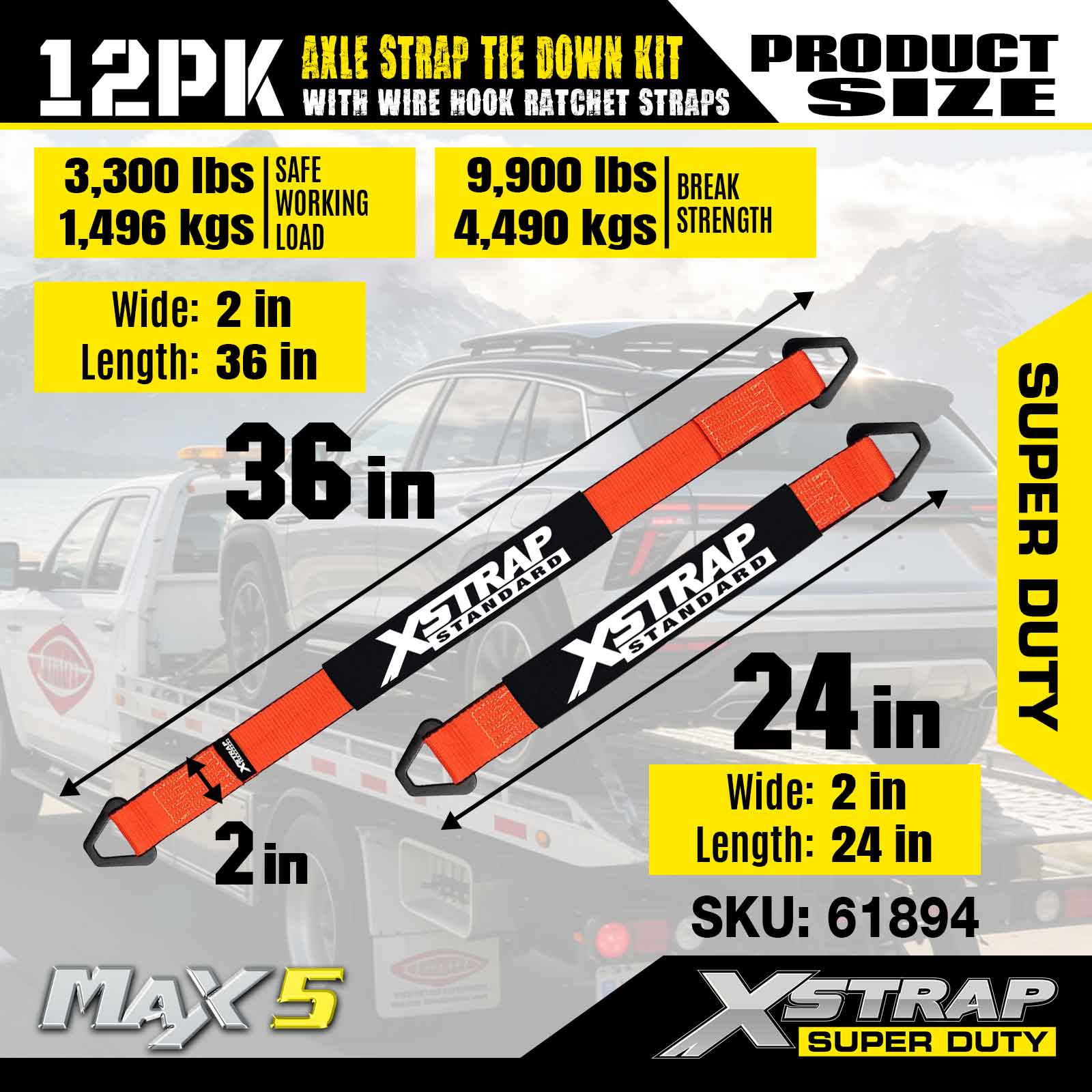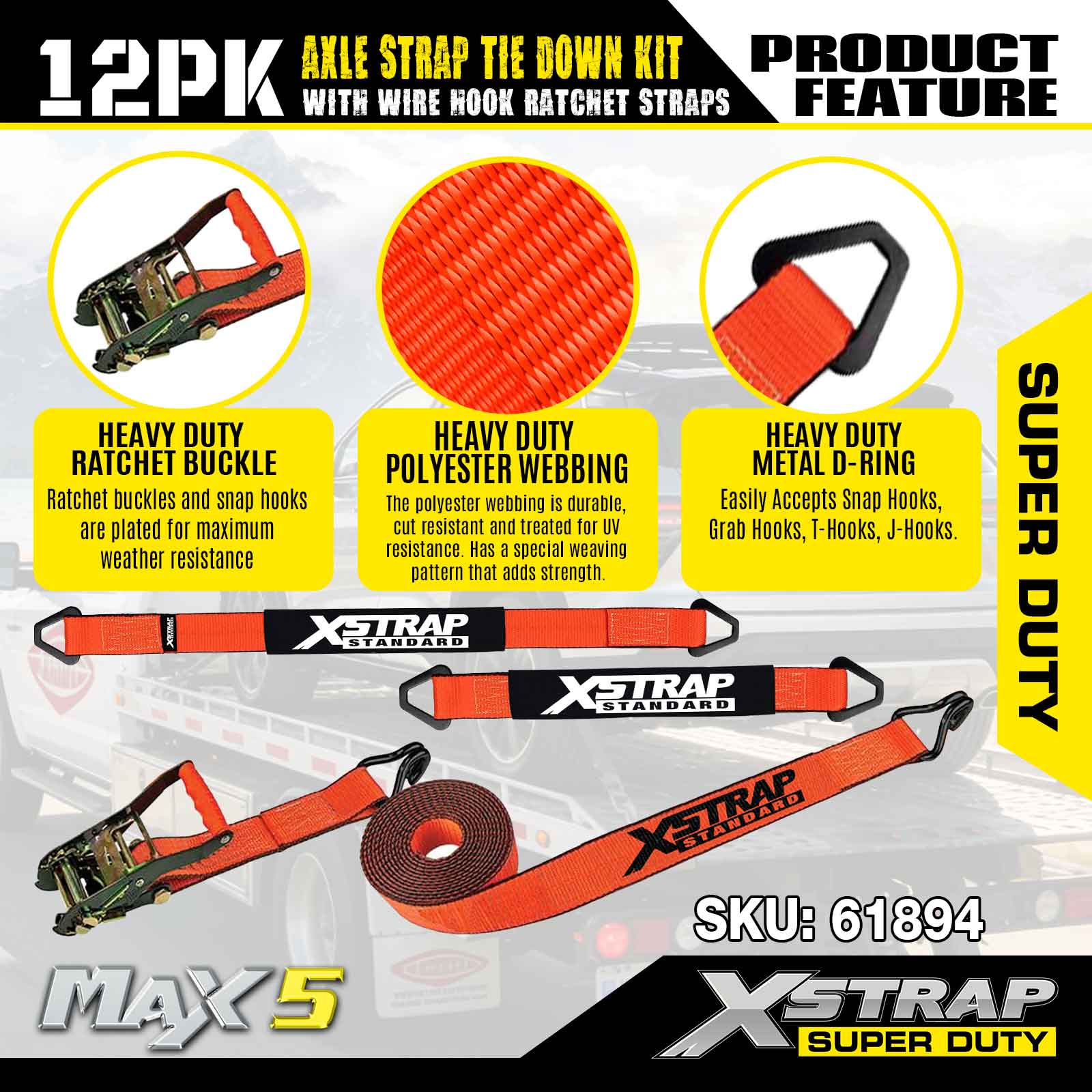 Xstrap 12PK Axle Strap Tie Down Kit (with Wire Hook Ratchet Straps) – Super Duty. It has a safe working load of 3,300LBS (1,496KGs) and a breaking strength of 9,900LBS (4,490KGs).