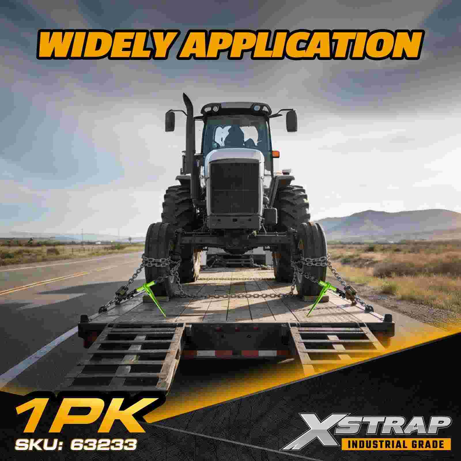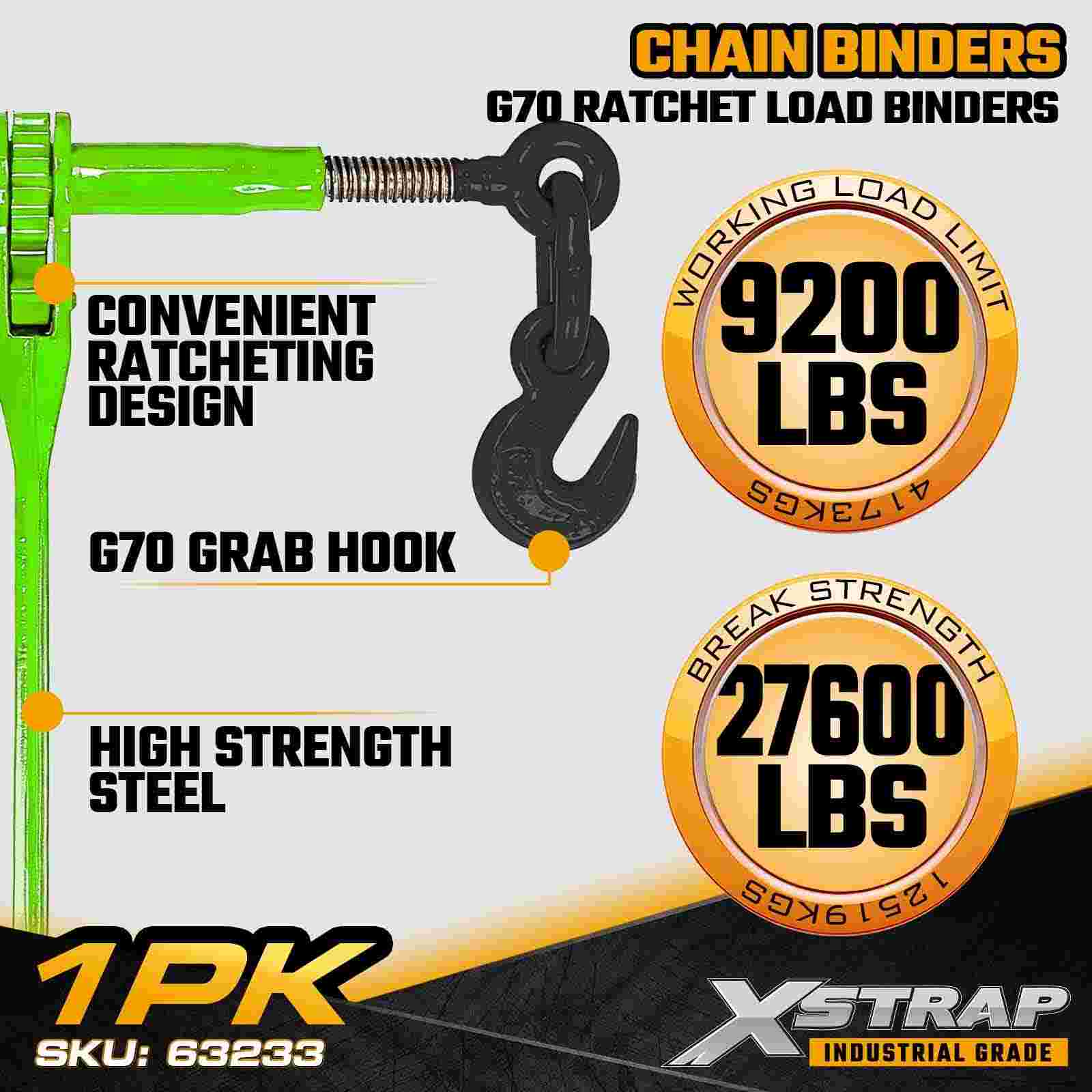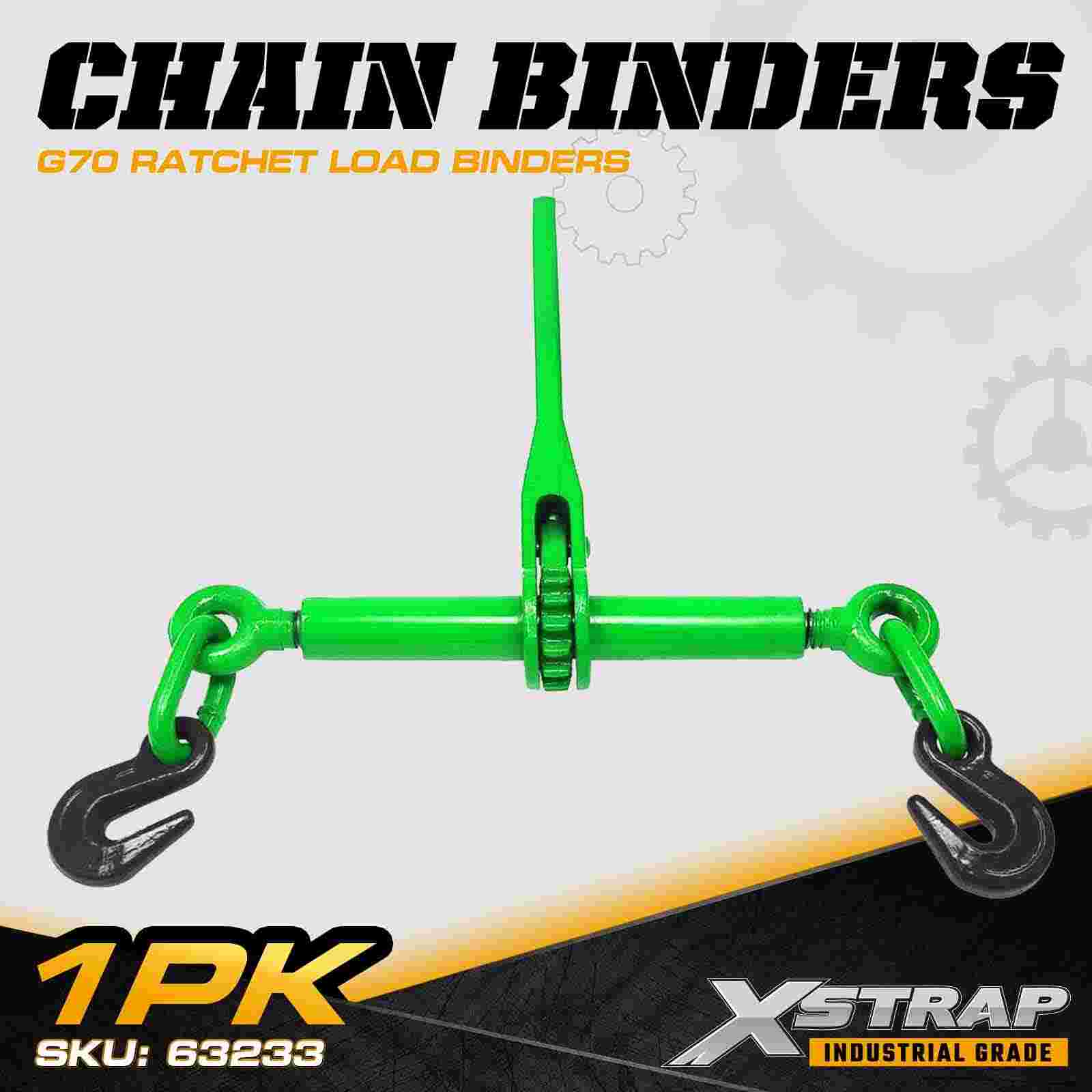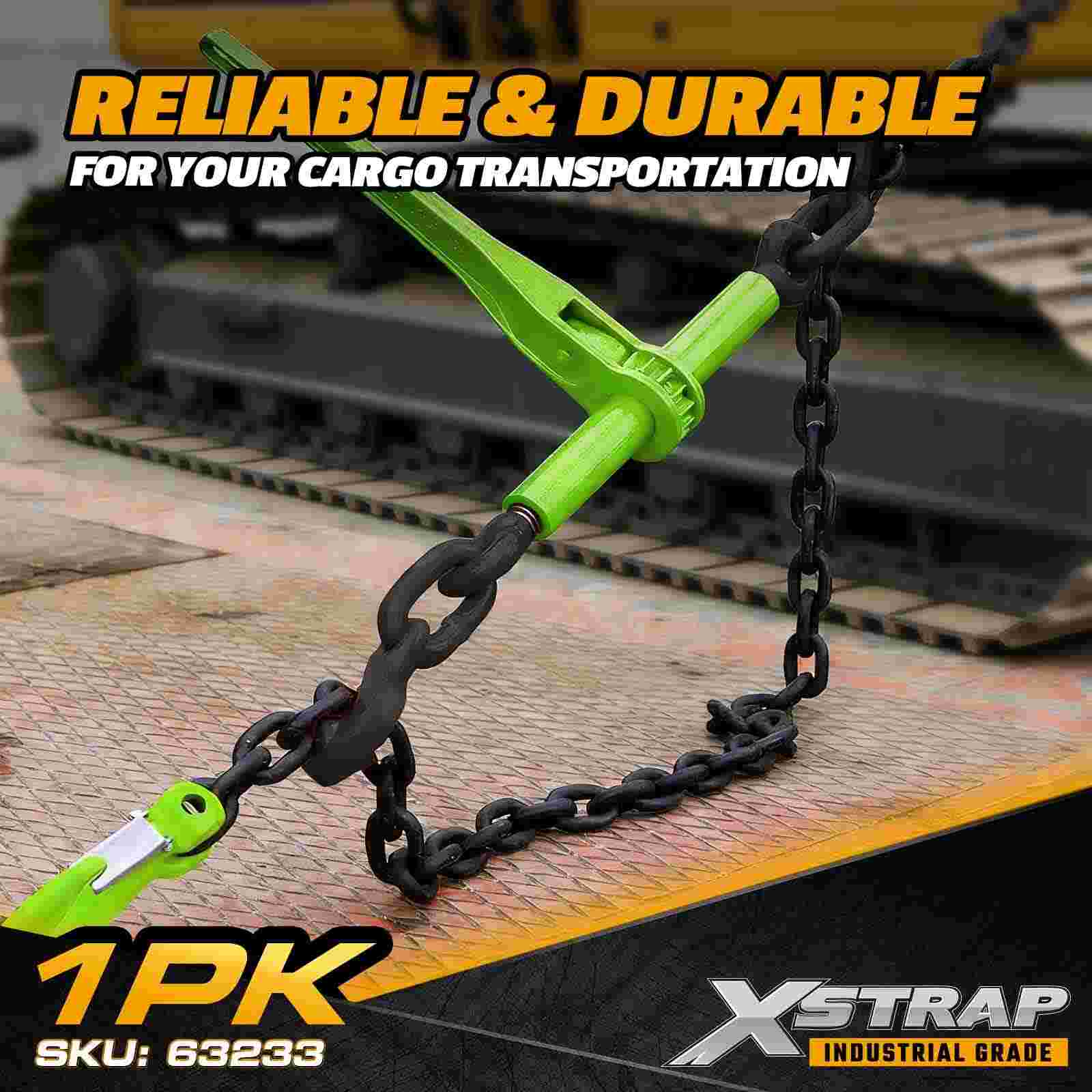 The Xstrap 63233 Grade 70 Ratchet Load Binder is a heavy-duty chain tensioning tool engineered for securing large machinery, construction materials, and industrial cargo on flatbed trailers and transport vehicles. Designed to work with 3/8" and 1/2" Grade 70 transport chains, this ratchet binder provides smooth, controlled tensioning through its geared ratcheting mechanism. Built from high-strength alloy steel and designed for demanding field conditions, it delivers a 9,200 lbs Working Load Limit, making it ideal for professional heavy-haul operations.