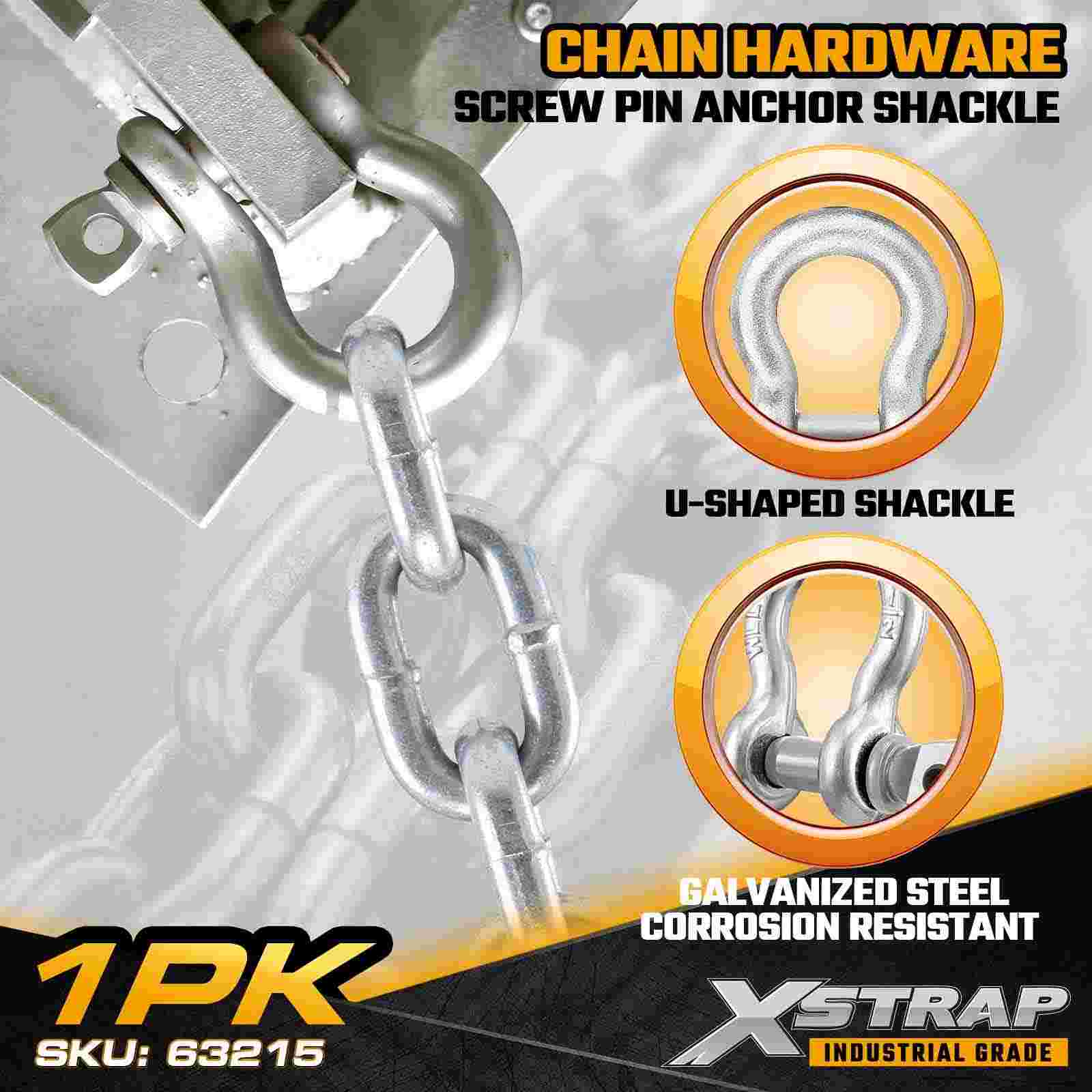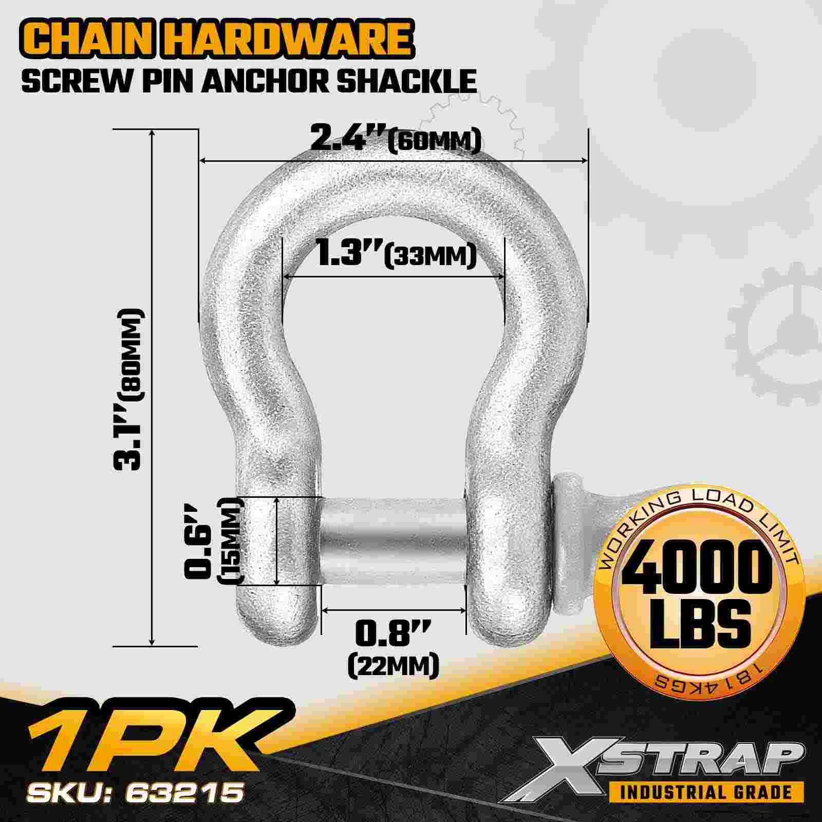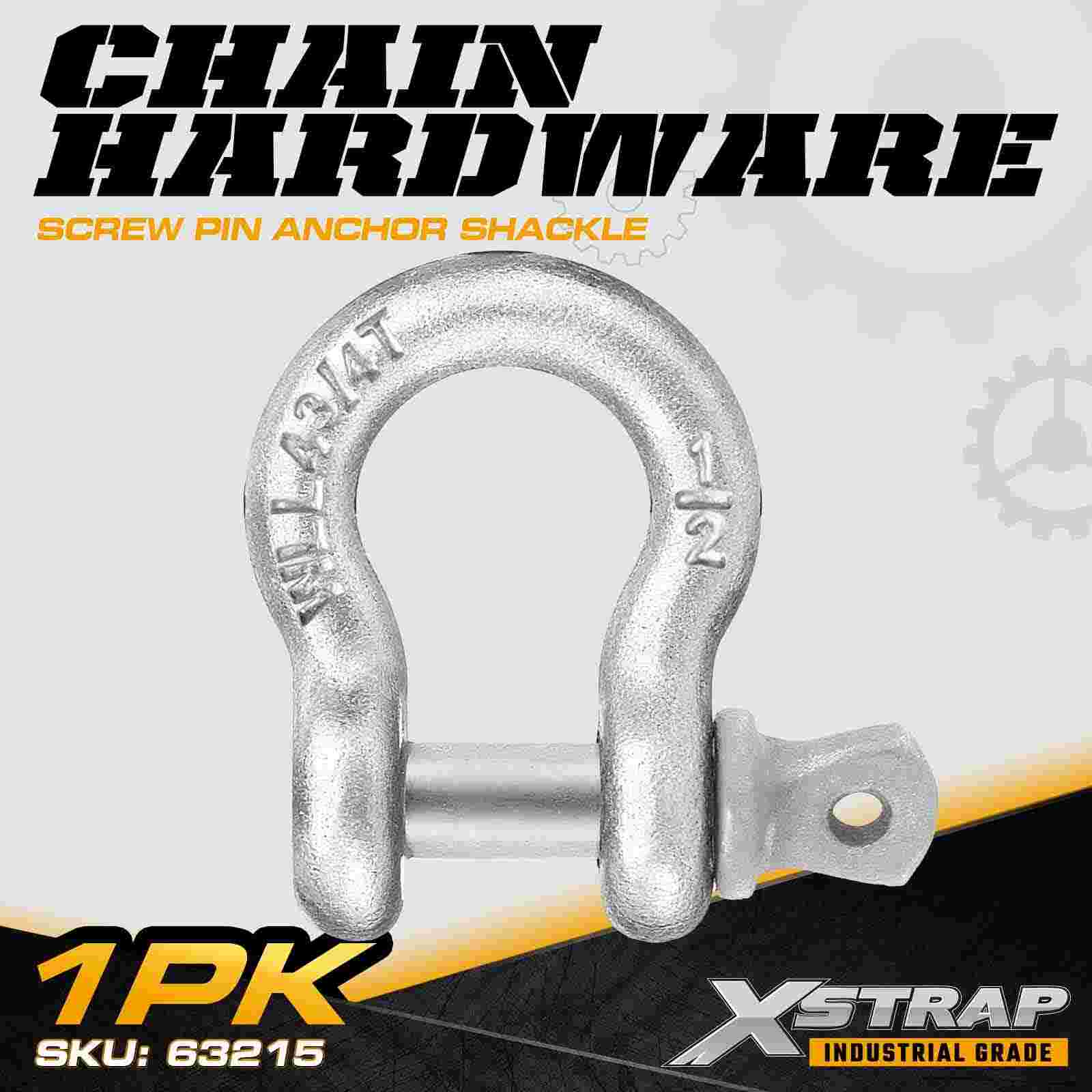 The Xstrap 63215 1/2" Screw Pin Anchor Shackle is a heavy-duty rigging and connection component designed for lifting, towing, anchoring, and industrial securement applications. Manufactured from forged steel and protected with a corrosion-resistant zinc-plated finish, this shackle delivers a 4,000 lbs Working Load Limit, making it suitable for medium-to-heavy duty operations. The screw-pin design allows quick installation and removal, offering convenience for both permanent and temporary setups across construction, marine, and utility environments.