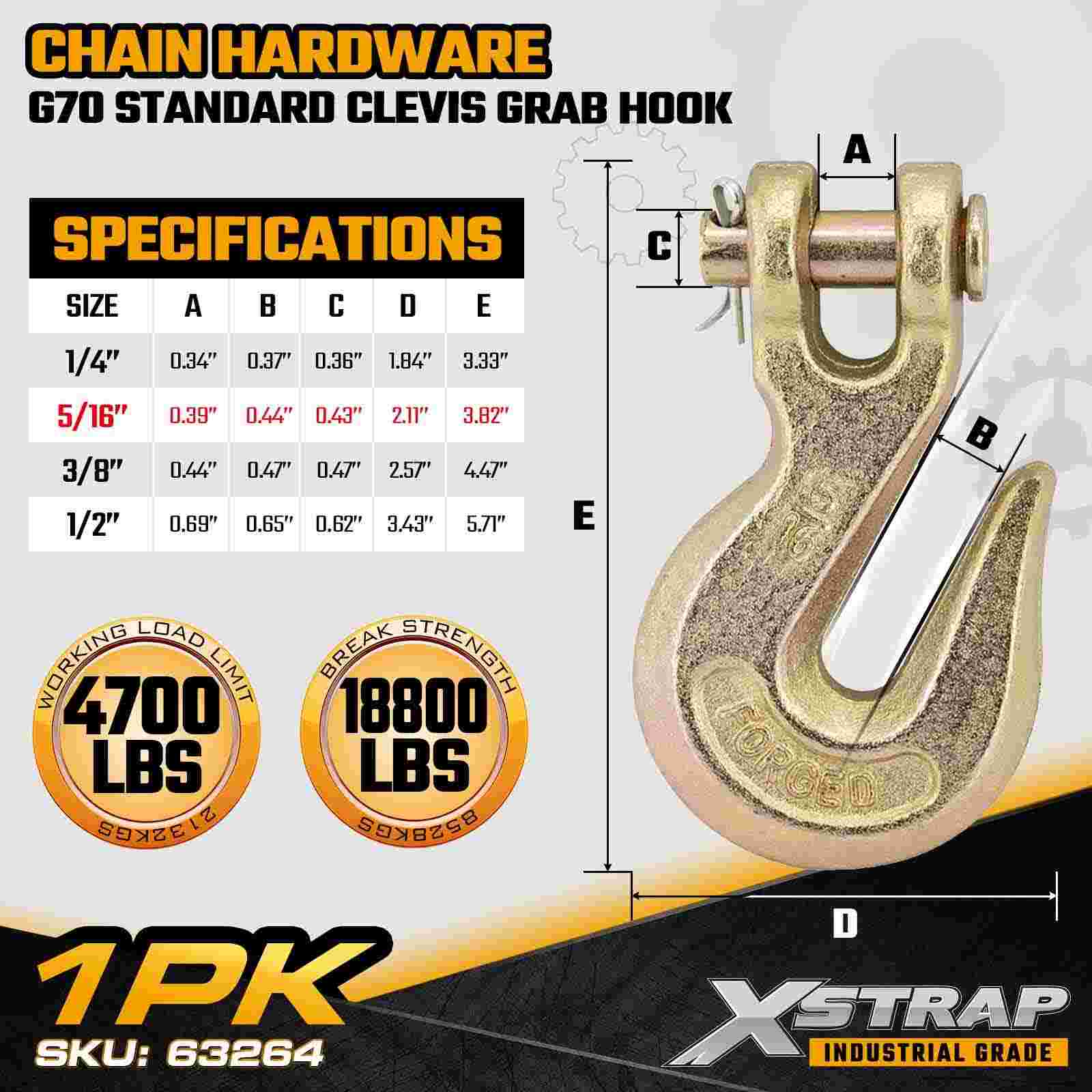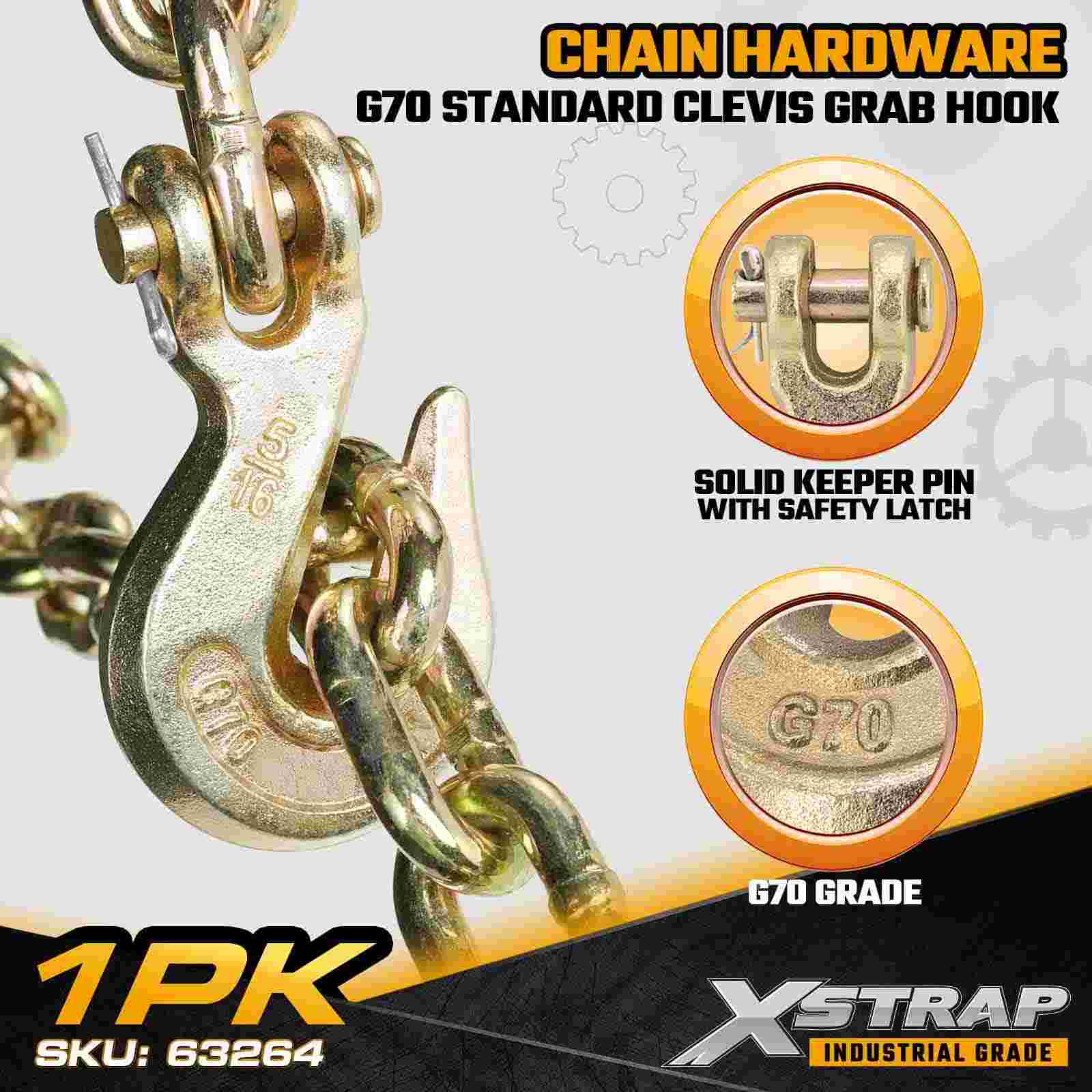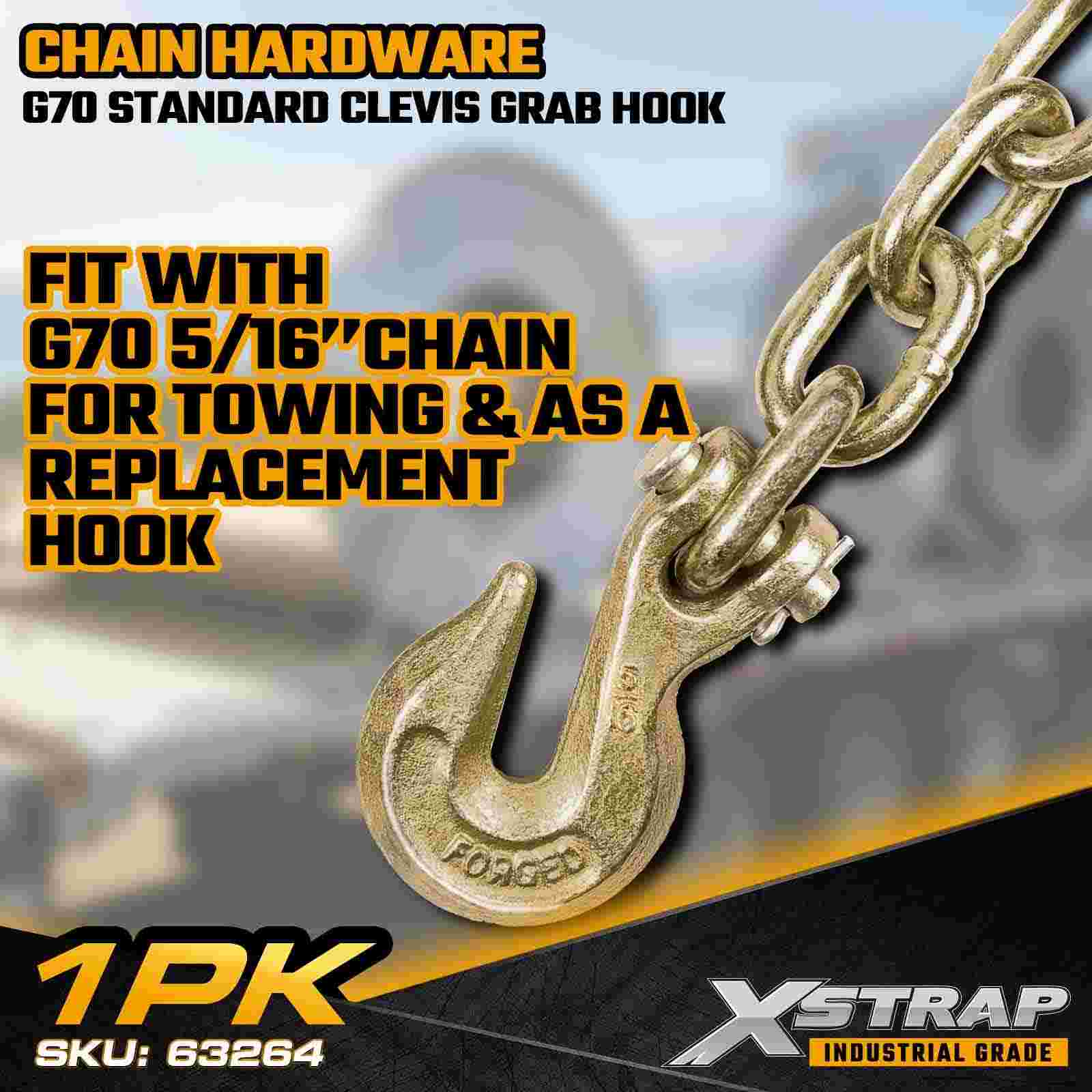The Xstrap 63264 5/16" Standard Clevis Grab Hook is a Grade 70 transport-rated chain component designed for flatbed trailers, towing systems, and industrial load securement. Manufactured from high-strength alloy steel and finished with a corrosion-resistant gold chromate coating, this G70 grab hook provides dependable performance for daily hauling operations. The clevis-style design ensures fast chain engagement and secure load control, making it ideal for professional transport and cargo binding applications.