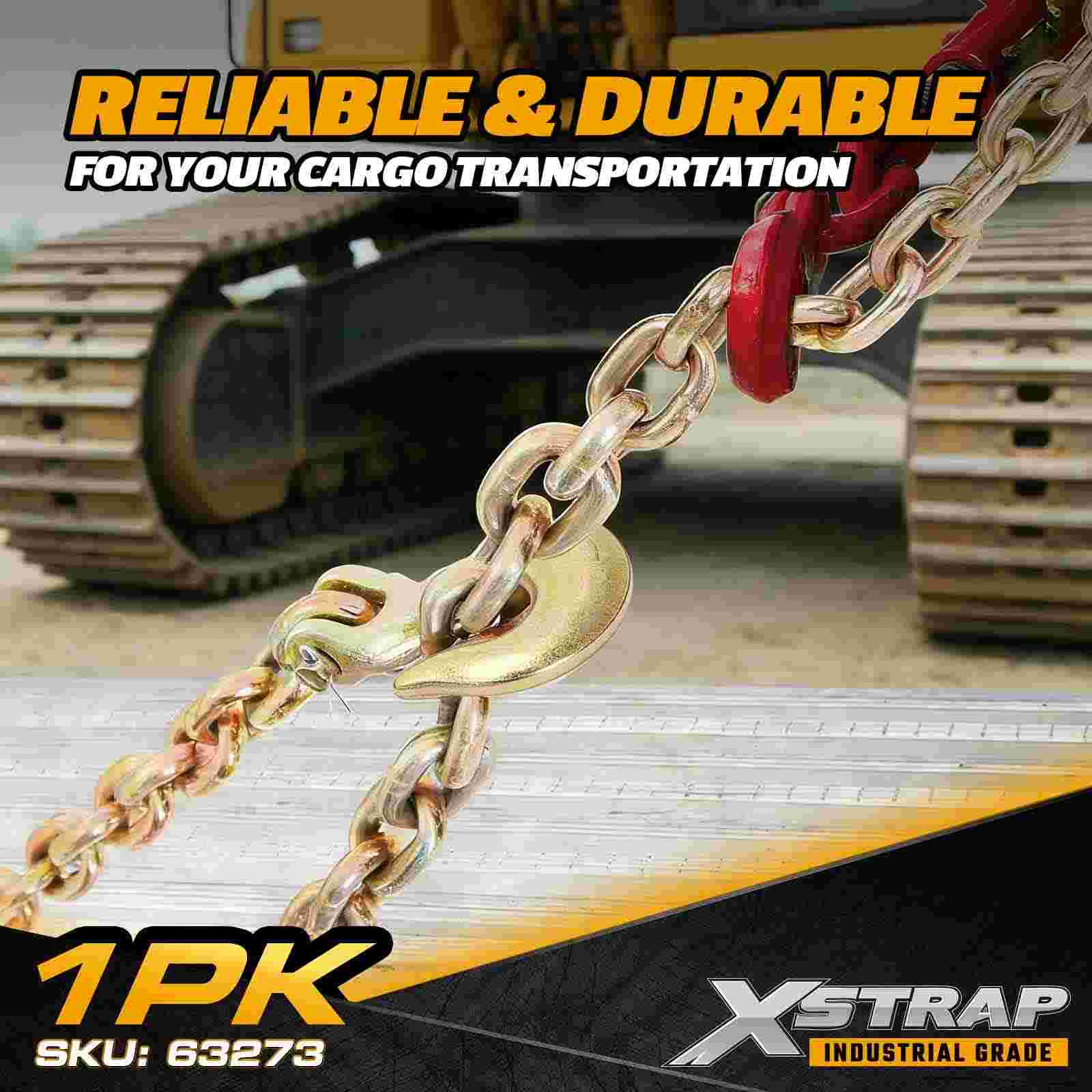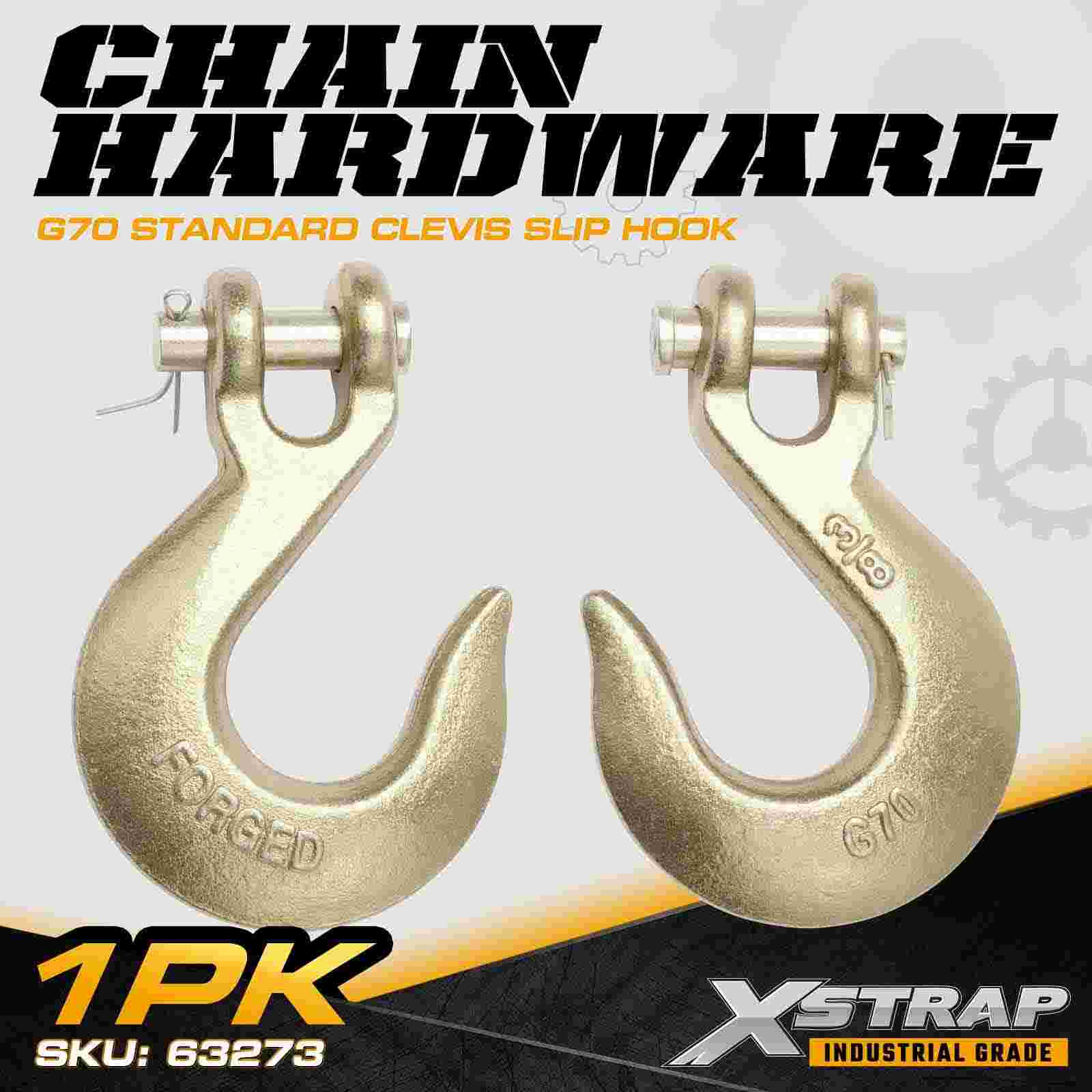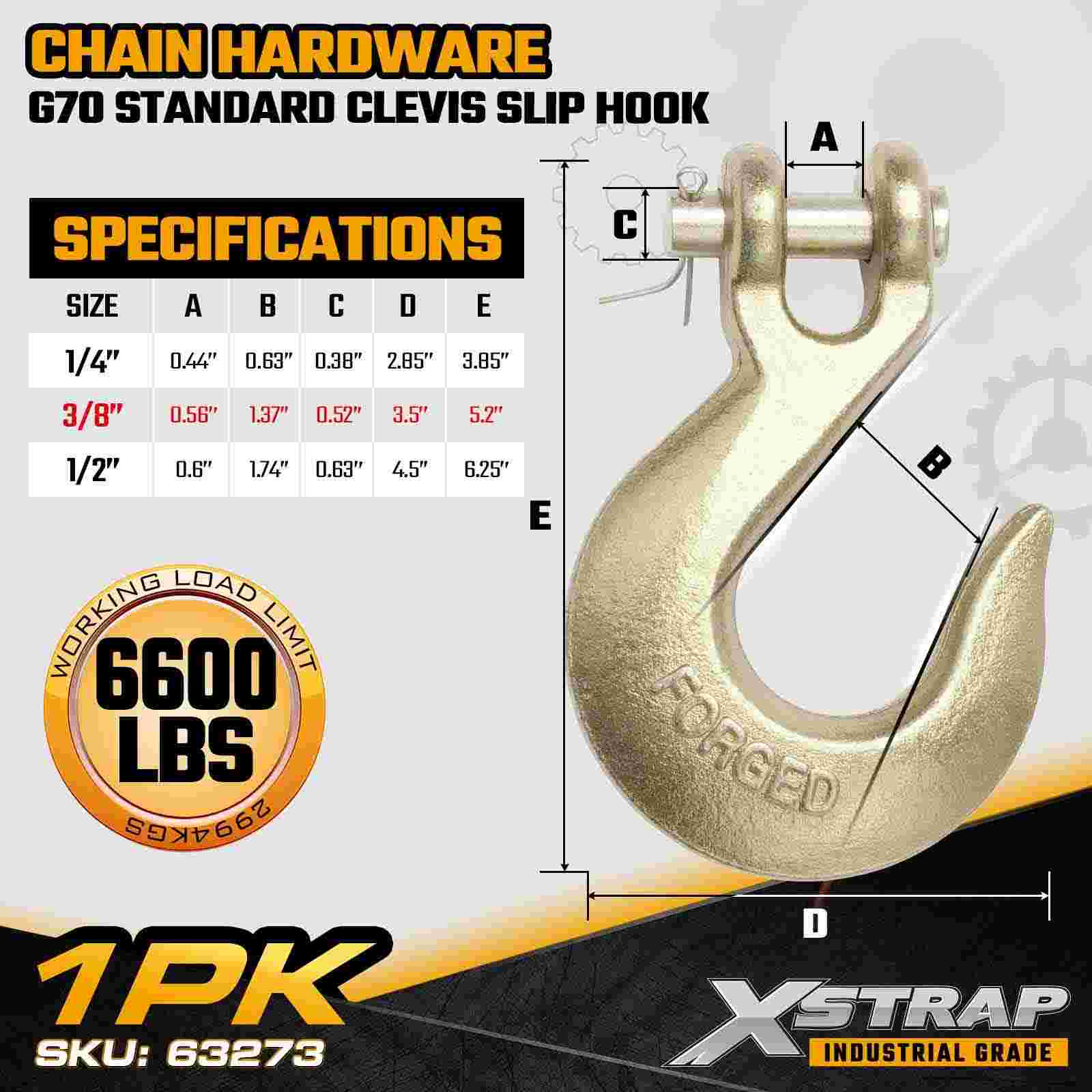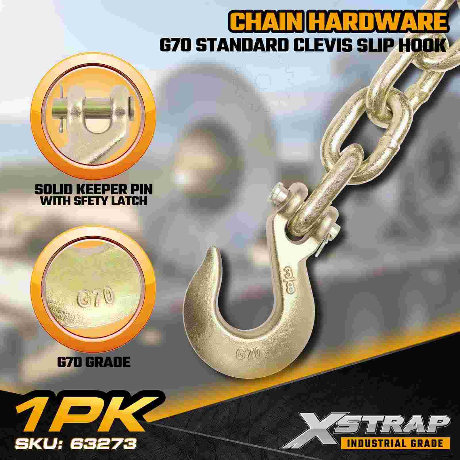 The Xstrap 63273 3/8" Standard Clevis Slip Hook is a Grade 70 transport-rated chain component designed for flatbed trailers, towing systems, and industrial load securement. Built from high-strength alloy steel and finished with a corrosion-resistant gold chromate coating, this G70 slip hook provides reliable performance for heavy-duty hauling. The slip-style hook allows controlled chain movement and is ideal for applications requiring adjustable connection points and flexible load positioning.