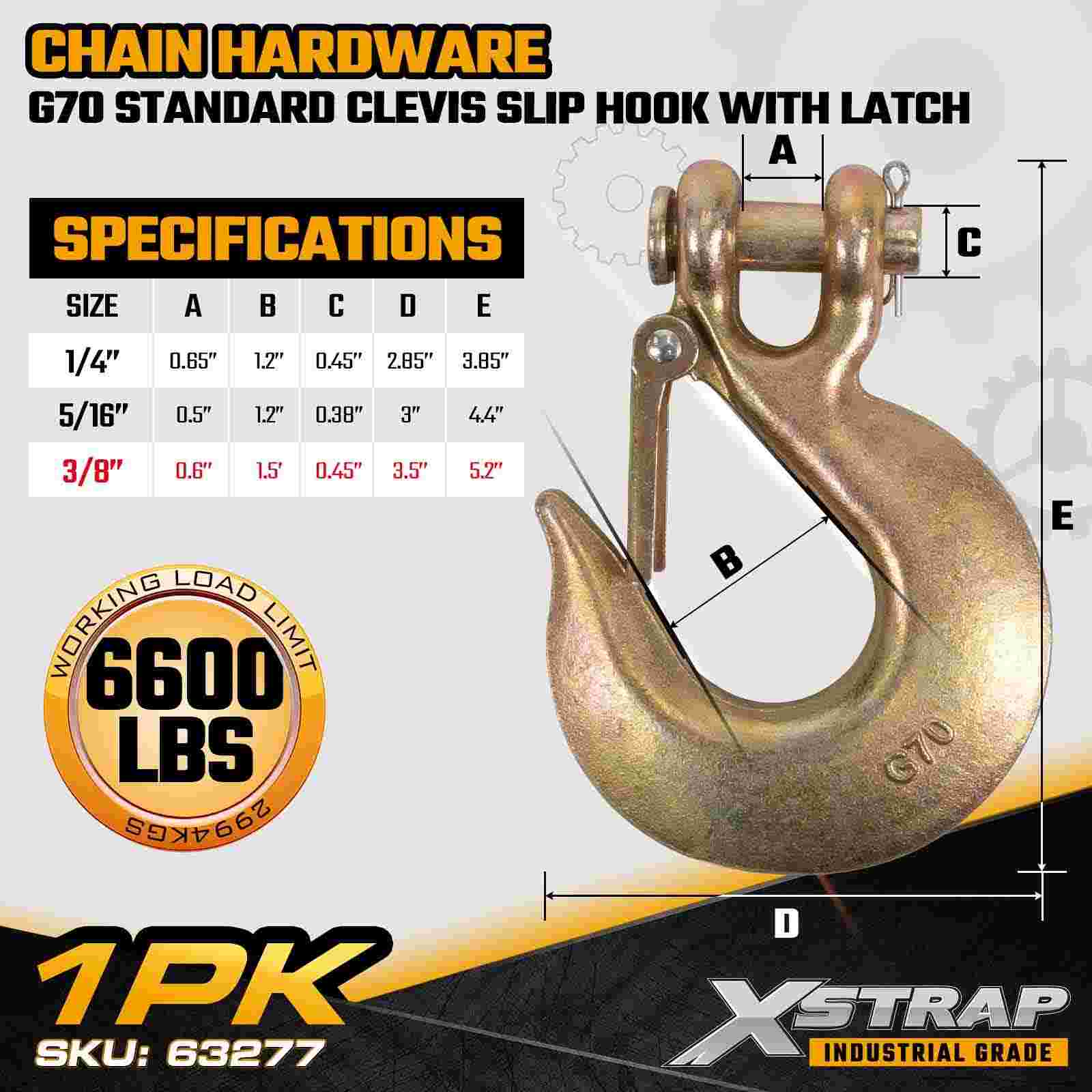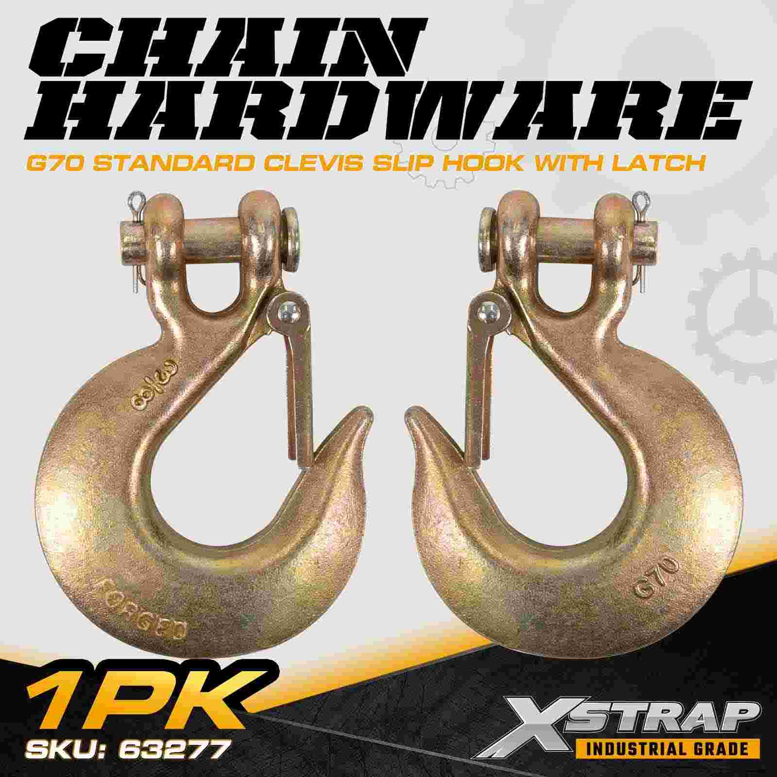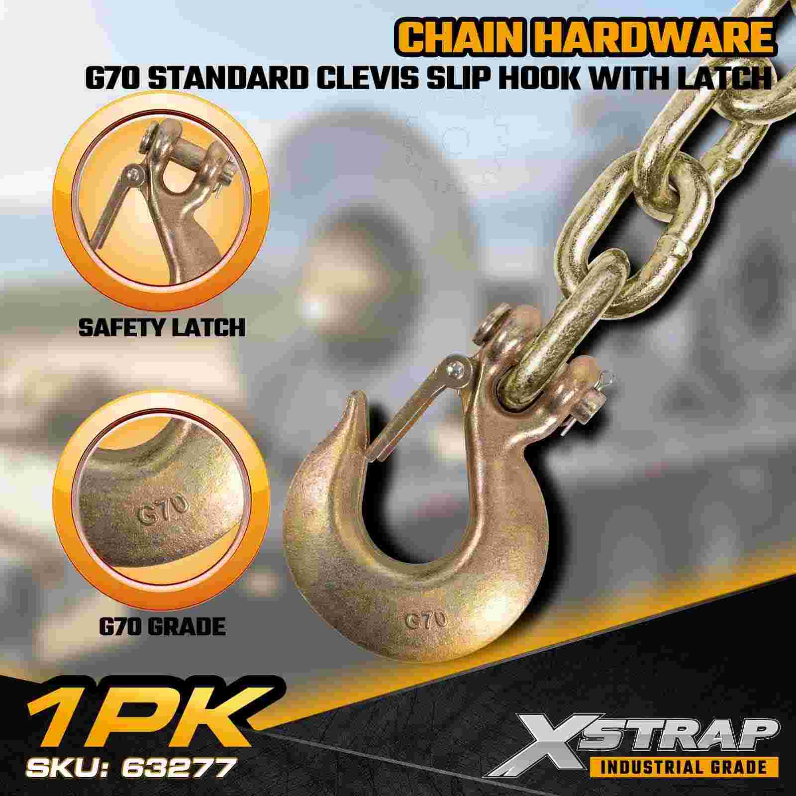 The Xstrap 63277 3/8" Standard Clevis Slip Hook With Latch is a Grade 70 transport-rated chain component engineered for flatbed trailers, towing systems, recovery operations, and industrial cargo securement. Built from high-strength alloy steel and protected with a corrosion-resistant gold chromate finish, this G70 slip hook delivers reliable performance under demanding load conditions. The integrated safety latch enhances chain retention, preventing accidental disengagement and ensuring secure load control during transport.