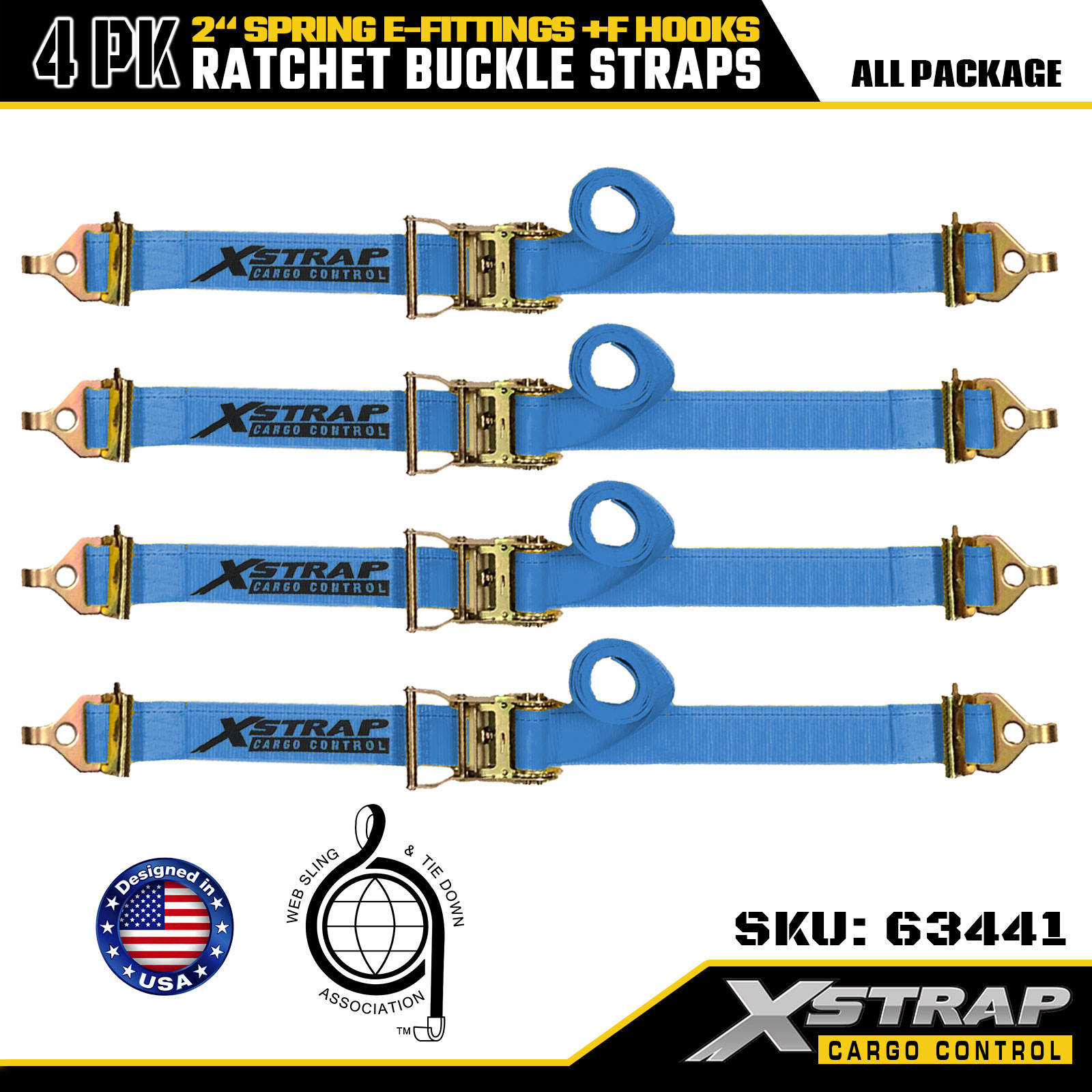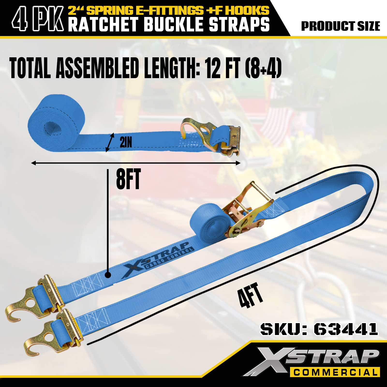 2" x 12' 4PK Ratchet Straps with Spring E-Fittings and F Hooks