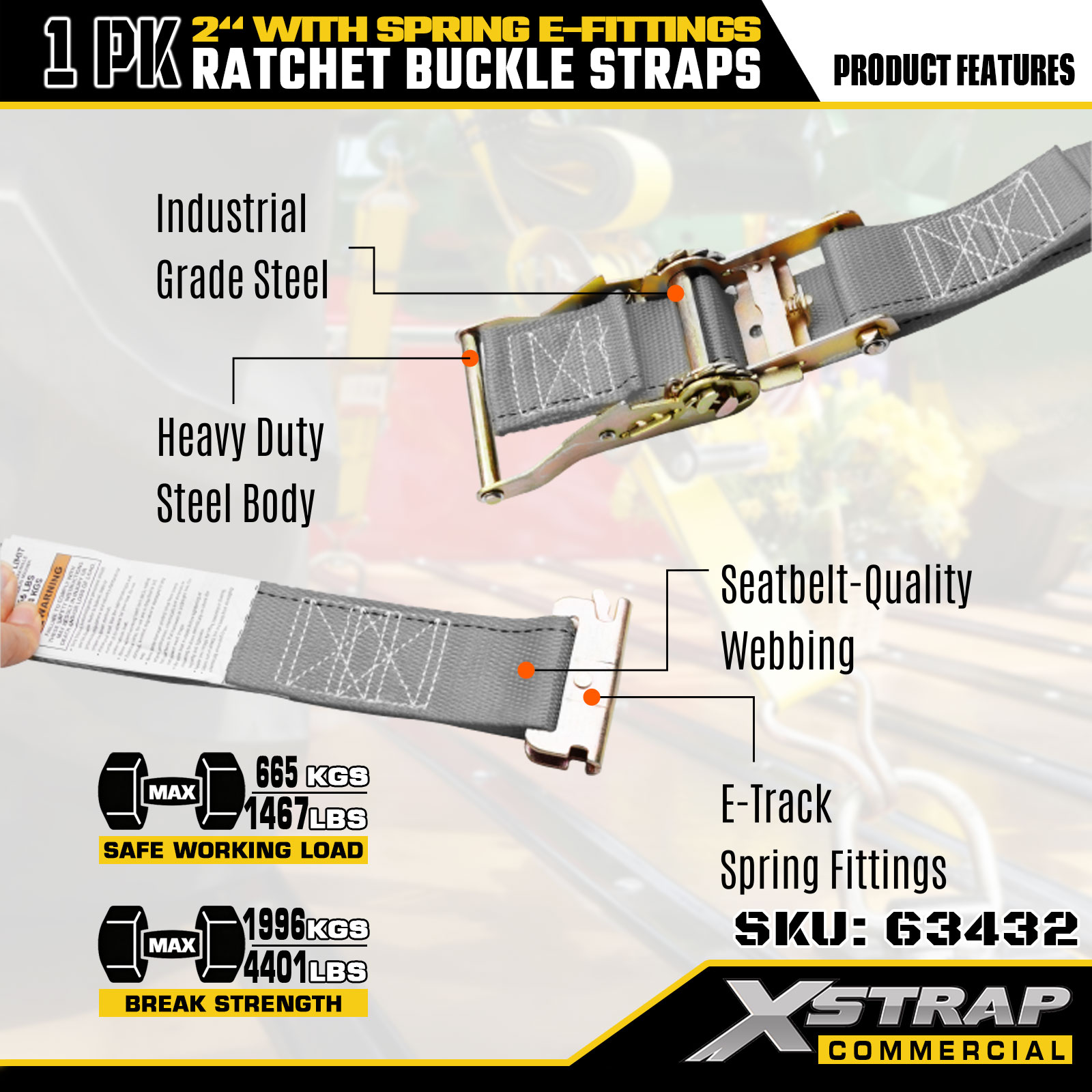Xstrap 1-Pack Ratchet Tie-Down Straps, 2" x 16' Polyester Cargo Securing Straps, 1467 lbs Safe Working Load & 4401 lbs Breaking Strength, with Spring E-Fittings for Truck, Mower, ATVs