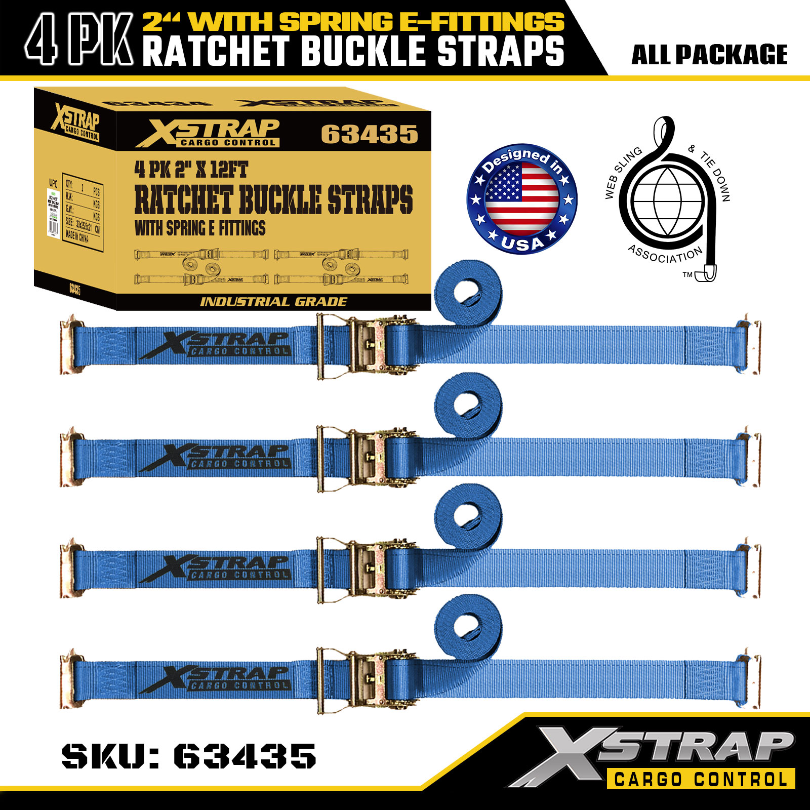 Xstrap 4 Pack Ratchet Tie-Down Straps, 2" x 12' Polyester Cargo Securing Straps with Spring E-Fittings, 1467 lbs Safe Working Load (SWL) & 4401 lbs Breaking Strength, for Trucks, Mowers, ATVs