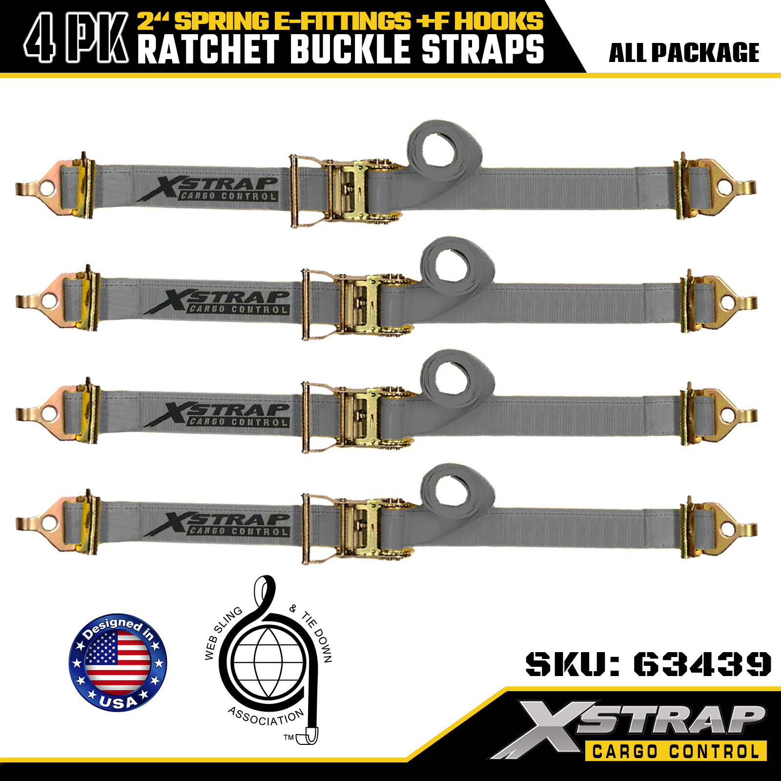 Xstrap 4 Pack 2" x 16' Ratchet Tie-Down Straps - Grey Polyester with Spring E-Fittings & F Hooks, 733 lbs SWL for Moving, Truck & General Cargo Transport