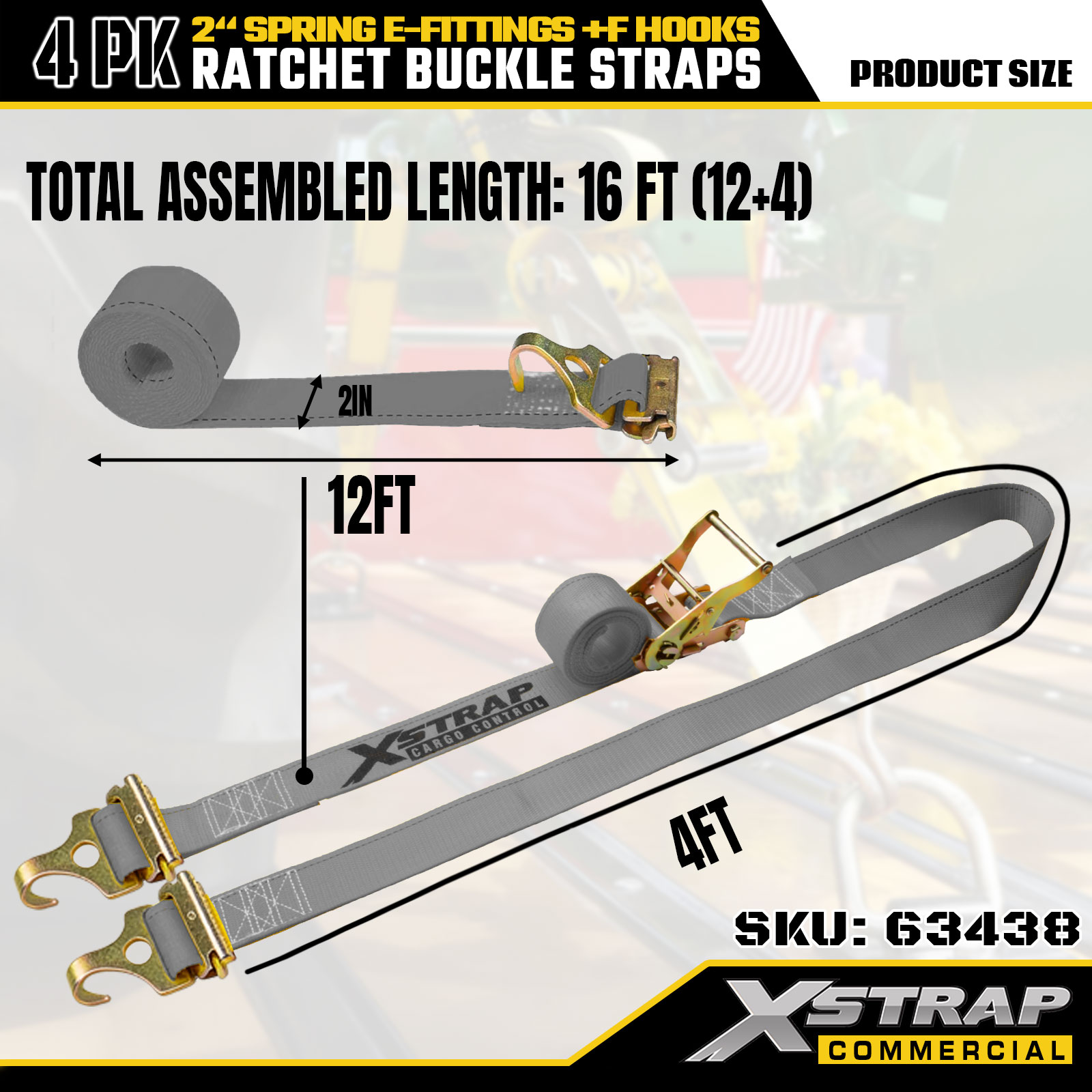 2" x 16' 4PK Ratchet Straps with Spring E-Fittings and F Hooks