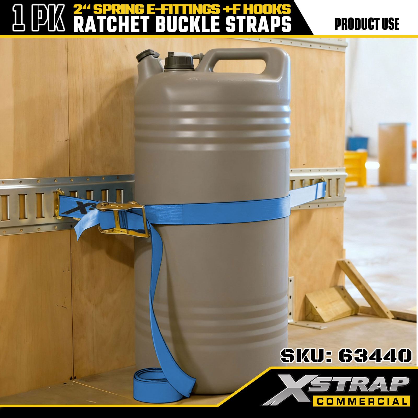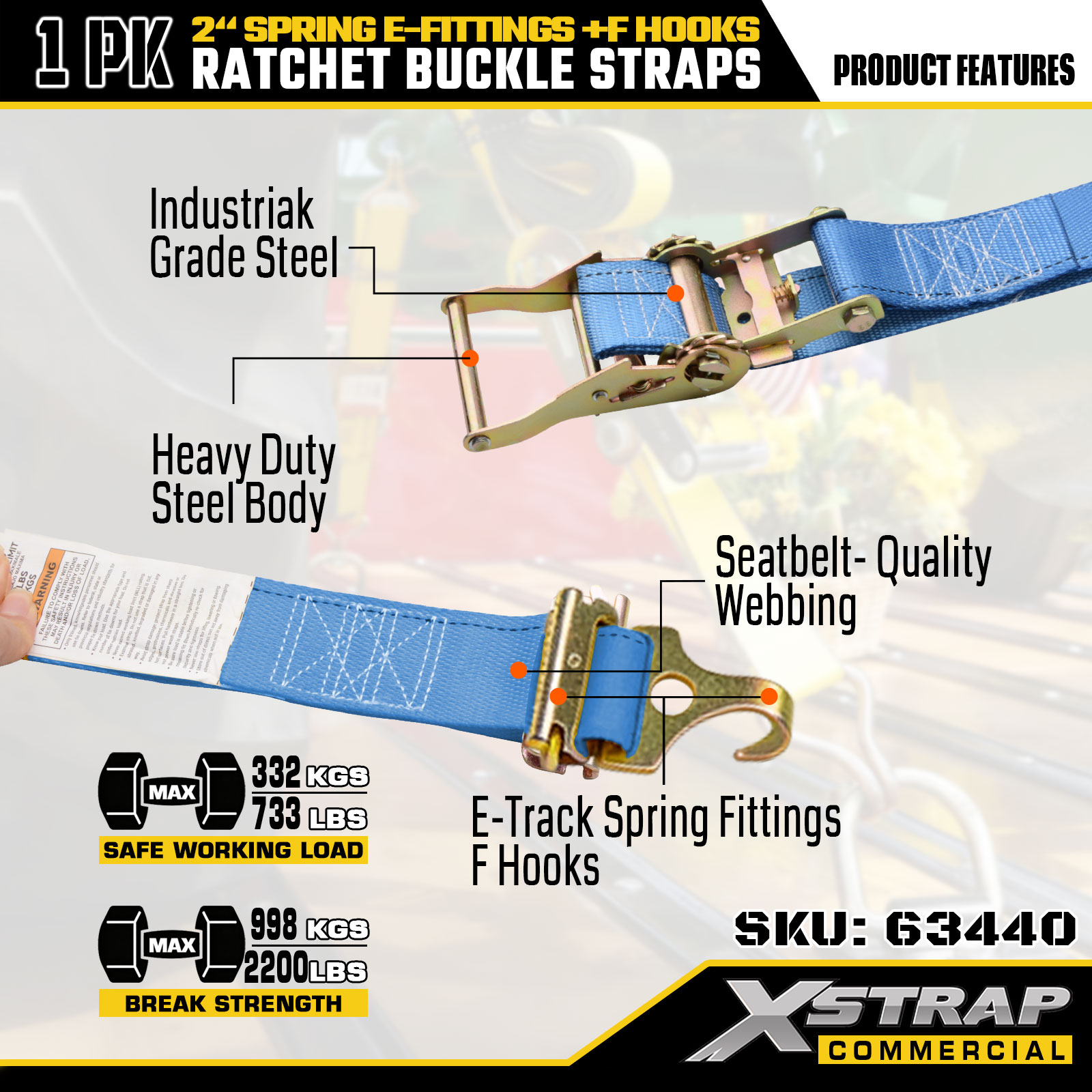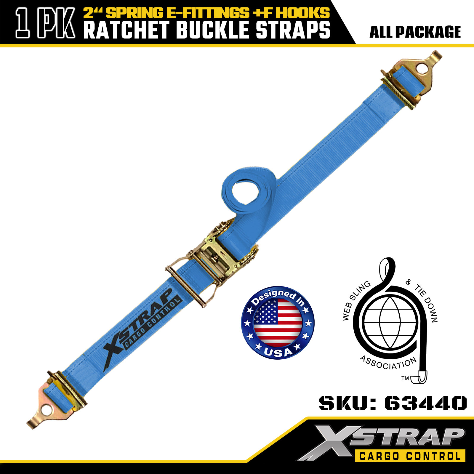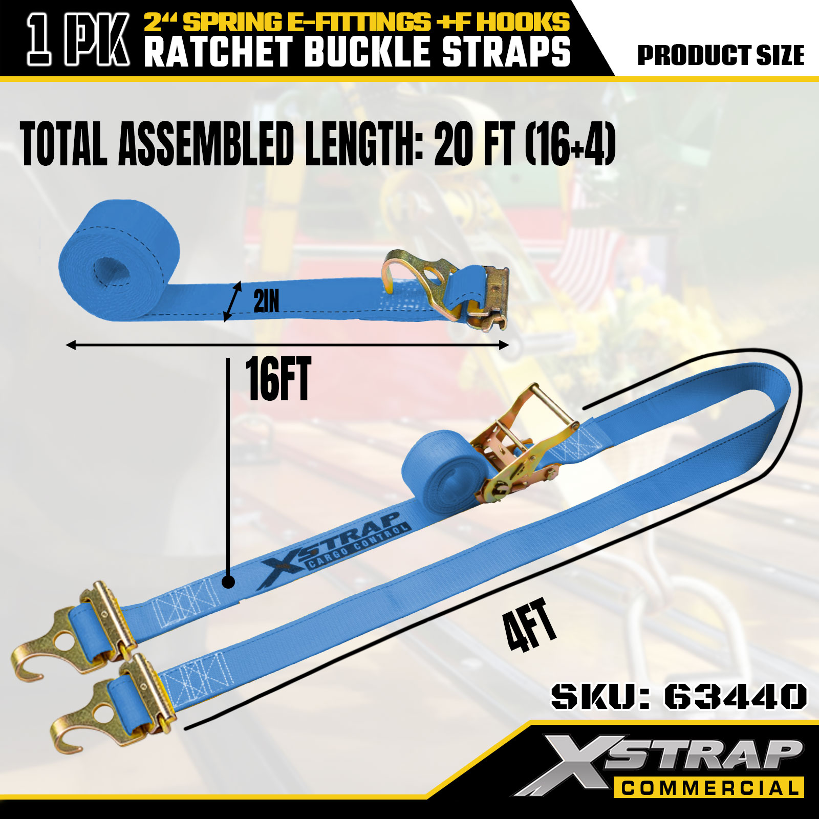 Xstrap 63440 Heavy-Duty Ratchet Strap 2" x 20' (1PK) - Blue Webbing, Spring E-Fittings & F Hooks, 733 lbs SWL for Moving, Cargo Transport & Truck Use
