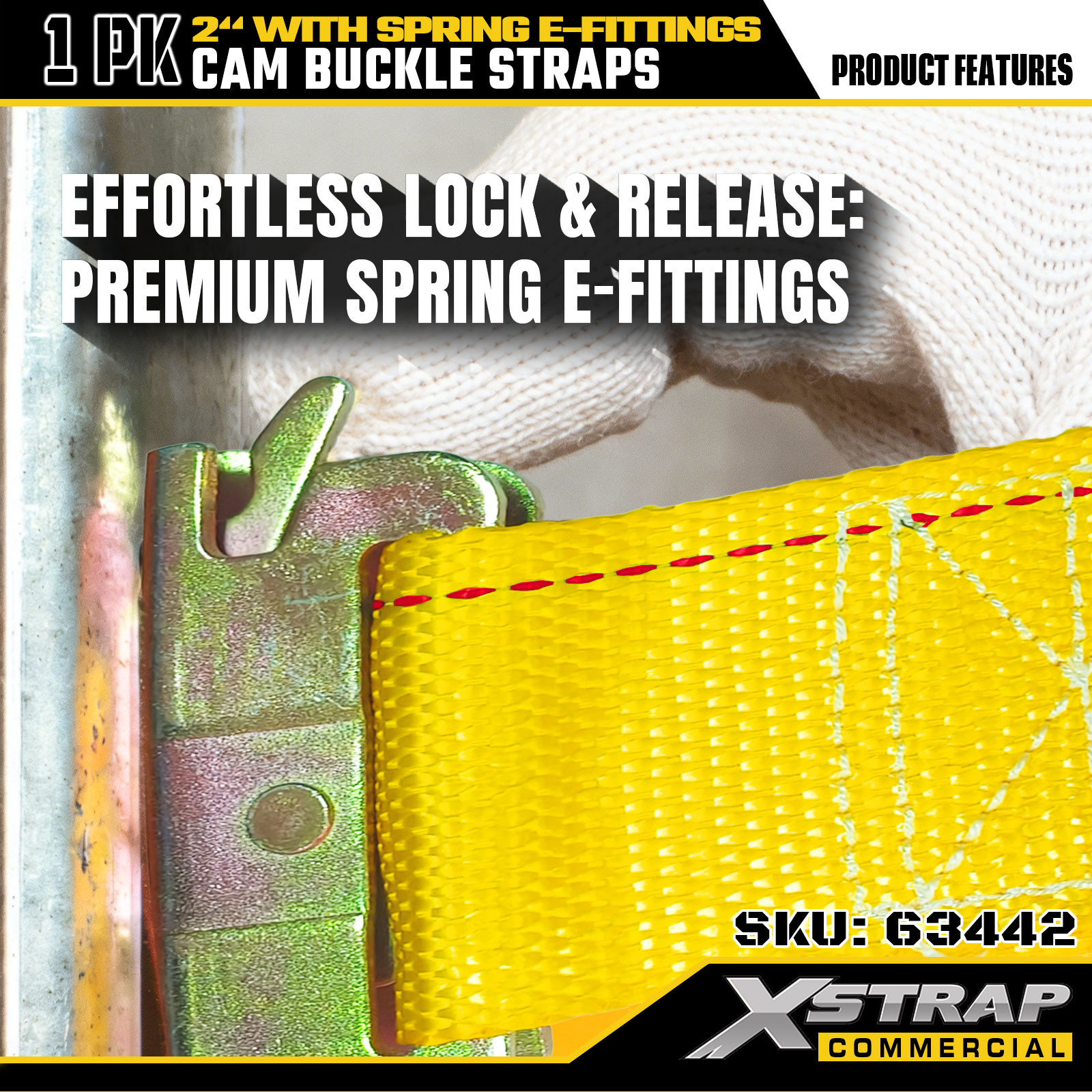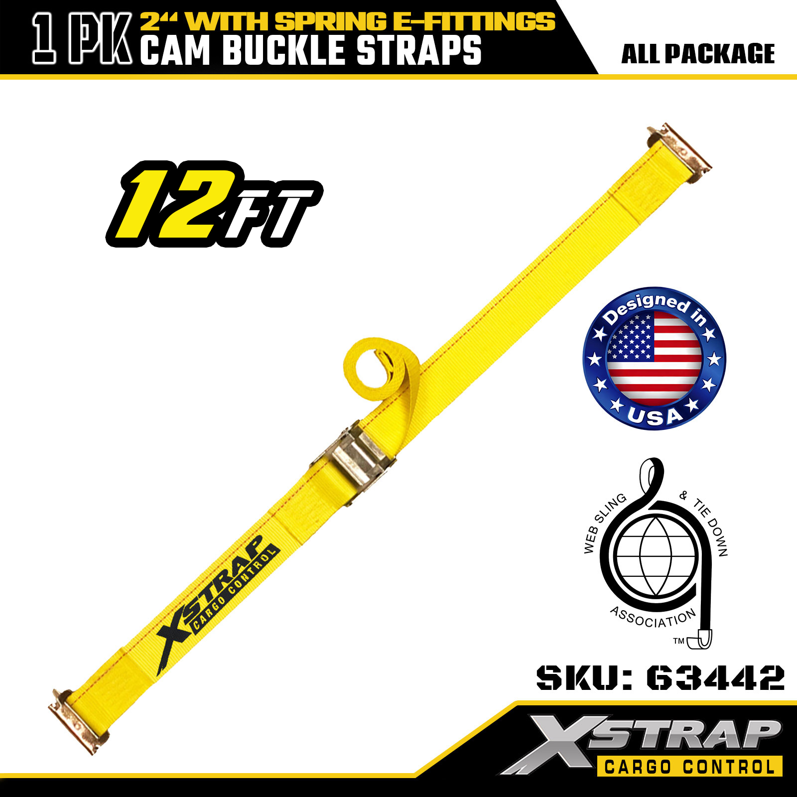 Xstrap 63442 Heavy-Duty Cam Buckle Strap 2" x 12' (1PK) - Yellow Polyester with Spring E-Fittings, 1000 lbs SWL & 453 lbs Breaking Strength for Moving, Cargo Control & Transport