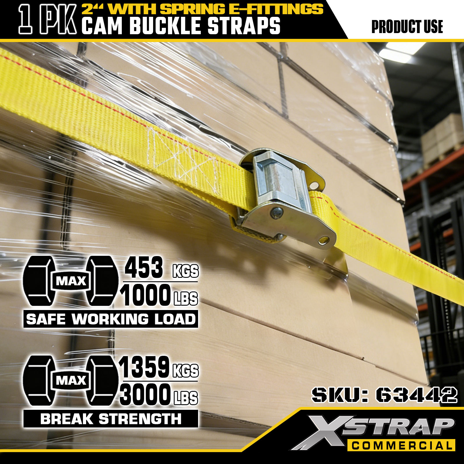- Heavy-Duty Cargo Restraint - 2" x 12' 1PK cam buckle strap with 1000 lbs SWL & 453 lbs breaking strength, securing general cargo during moving/transit. Spring E-fittings enable stable E-Track attachment, preventing load shifts.